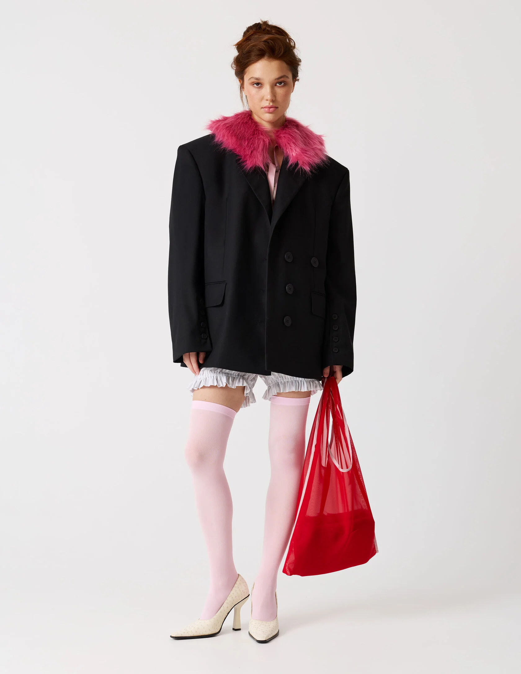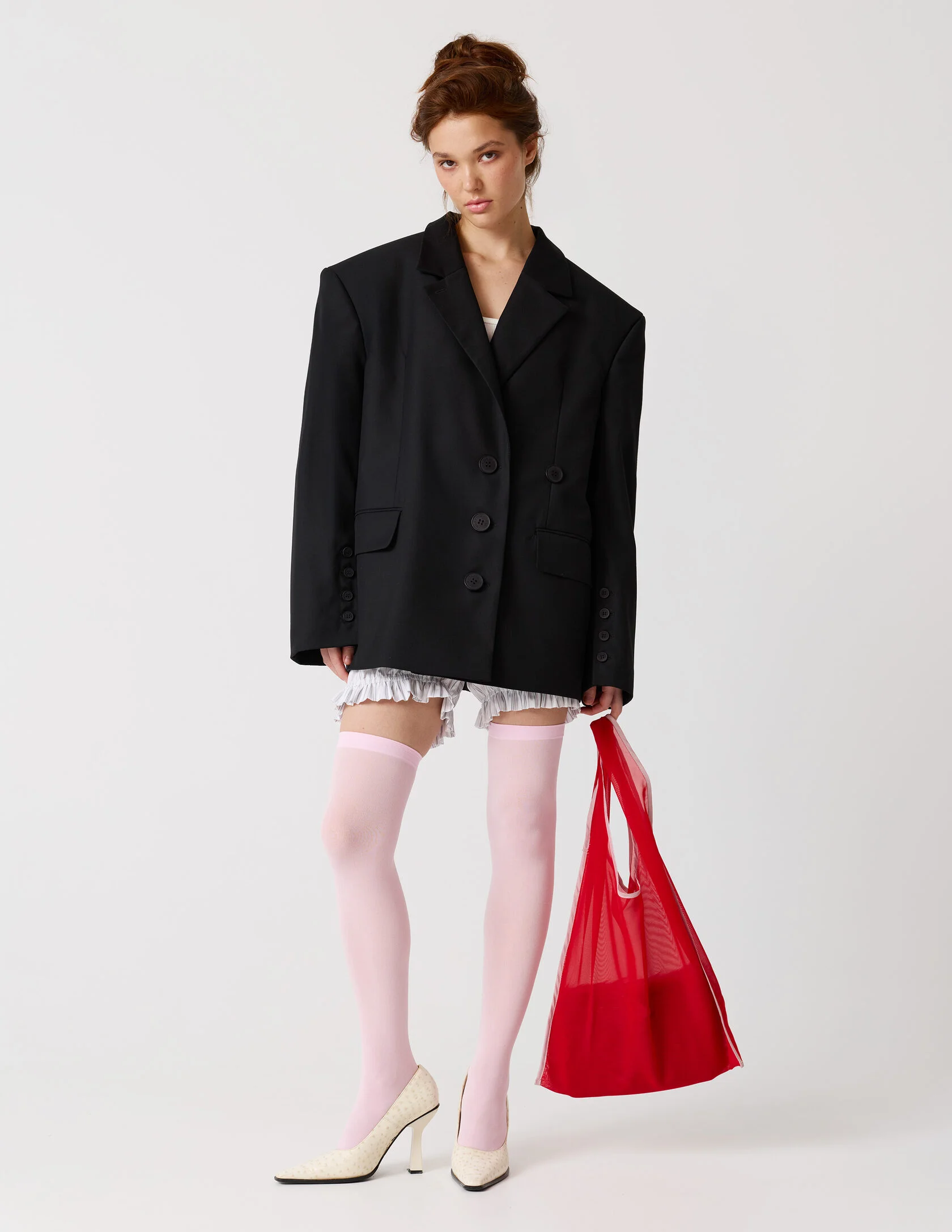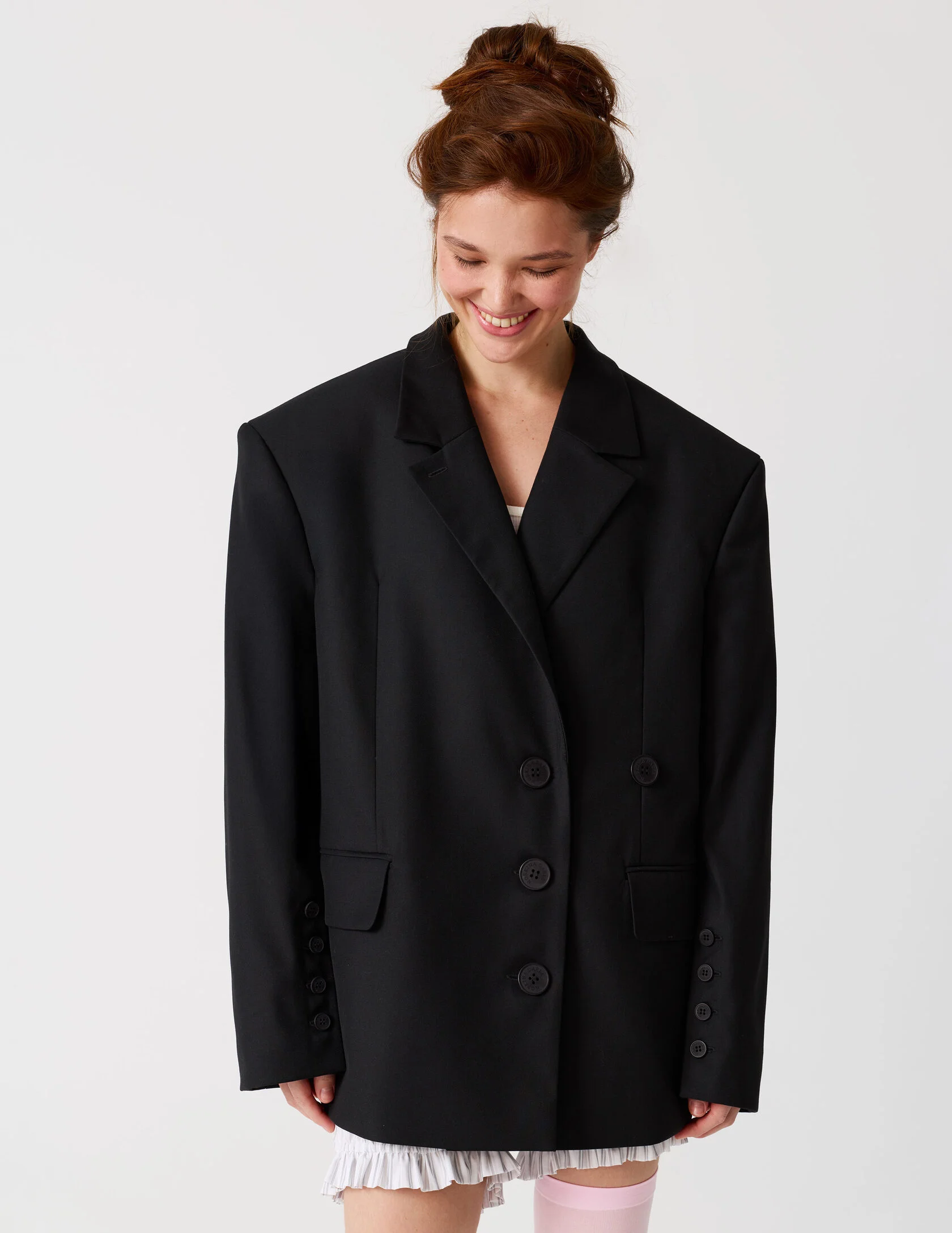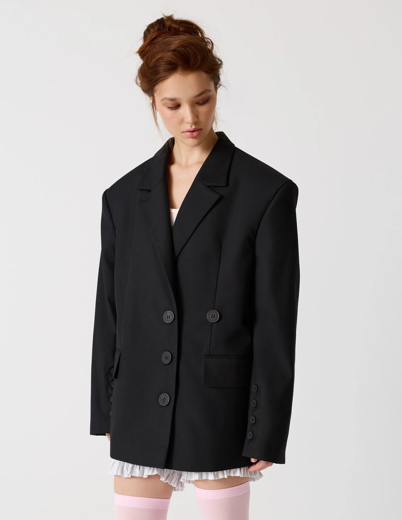 Пиджак мужского кроя с возможностью приталивания силуэта. Сразу две роли и обе главные. «Сильная женщина» в пиджаке с мужского плеча и «Хрупкая девушка» в приталенном жакете с ассиметричной застежкой. Продуманная конструкция пиджака позволяет менять посадку — от свободного оверсайз до более собранного силуэта. Для приталивания силуэта используются дополнительные пуговицы. Акцентная линия плеча, выразительная шлица и возможность варьировать посадку делают его универсальной основой гардероба.