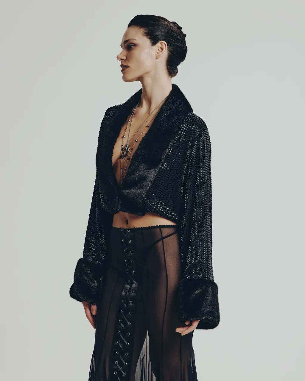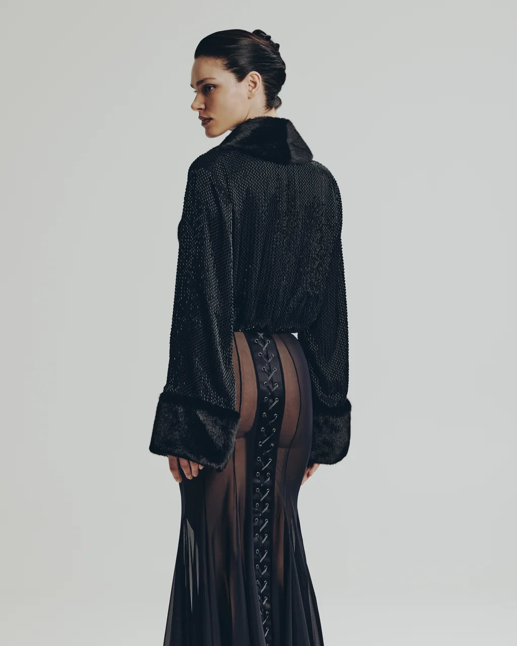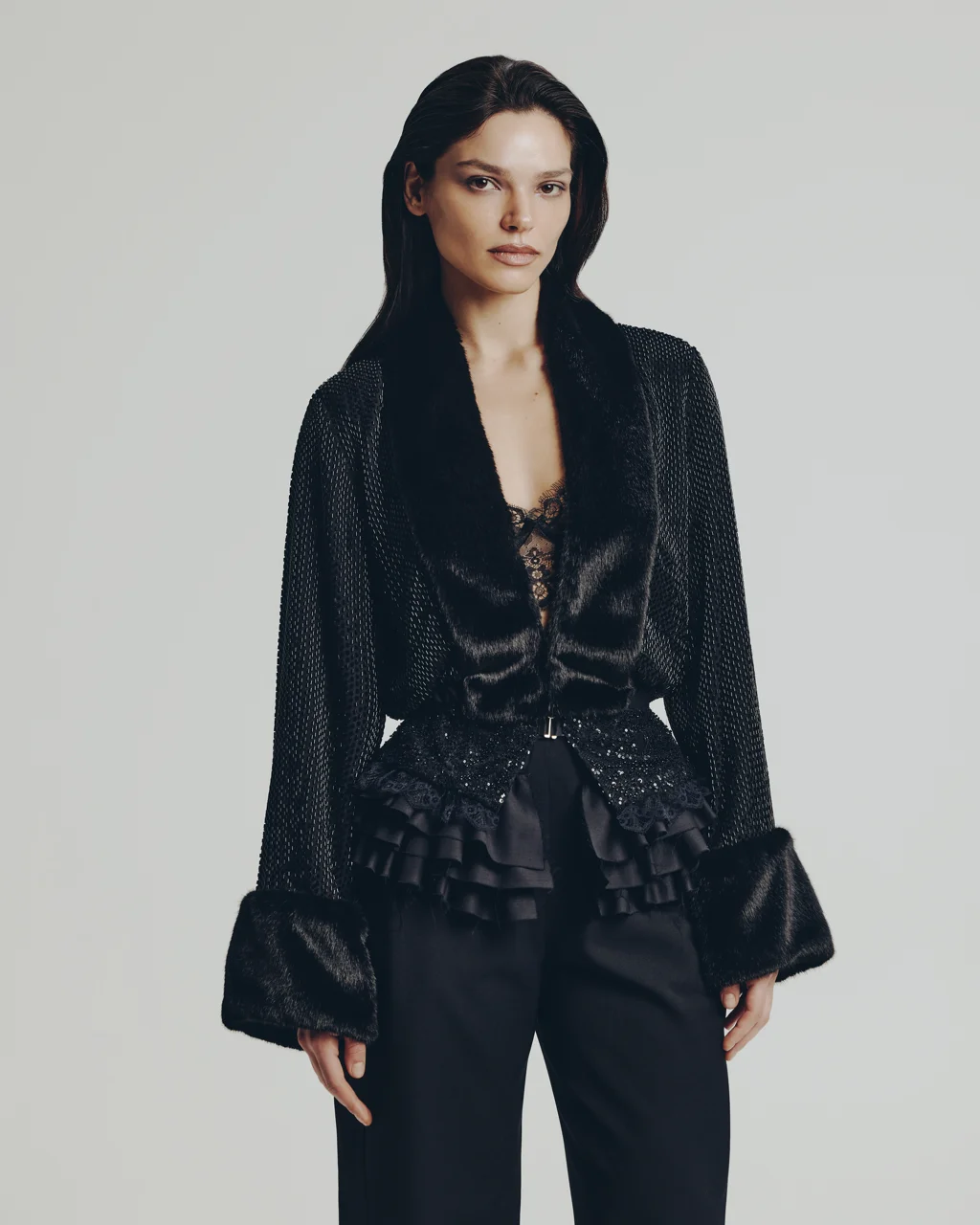 Пиджак выполнен из шелка расшитого стеклярусом, воротник - из премиального эко-меха с глянцевым отливом