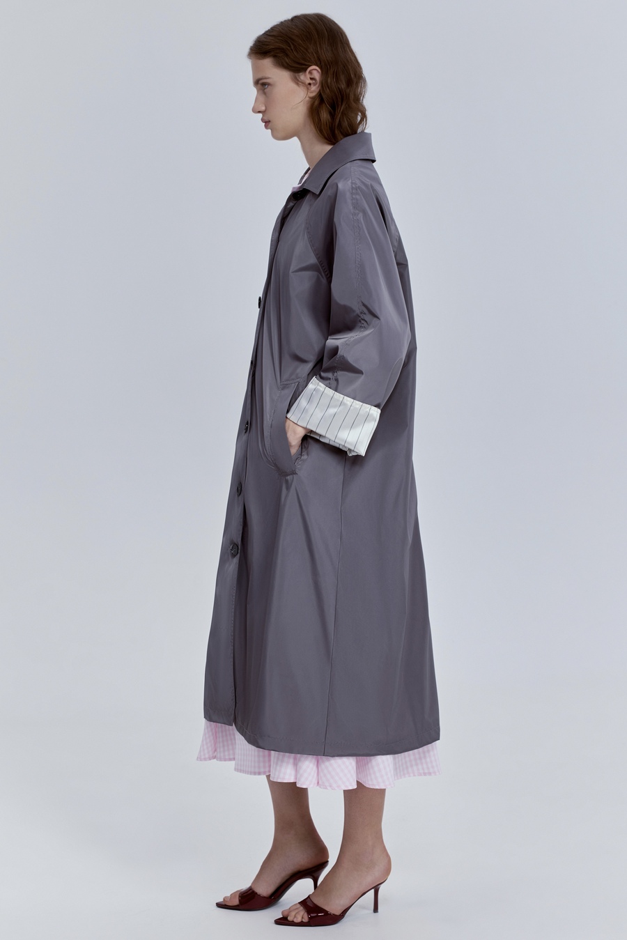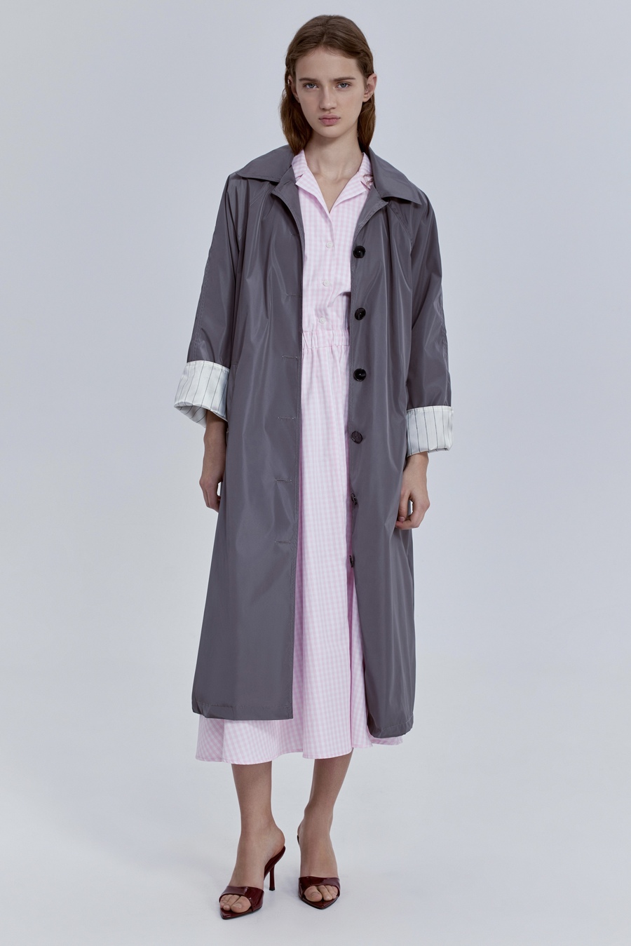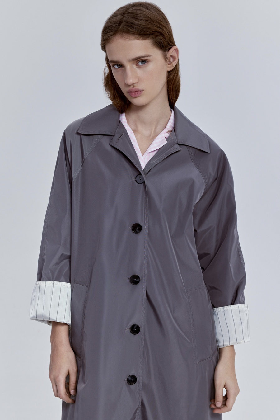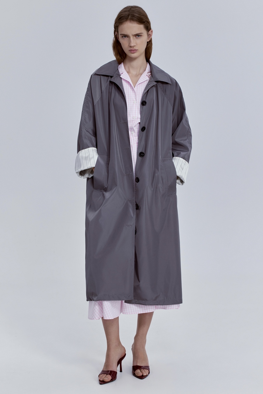 Серый плащ из нейлона — лаконичная вещь для городского ритма. Лёгкая технологичная ткань защищает от ветра и переменчивой погоды, а сдержанный оттенок делает модель универсальной для любого образа. Минималистичный крой и современная фактура создают ощущение продуманной, спокойной элегантности.