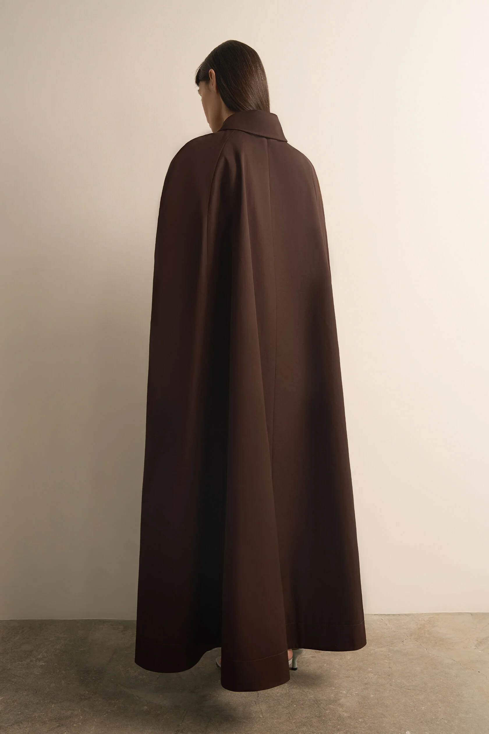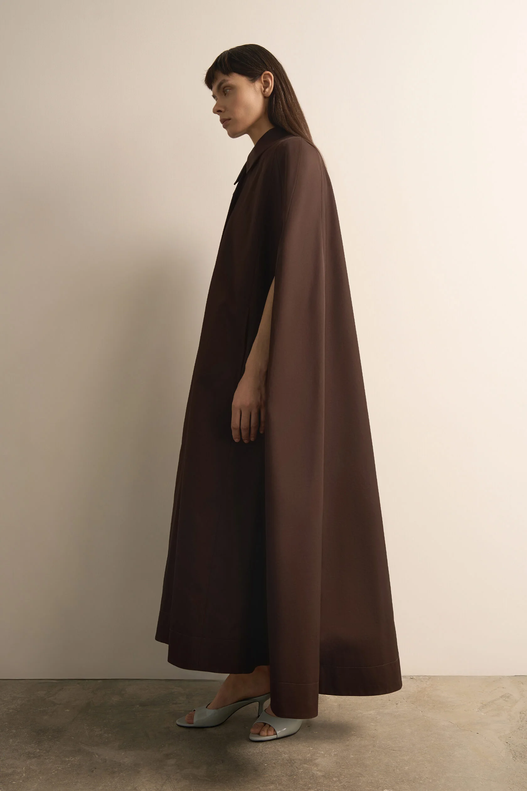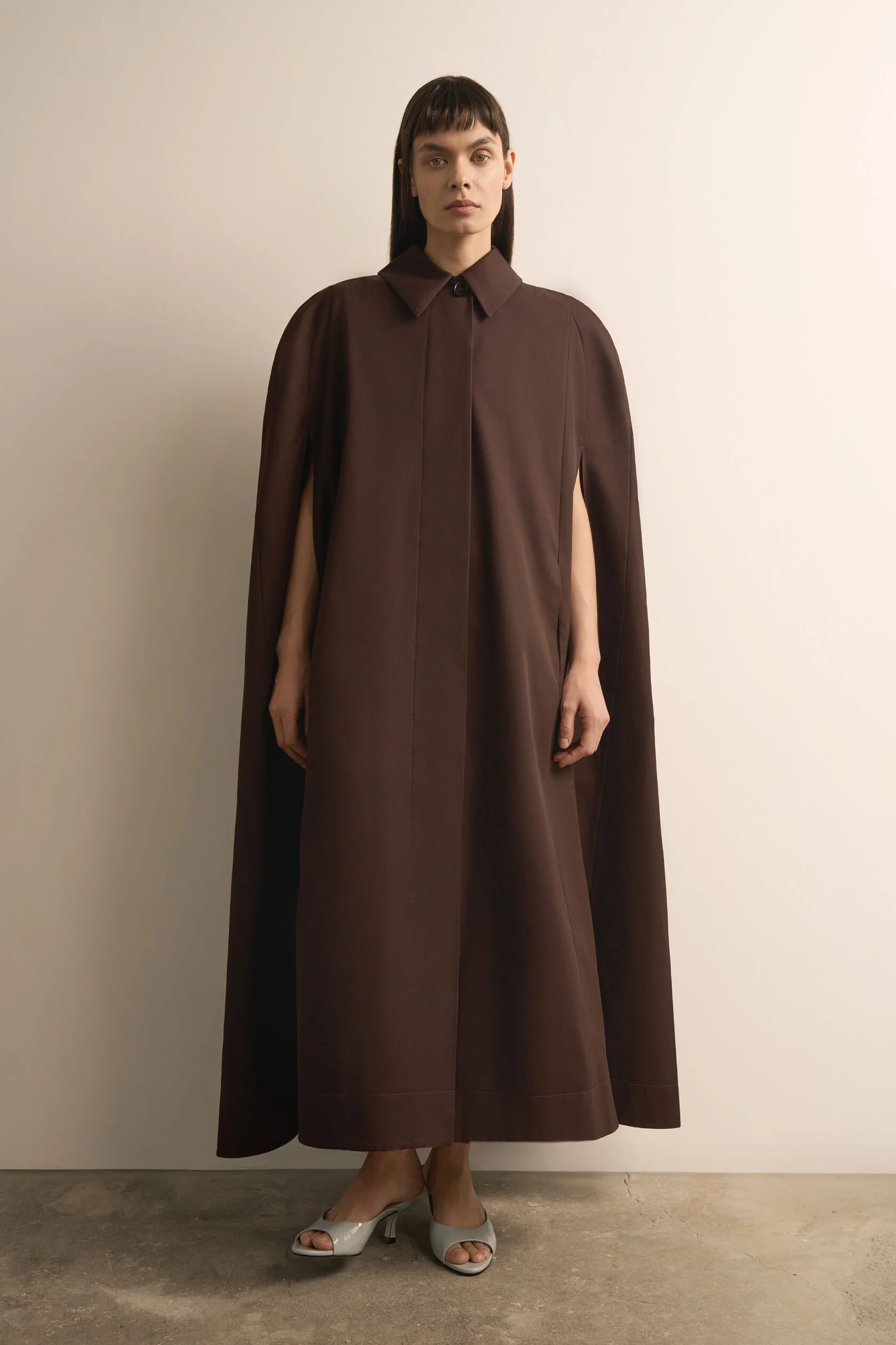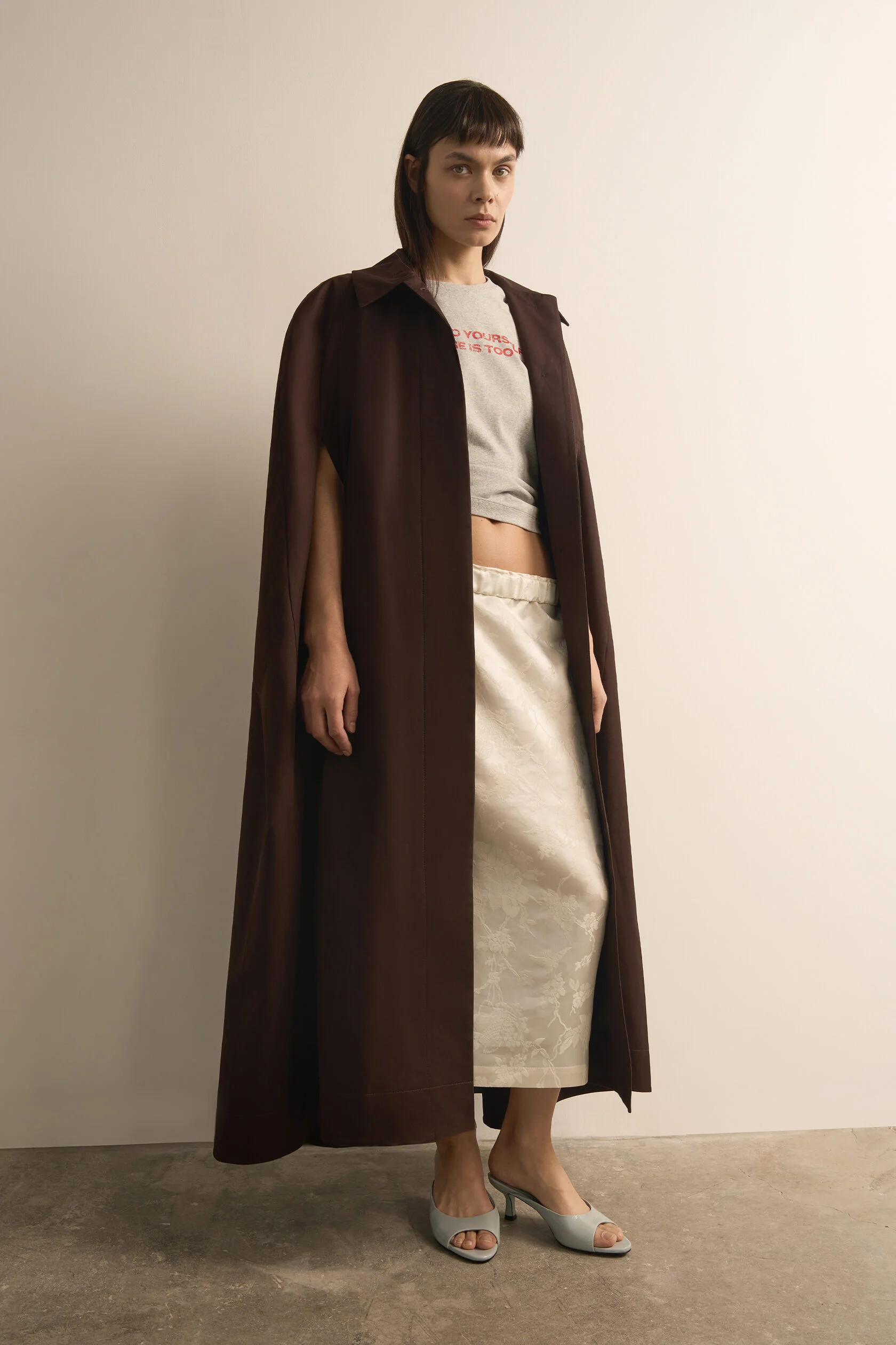 Вещь, которая врезается в память после первого знакомства. Запоминающейся ее делают гротескная длина в пол и скульптурные складки по всему объему — в этом есть своя театральная красота. Глубокие открытые прорези по бокам добавляют плащу приставку «кейп» — при желании оголенные руки можно спрятать под одеждой, и тогда кейп превратится в пончо. Тренч застегивается на пуговицы, есть два функциональных кармана.