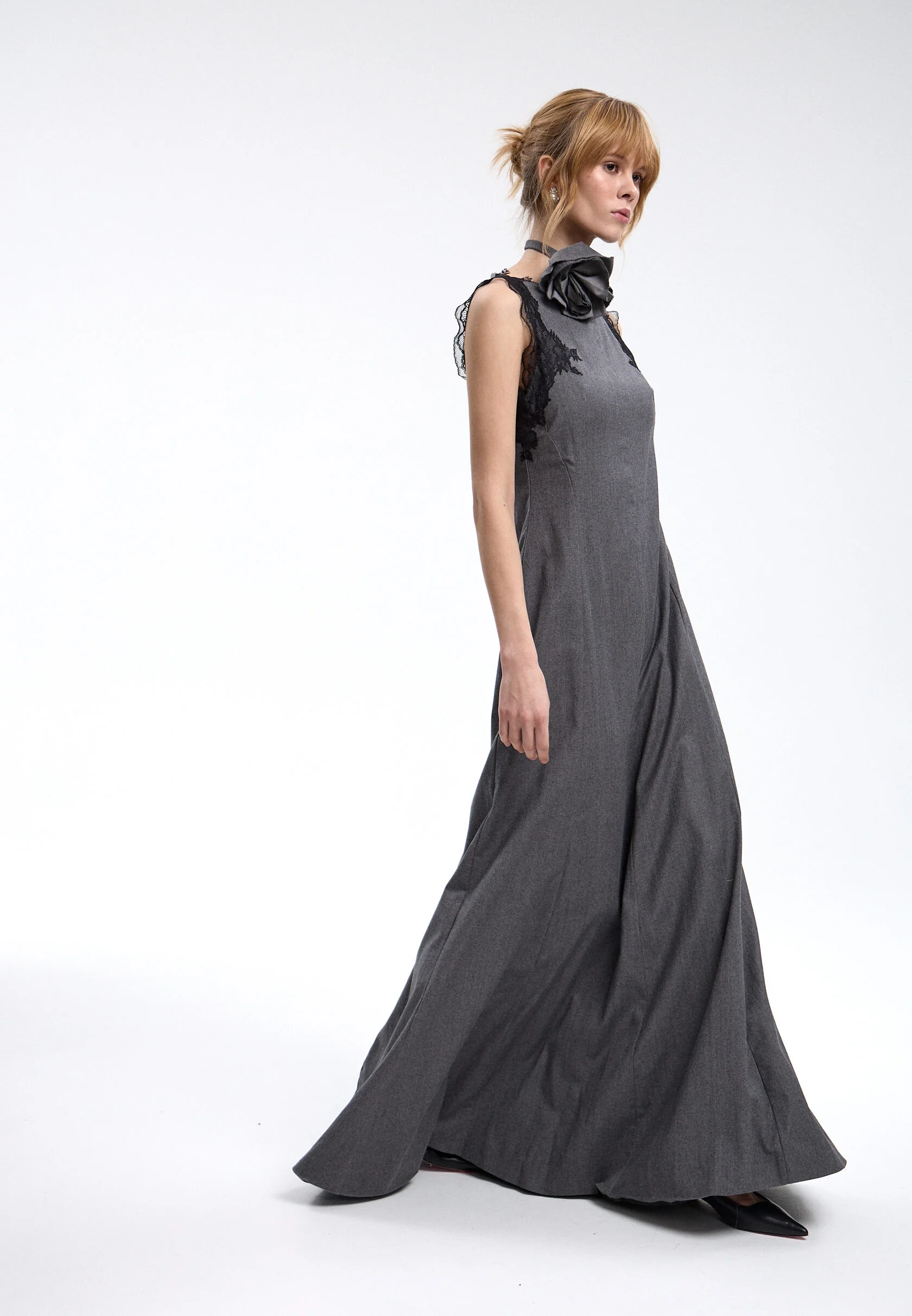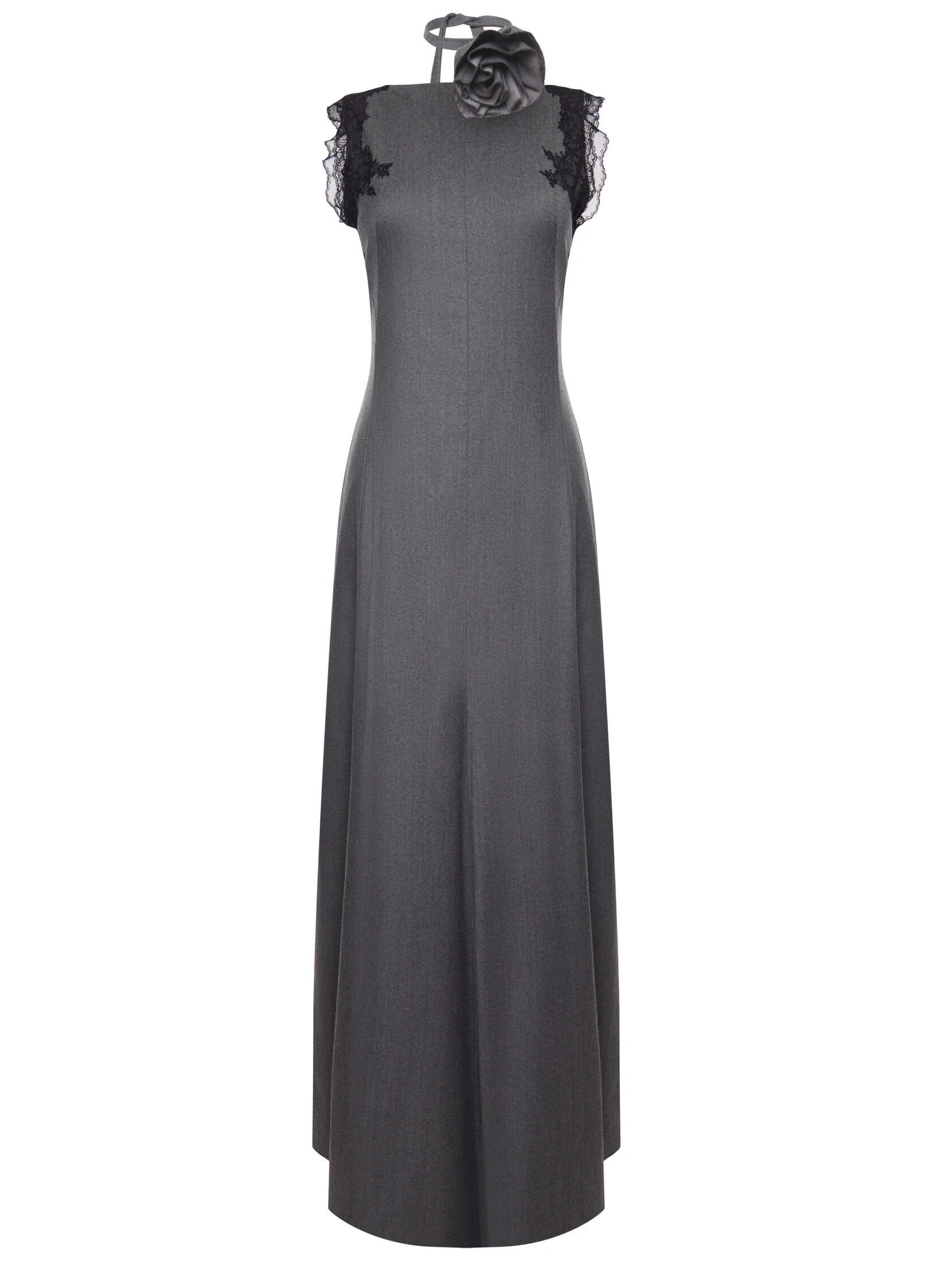Платье длинное без рукавов с вырезом "лодочка" расклешенное с изысканной брошью-розой ручной работы на пояске, которую можно надеть как в качестве чокера на шею, так и на пояс или руку. Платье выполнено из серой итальянской шерсти с кружевами черного цвета по пройме.