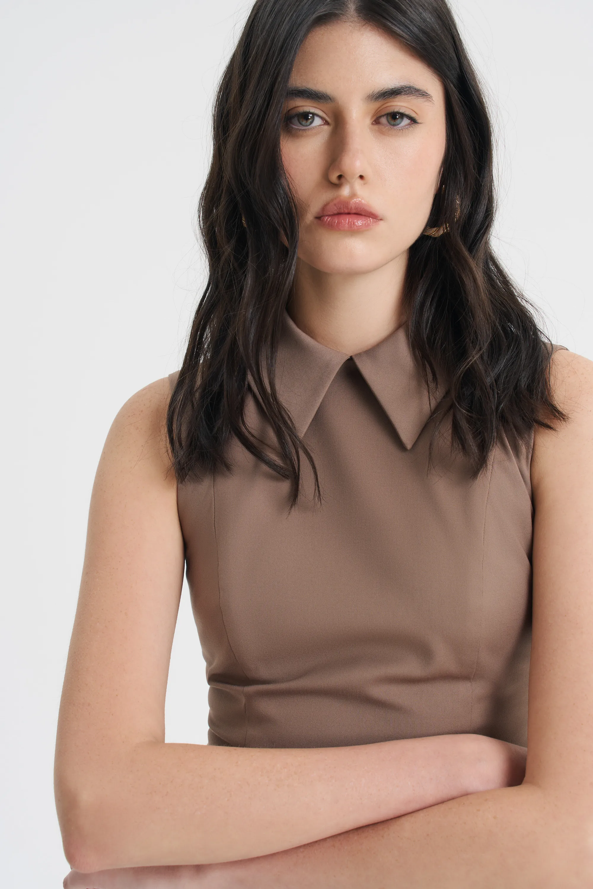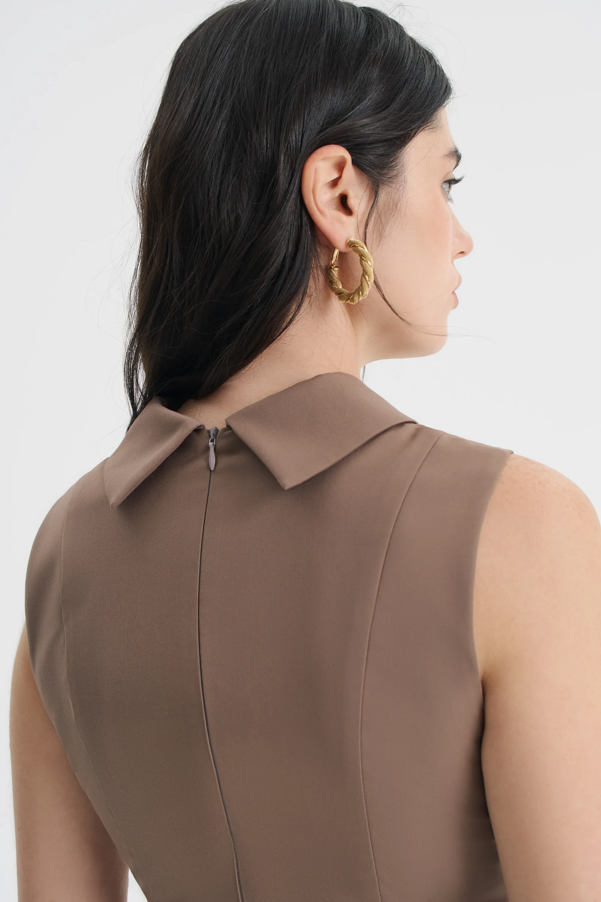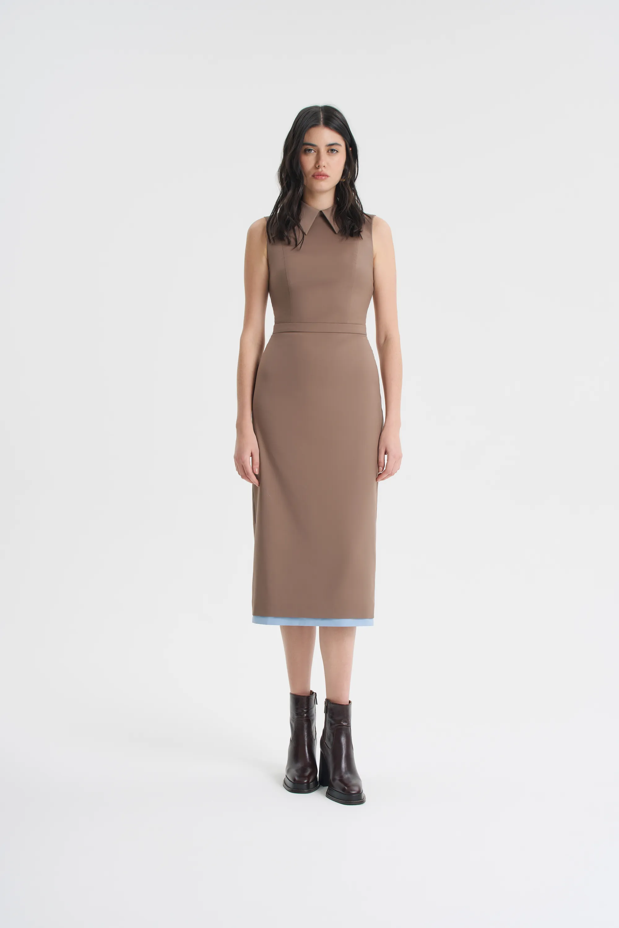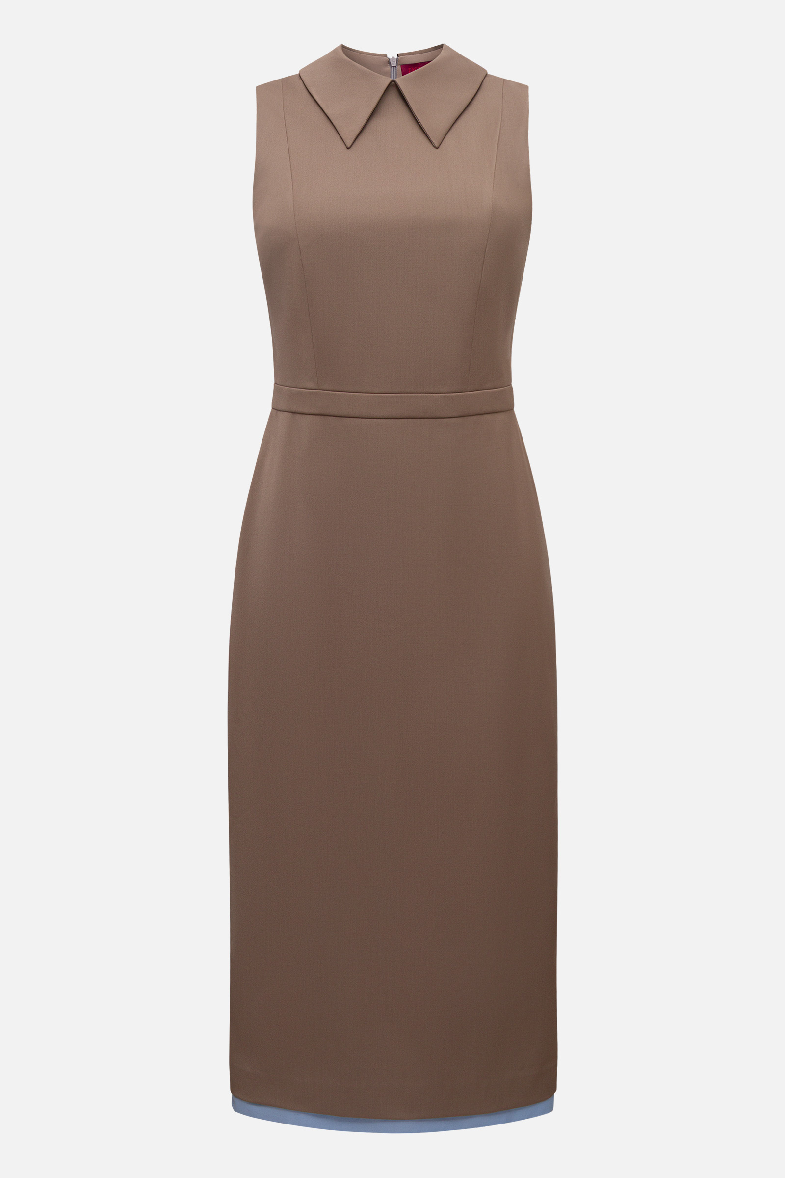 Платье-футляр прилегающего силуэта — безупречная основа для элегантных образов. Модель зауженного книзу силуэта, с втачным поясом на талии и формообразующими рельефами на полочке и спинке идеально облегает и подчеркивает фигуру. Для комфорта надевания предусмотрена потайная молния в среднем шве спинки, а для свободы шага — разрез сзади. Контрастная отделка по низу изделия создает эффект двухслойности, а широкий отложной воротник становится элегантным акцентом.