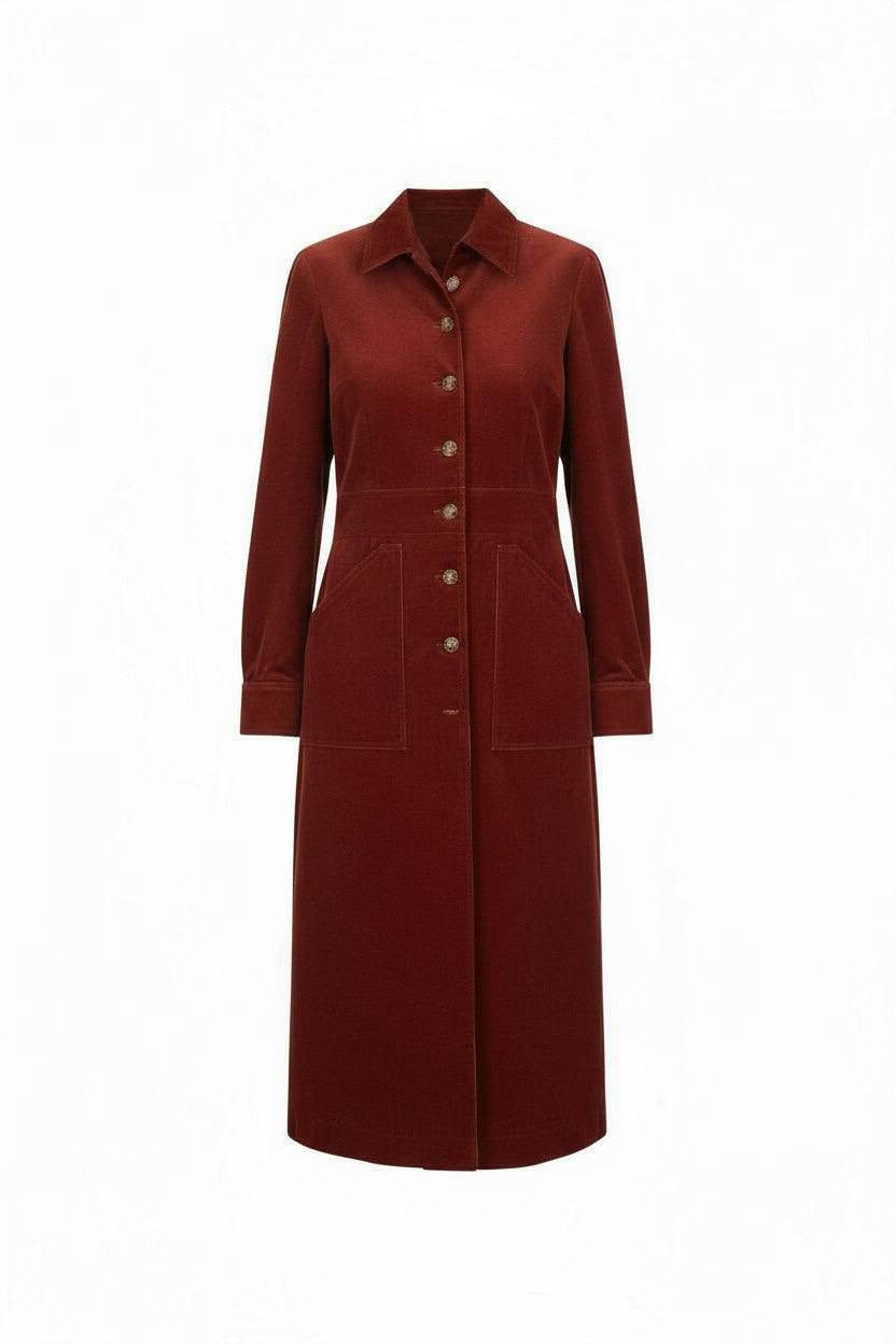 Плотный вельвет с характерной фактурой, оттенок — глубокий красно-коричневый. По силуэту и пропорциям модель отсылает к лаконичным формам 70-х: чёткая линия плеча, прямой крой, выраженная вертикаль за счёт центральной планки на пуговицах.