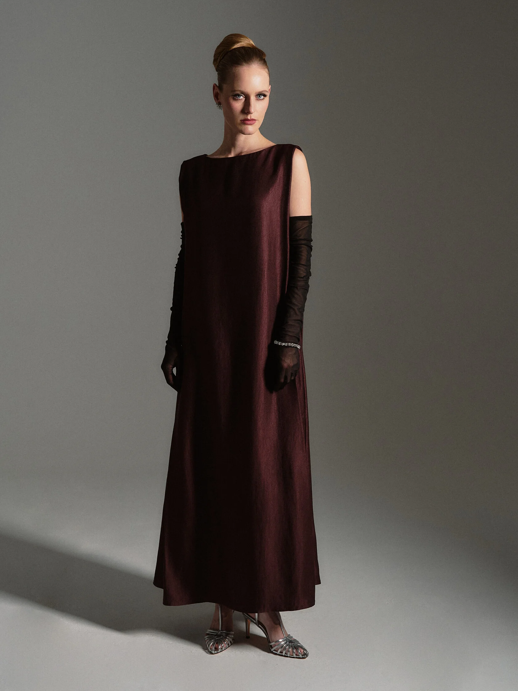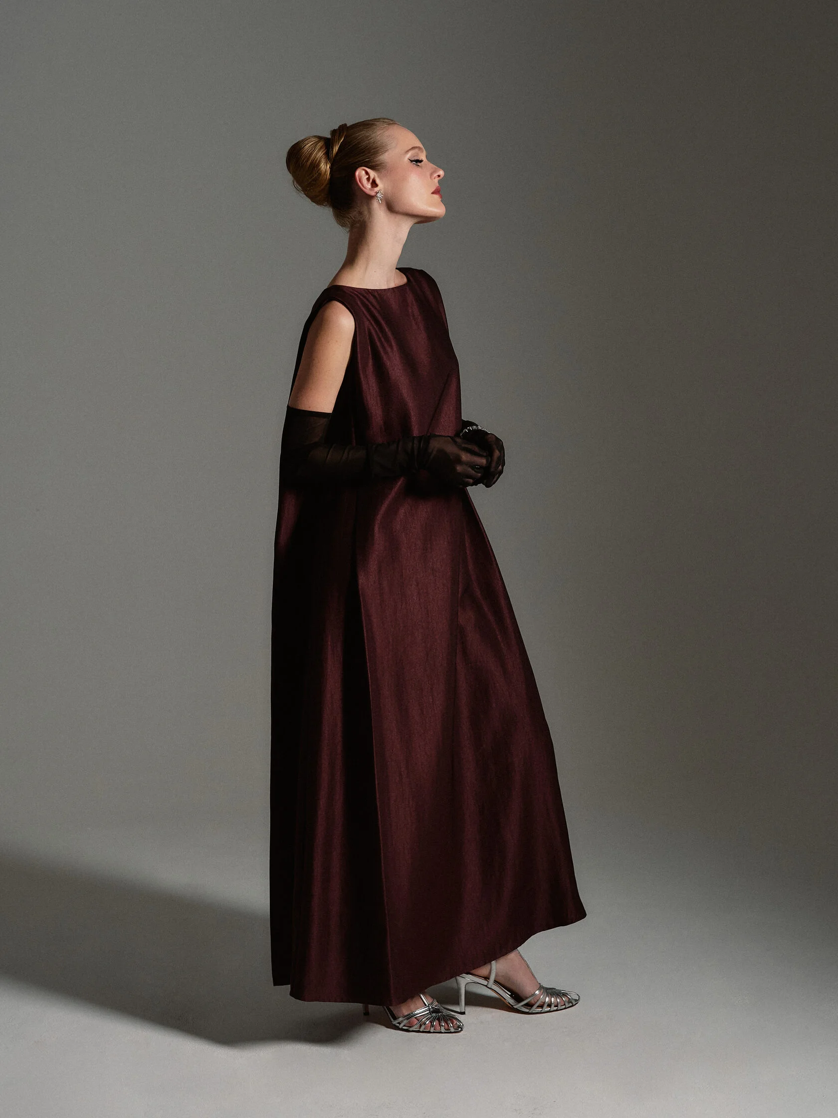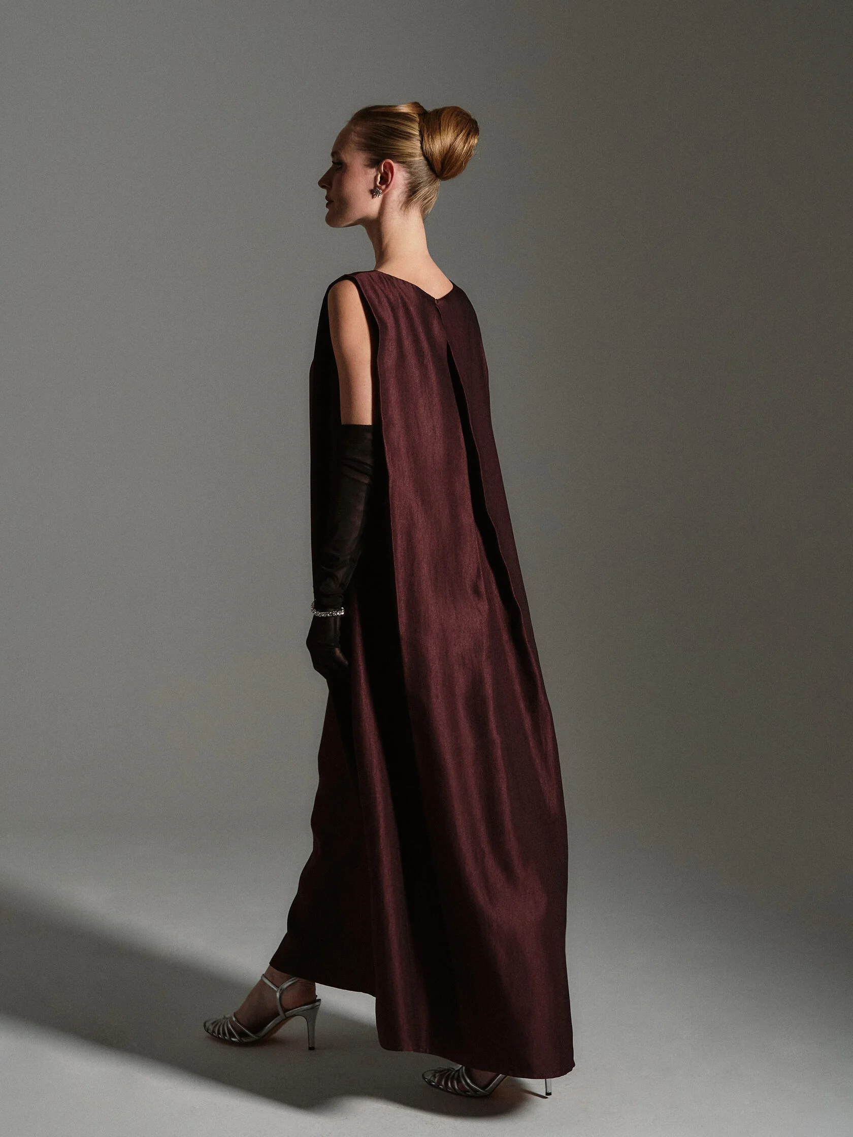 Платье-кейп макси без рукавов в оттенке бургунди. Акцентные складки и глубокий вырез на спине — образуют имитацию шлейфа и создают богемный вечерний образ.