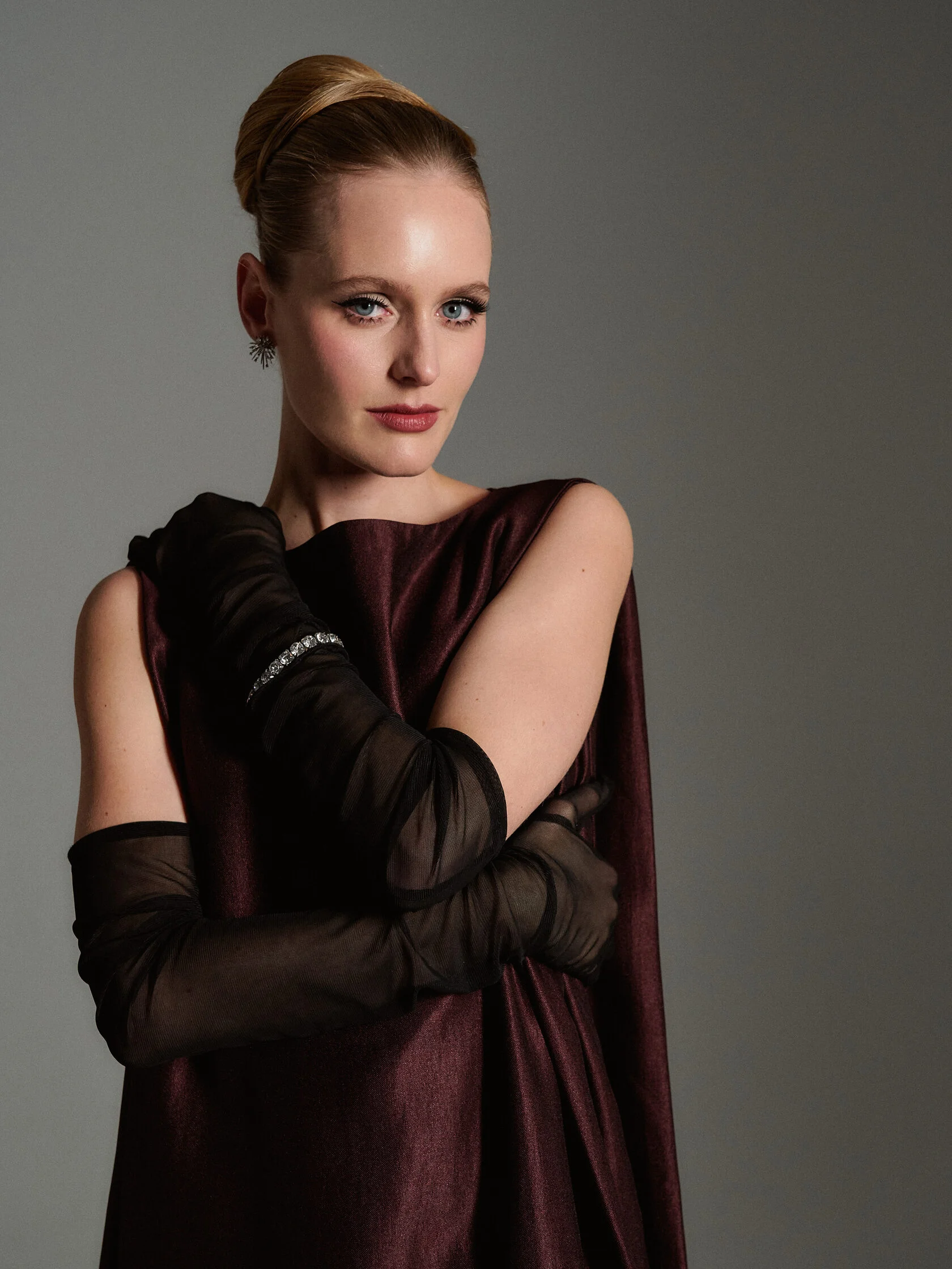 Ткань платья блестит и переливается в зависимости от освещения, а драпировки делают ее еще более многогранной. А-силуэт подчеркивает женственность и элегантность, которые так необходимы новогодней ночью.