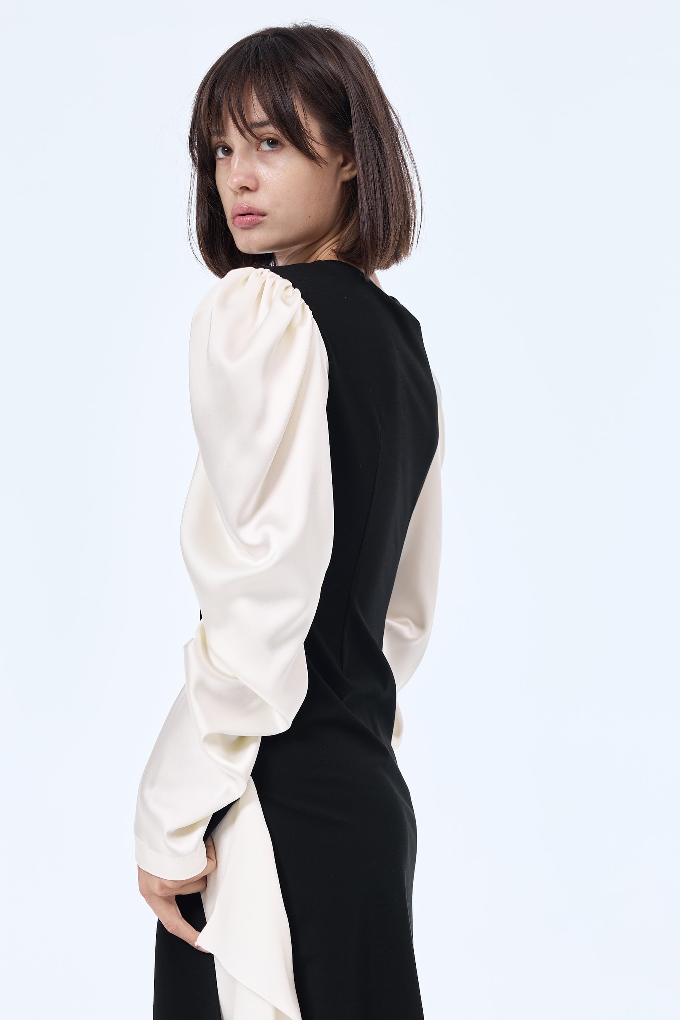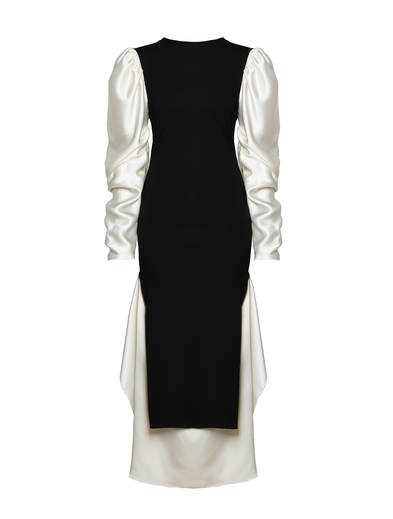 Комбинированное платье с пышными рукавами и удлиненным фасоном, удивительно подчеркнёт вашу фигуру, за счет контрастной фактуры материалов. Платье с разрезами по бокам. Аккуратный вырез горловины даёт возможность дополнить образ каким-нибудь украшением. Образ можно завершить минималистичной обувью, для вечернего выхода, либо ботинками на платформе для более повседневного образа.