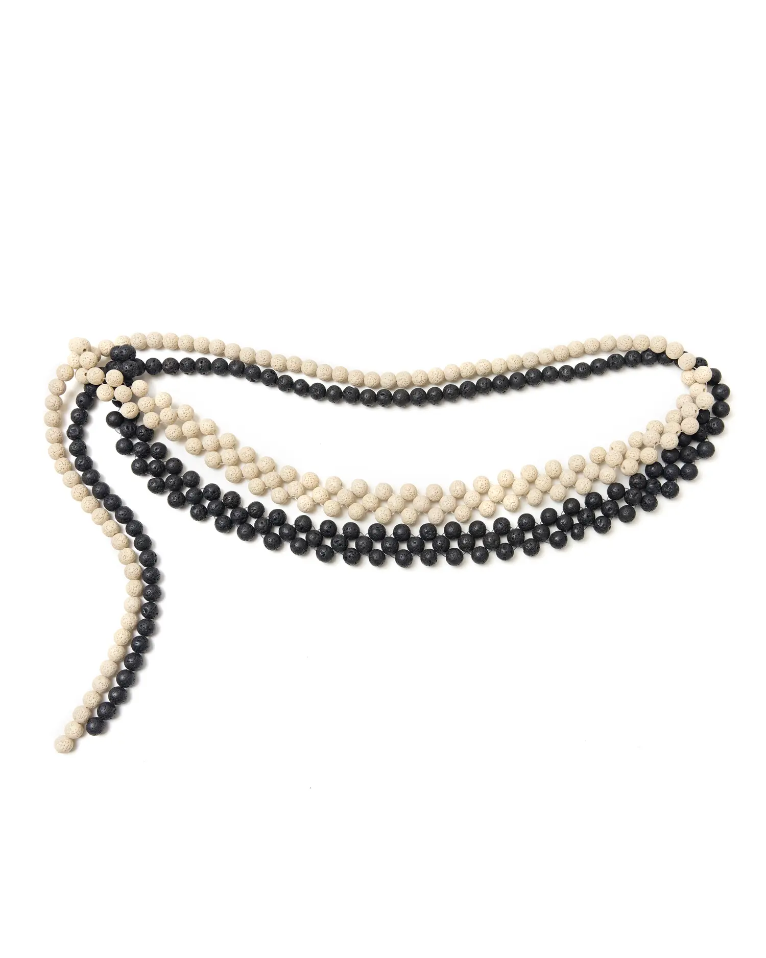 Пояс из светлой пенистой лавы ручной работы, где натуральные поры и неровности поверхности создают уникальный рельеф, напоминающий лунный ландшафт. Регулируемая длина позволяет носить его на талии или бедрах, добавляя скульптурный акцент в монохромные образы.
