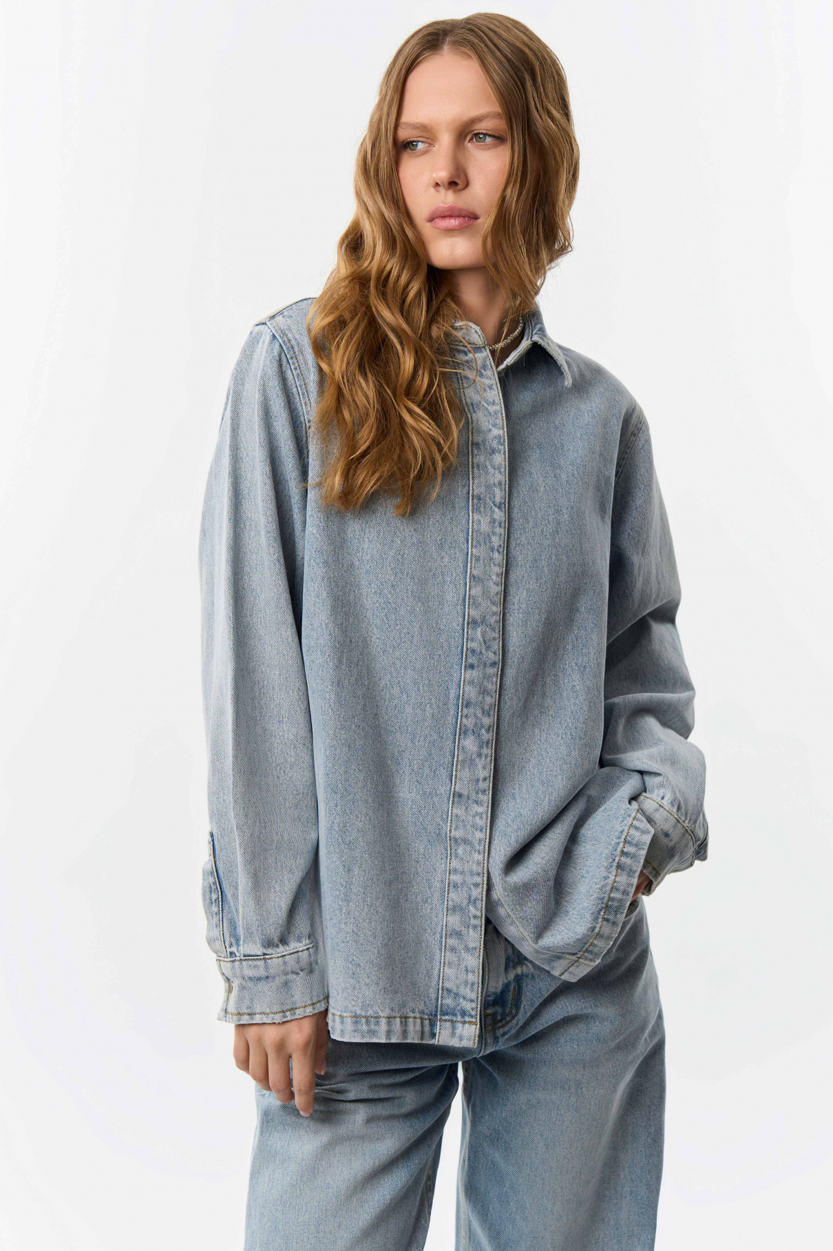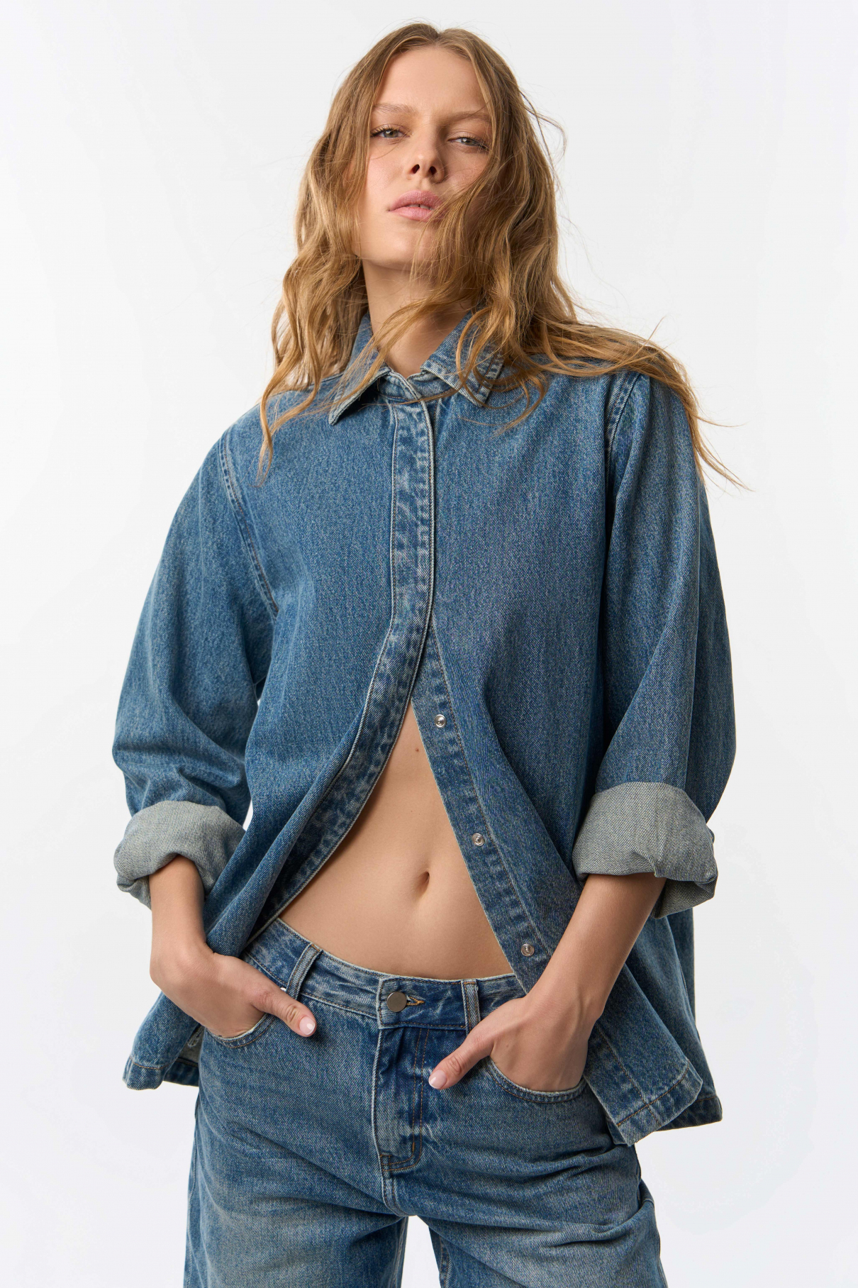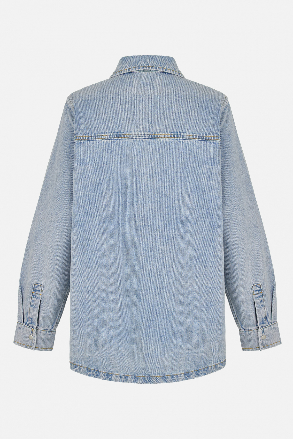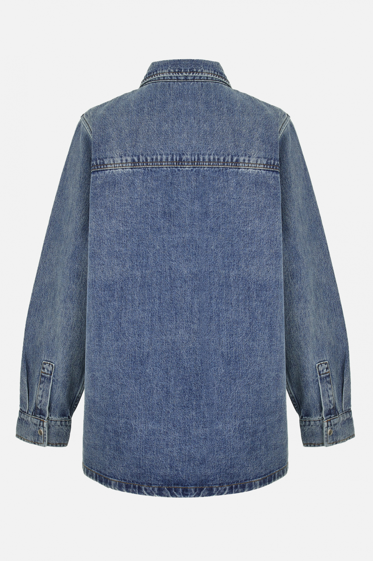 Джинсовая рубашка длиной до середины бедер. Выполнена из 100% хлопка, материал плотный и практичный в носке. Модель и ее рукава застегиваются на металлические кнопки. Более универсальную вещь, чем рубашка из денима, найти сложно: носить ее можно самостоятельно, надевать поверх майки или топа, а также в качестве нижнего слоя — под объемный свитер или вязаный жилет. FASHION REBELS предлагает такую модель в двух вариантах — в светло-голубом и синем оттенках.