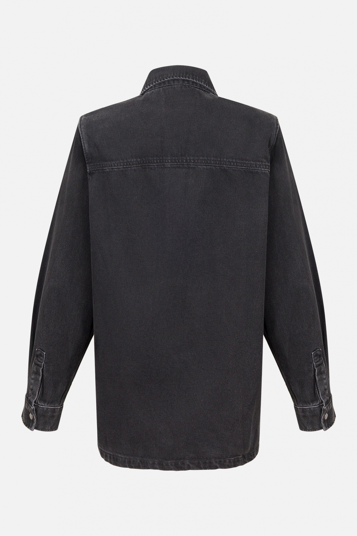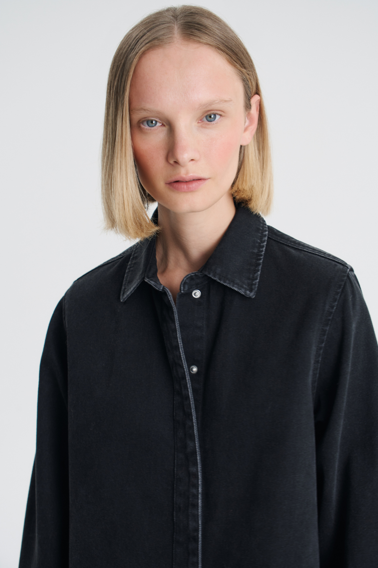 Джинсовая рубашка-бестселлер из 100% хлопка. Деним плотностью 12 Oz — прочный и долговечный материал, который комфортно носить почти в любую погоду. Удлиненный свободный силуэт с естественной линией плеча, застежкой на скрытые кнопки и двойной кокеткой сзади создает идеальные пропорции. Универсальное базовое изделие минималистичного дизайна открывает простор для стилизаций. Джинсовую рубашку можно носить в качестве легкой верхней одежды поверх майки или топа, как первый слой под объемный свитер или вязаный жилет или самостоятельно, в том числе в total denim образах.