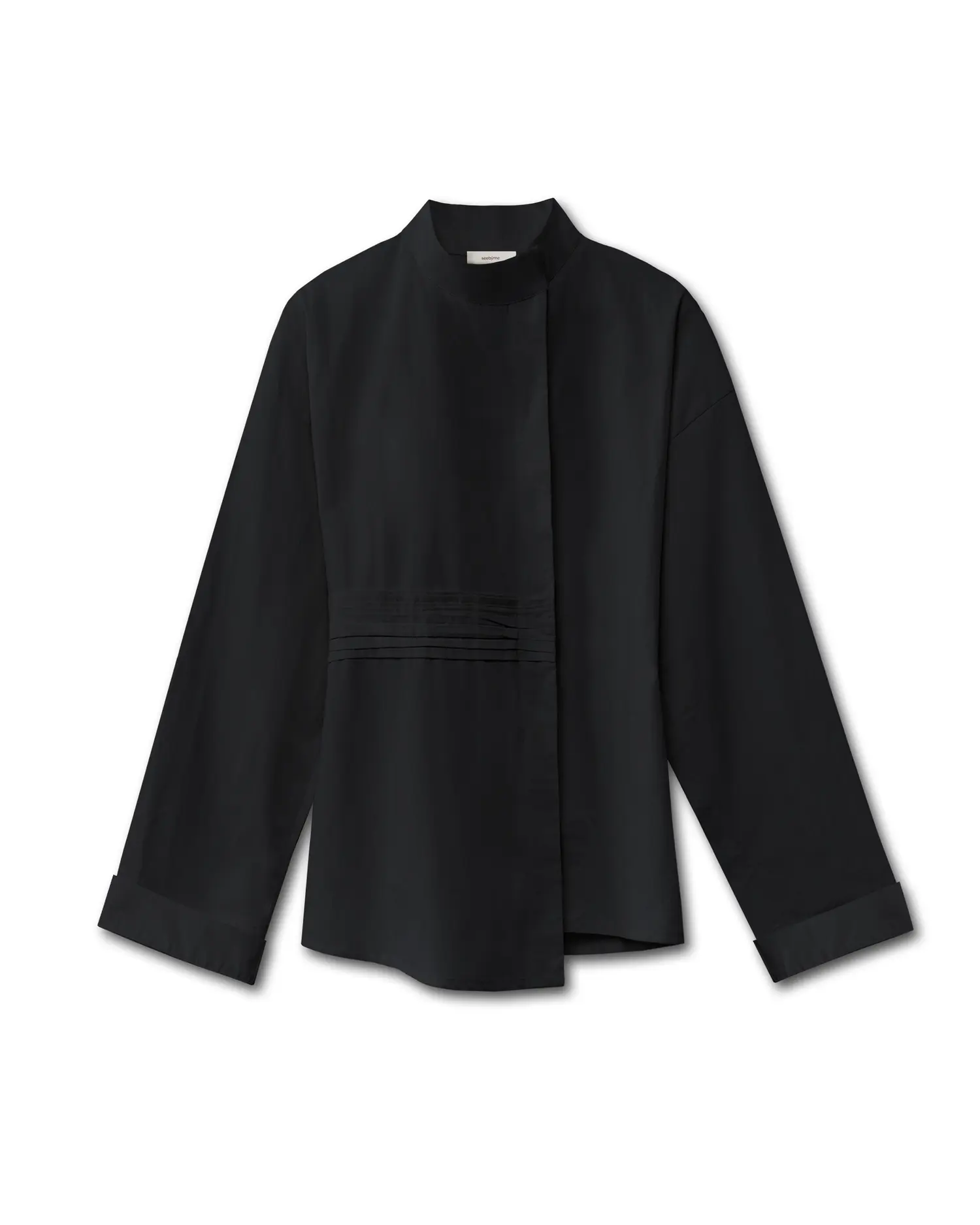 Рубашка с воротом-стойкой и скрытой супатной застежкой, где главный герой – крой и фактура. Акцент на талии с имитацией кушака и защипами на спинке создают графичный силуэт .