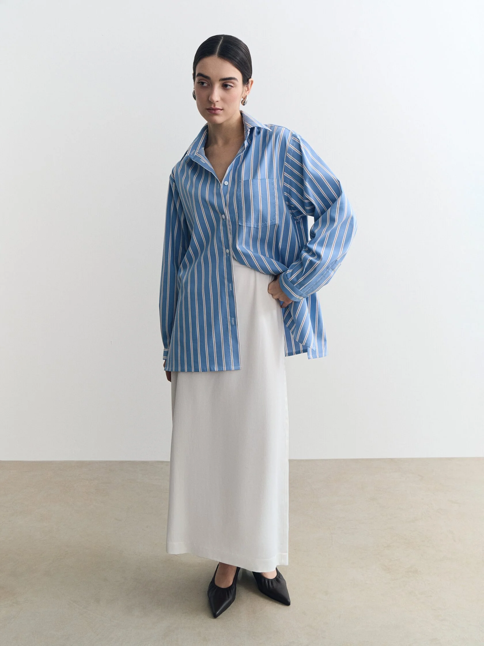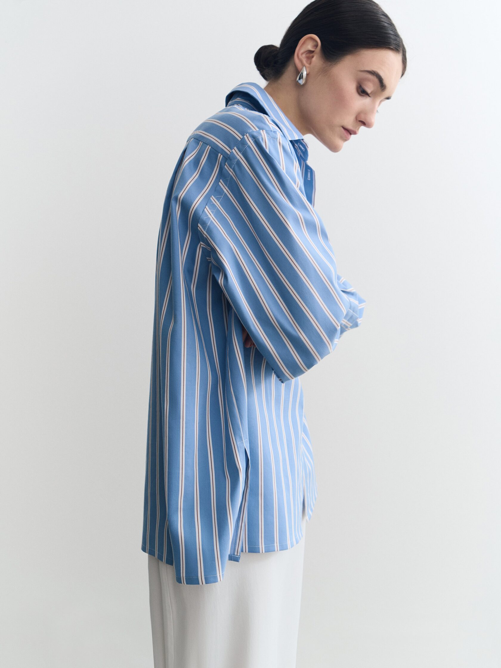 Универсальная полоска делает рубашку идеальным выбором для акцентных образов, добавляя визуальную динамику и свежесть. Разрезы по бокам обеспечивают свободу движения.