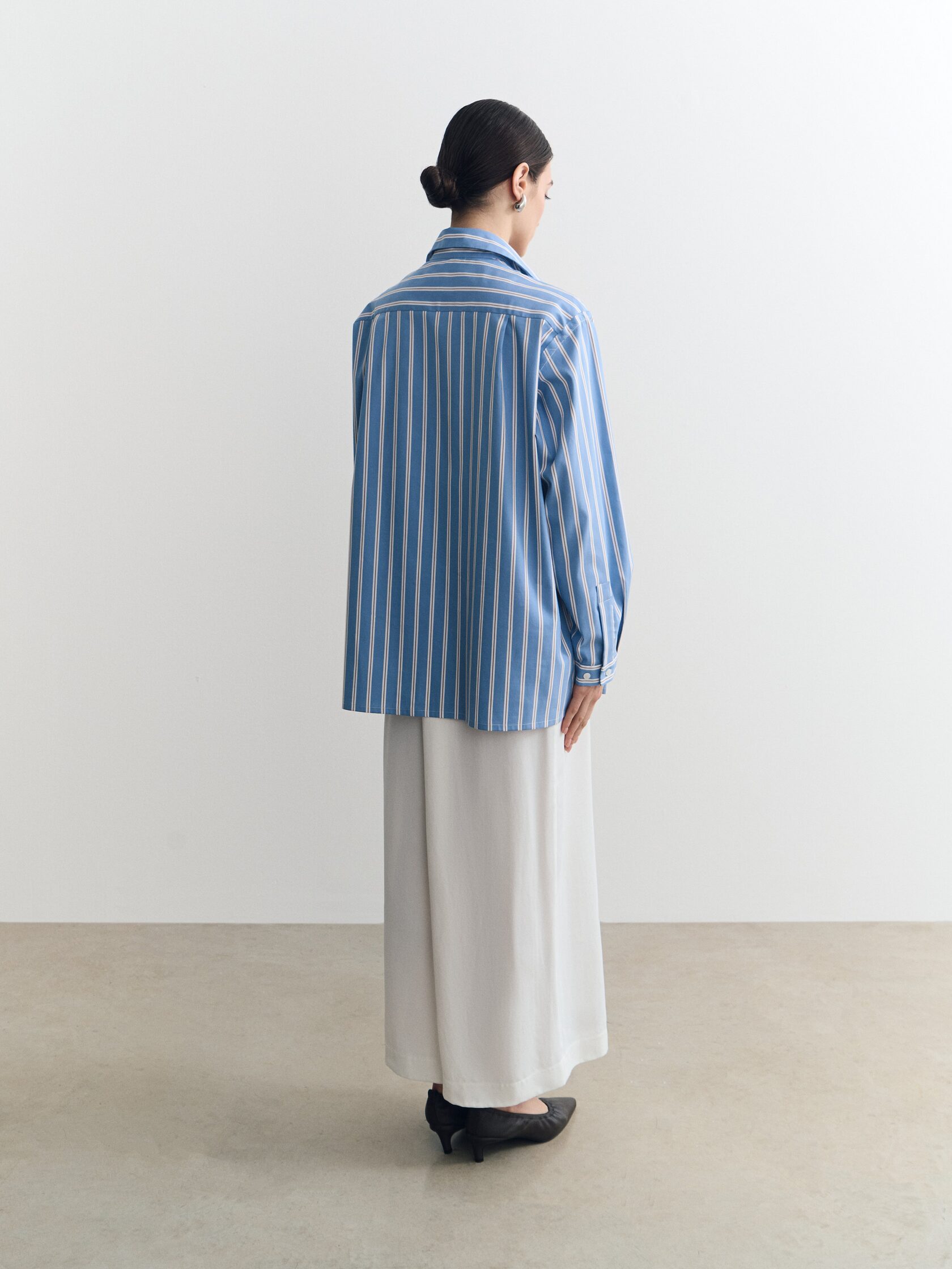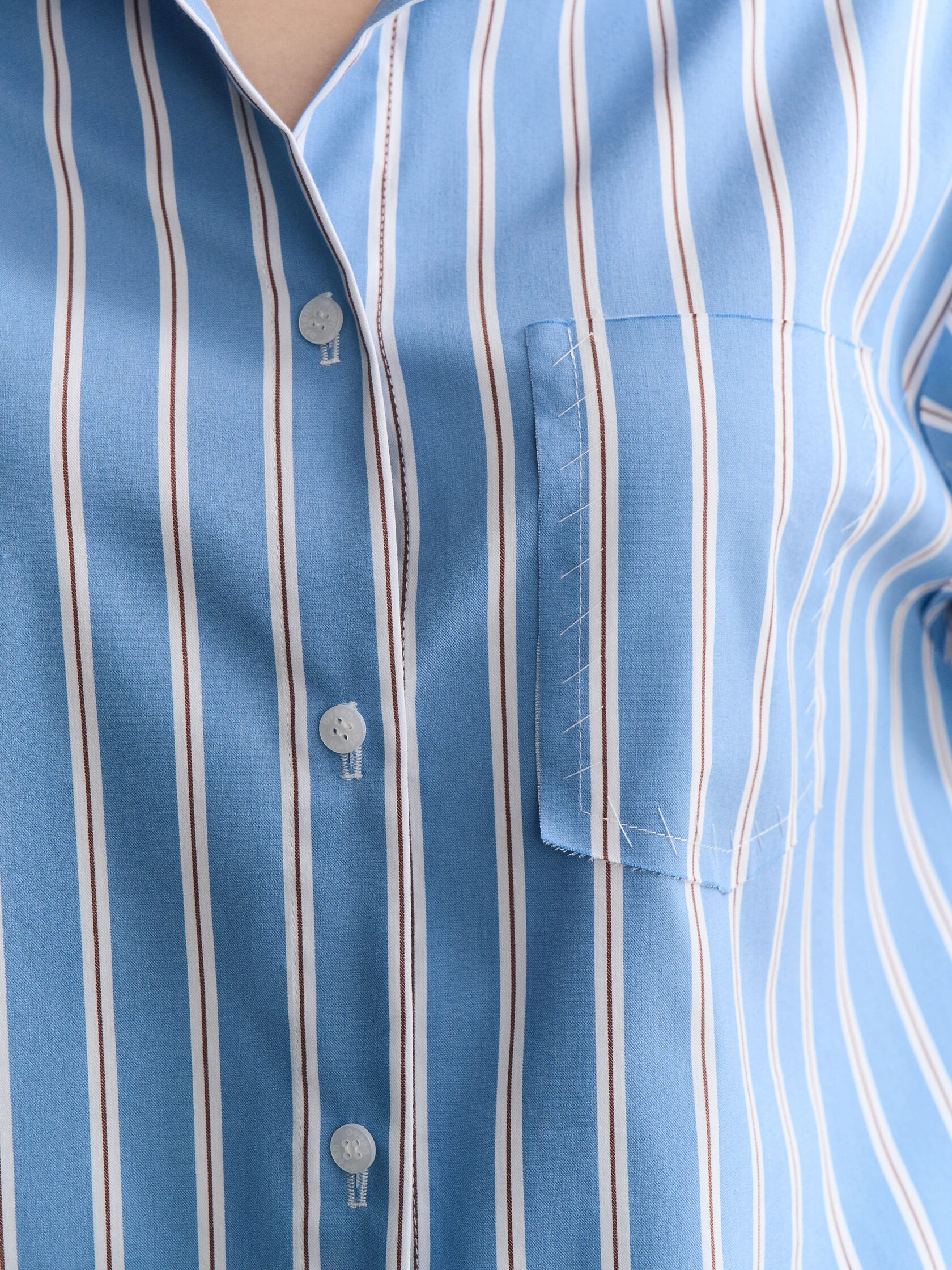 Удлиненная рубашка — новый формат в классике с уникальными деталями. Нарочито необработанный карман придает модели характер и лёгкую небрежность. Стежки на кармане и рукавах выполнены вручную.