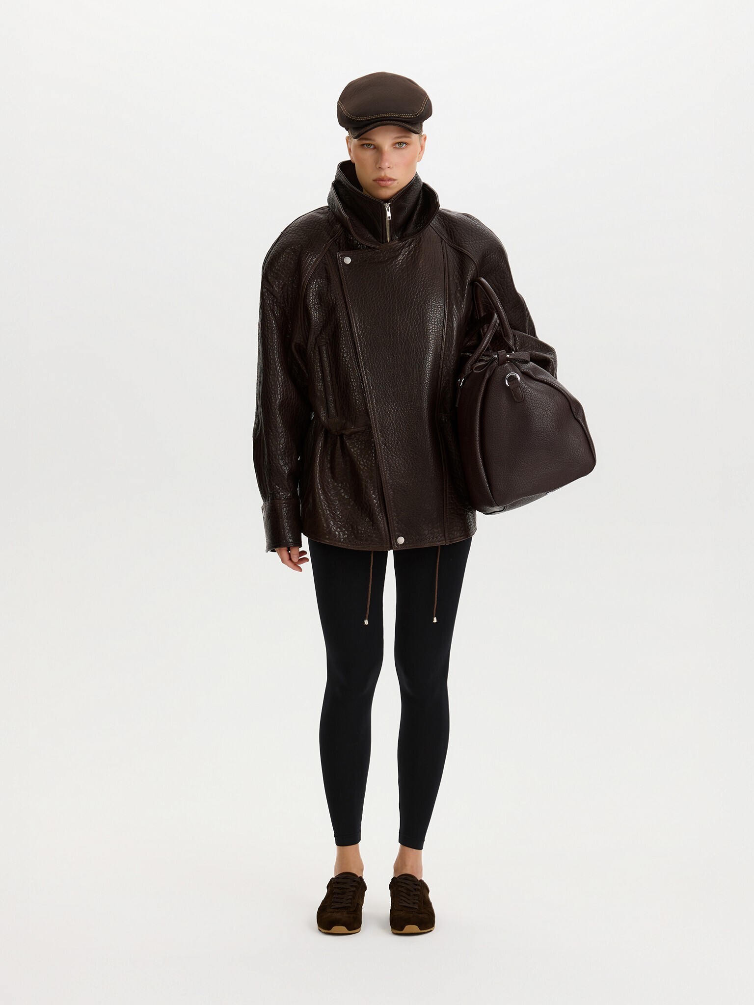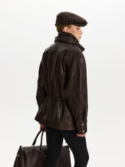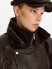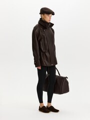 Парка силуэта oversize сшили из зернистой кожи ягненка. Модель с боковыми карманами застегивается молнией и клапаном с кнопками.