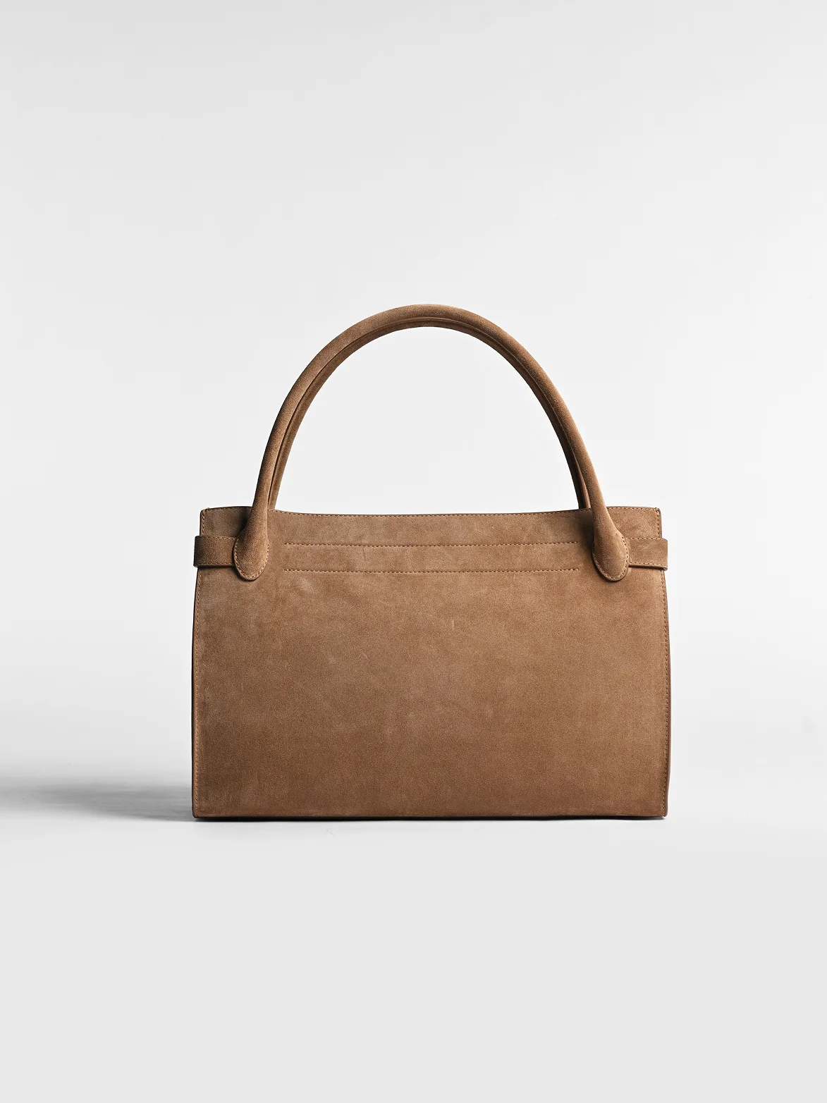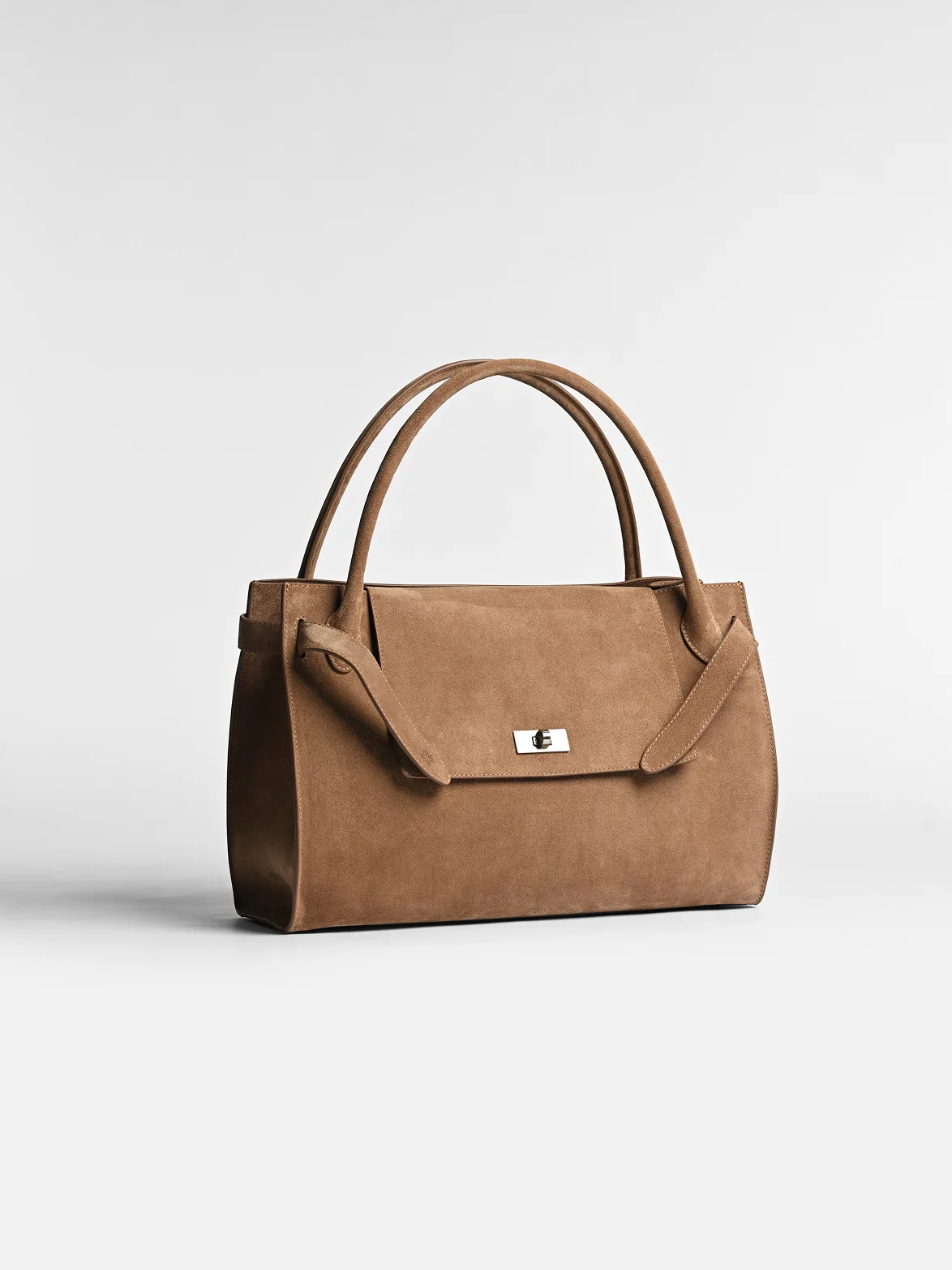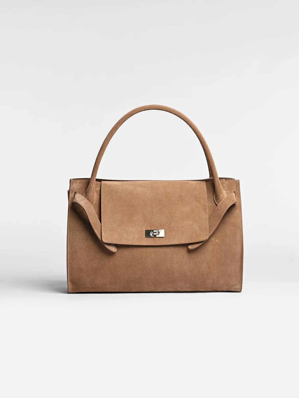 Для создания модели использовали натуральную премиальную замшу с бархатистой текстурой и глубокой цветовой насыщенностью. Благородная матовая поверхность материала деликатно подчеркивает объем и линии сумки, придавая модели особую тактильность и выразительность.