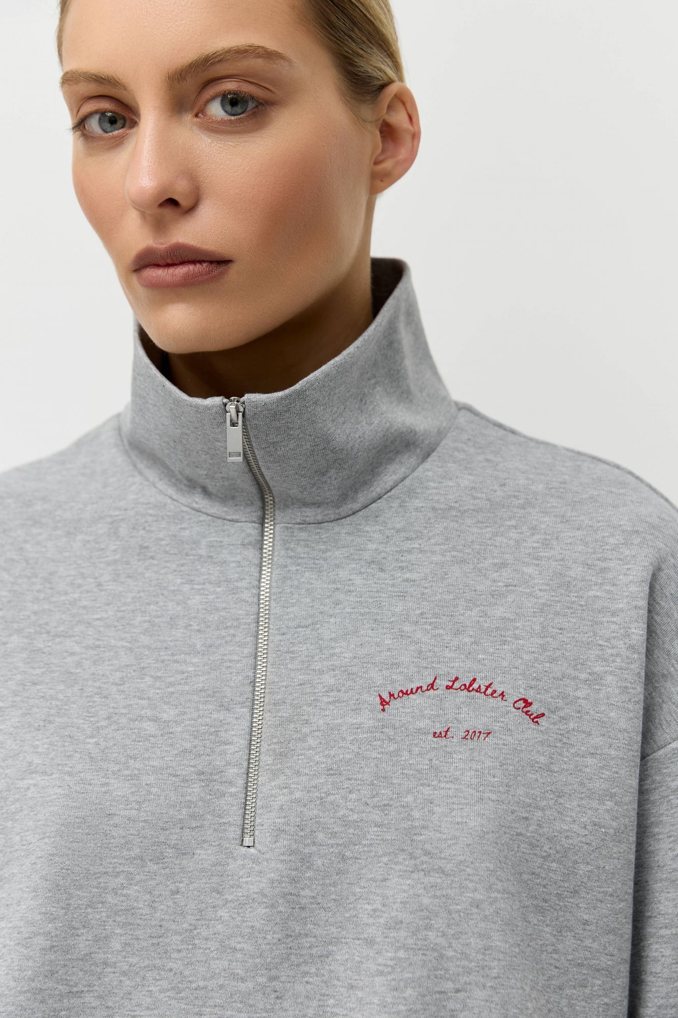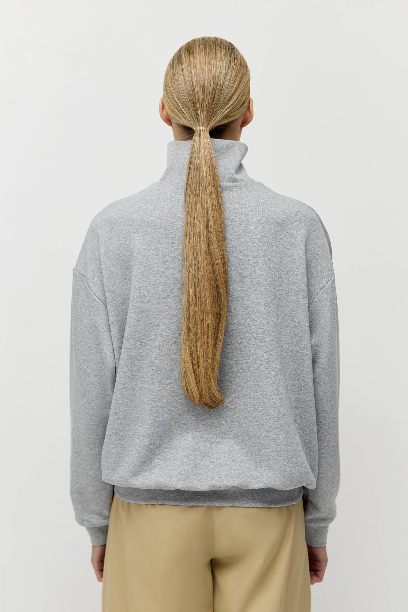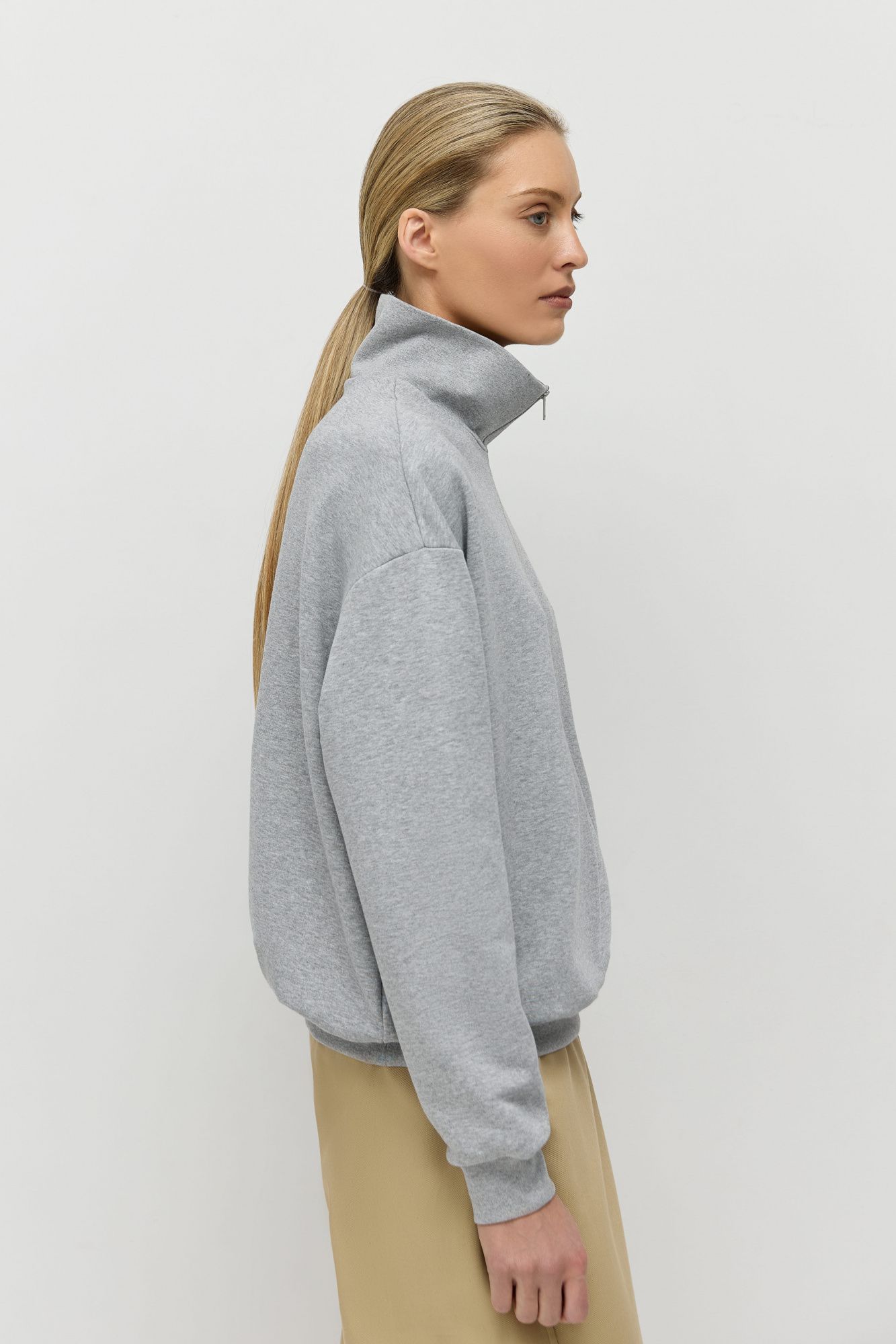У свитшота высокий воротник-стойка, застежка на металлическую молнию, cпущенное плечо. Рукава и низ изделия создают О-силуэт.