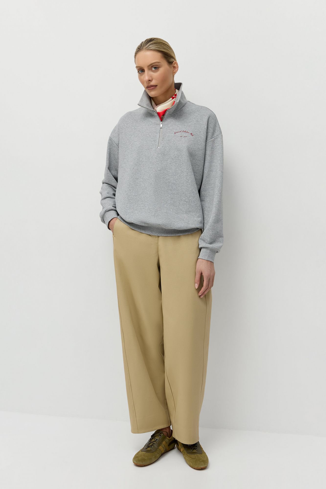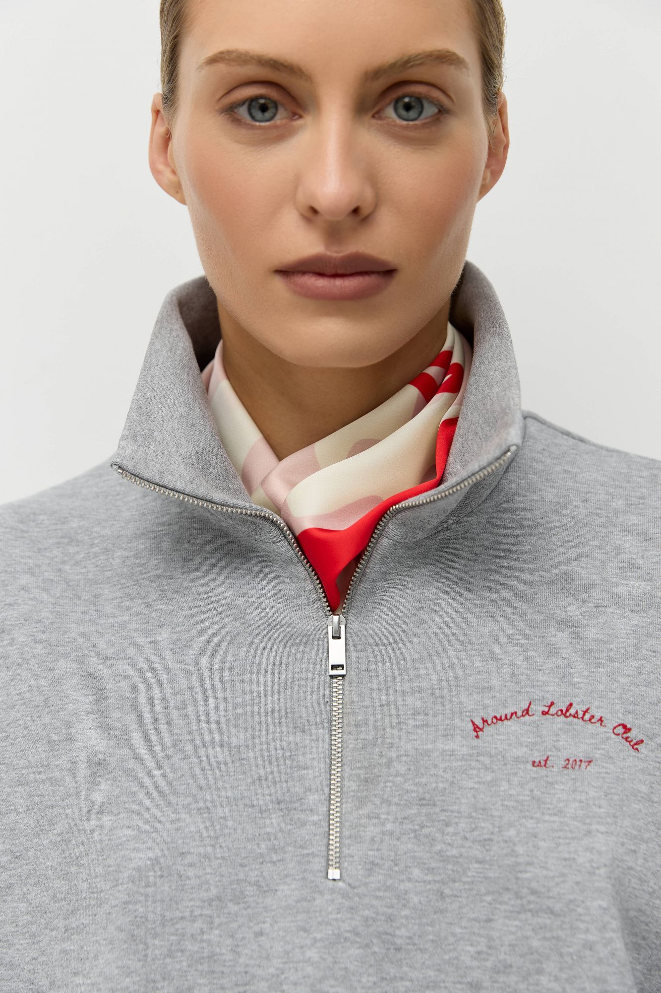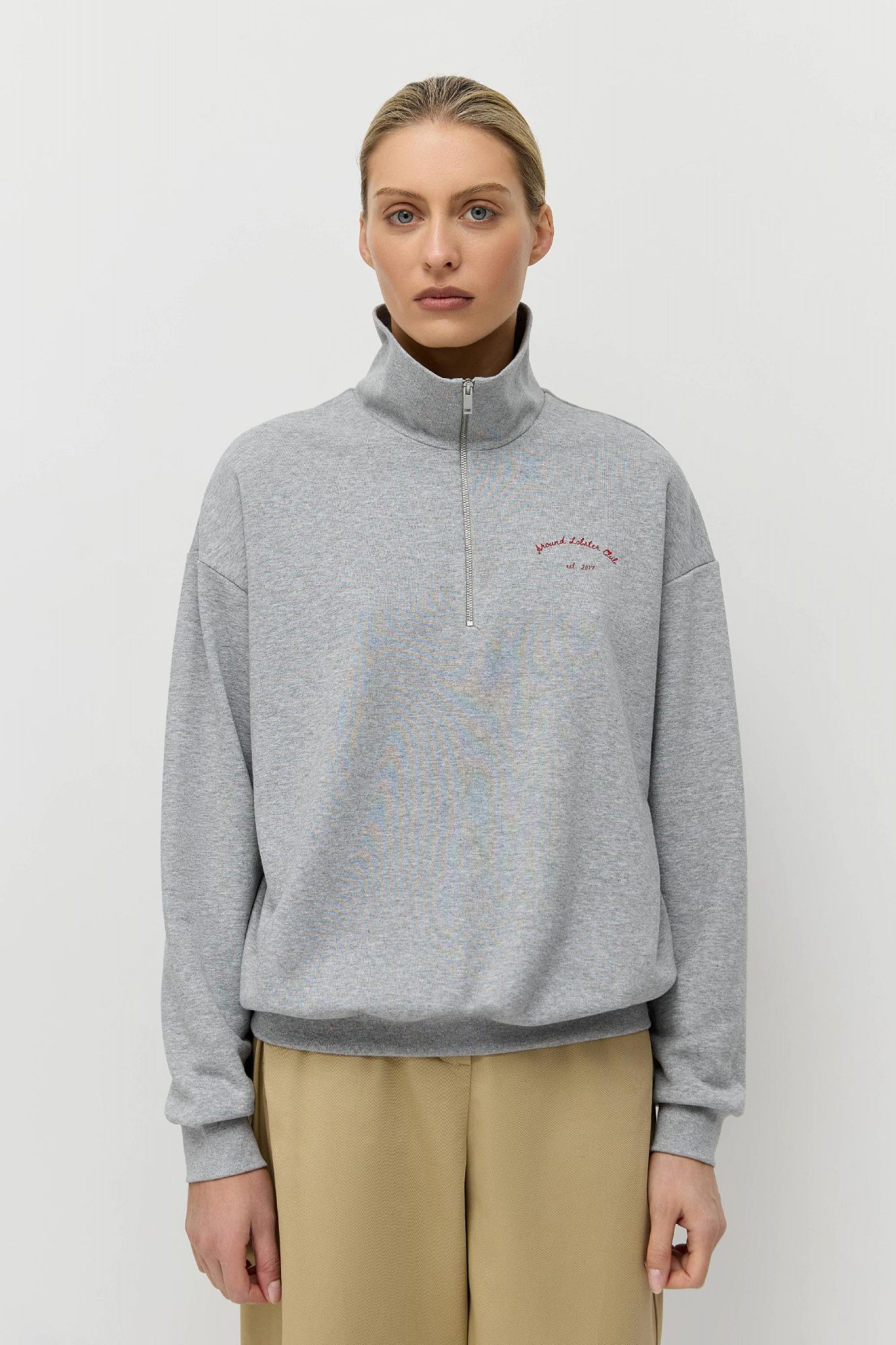 У свитшота высокий воротник-стойка, застежка на металлическую молнию, cпущенное плечо. Рукава и низ изделия создают О-силуэт.