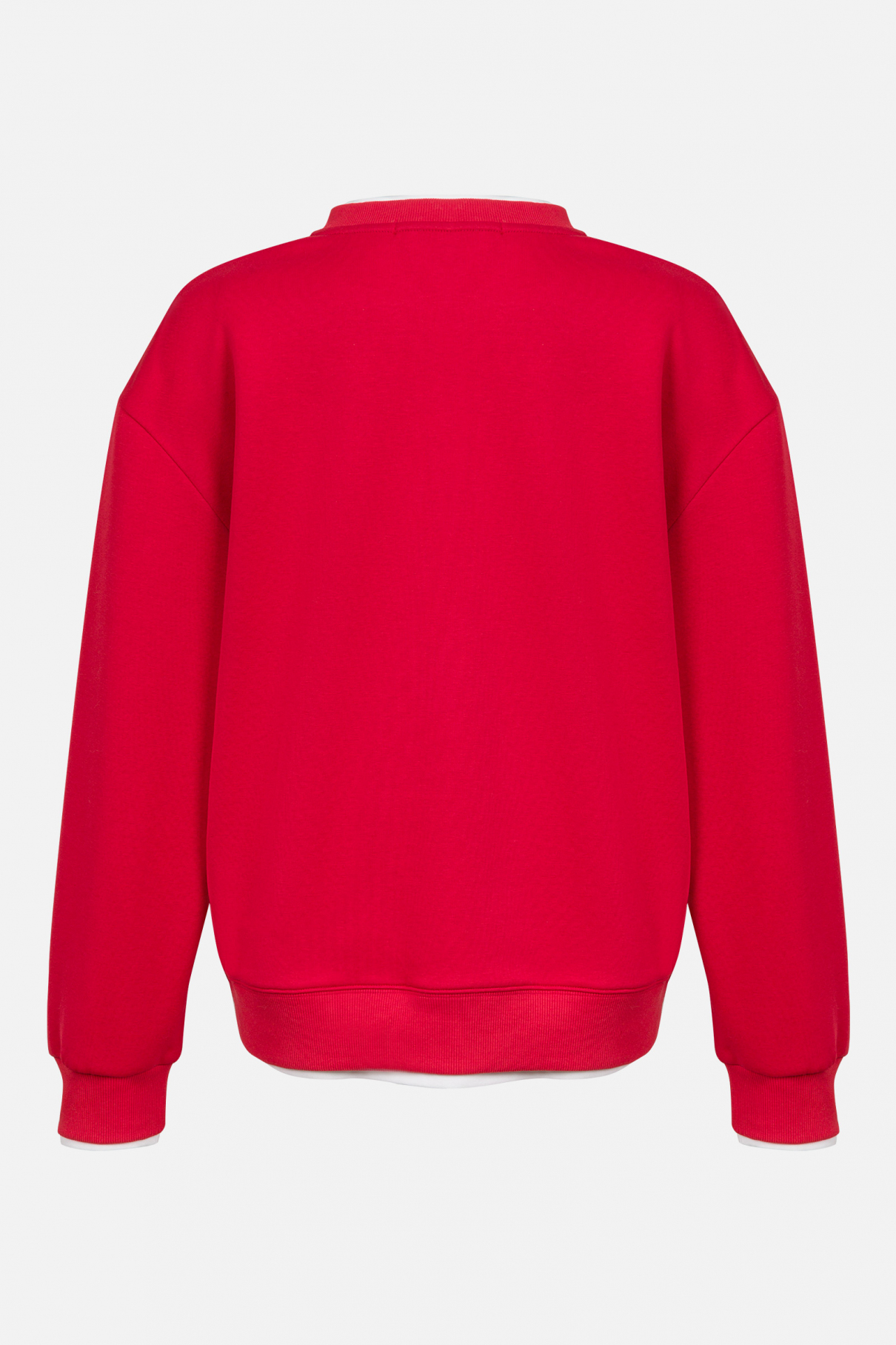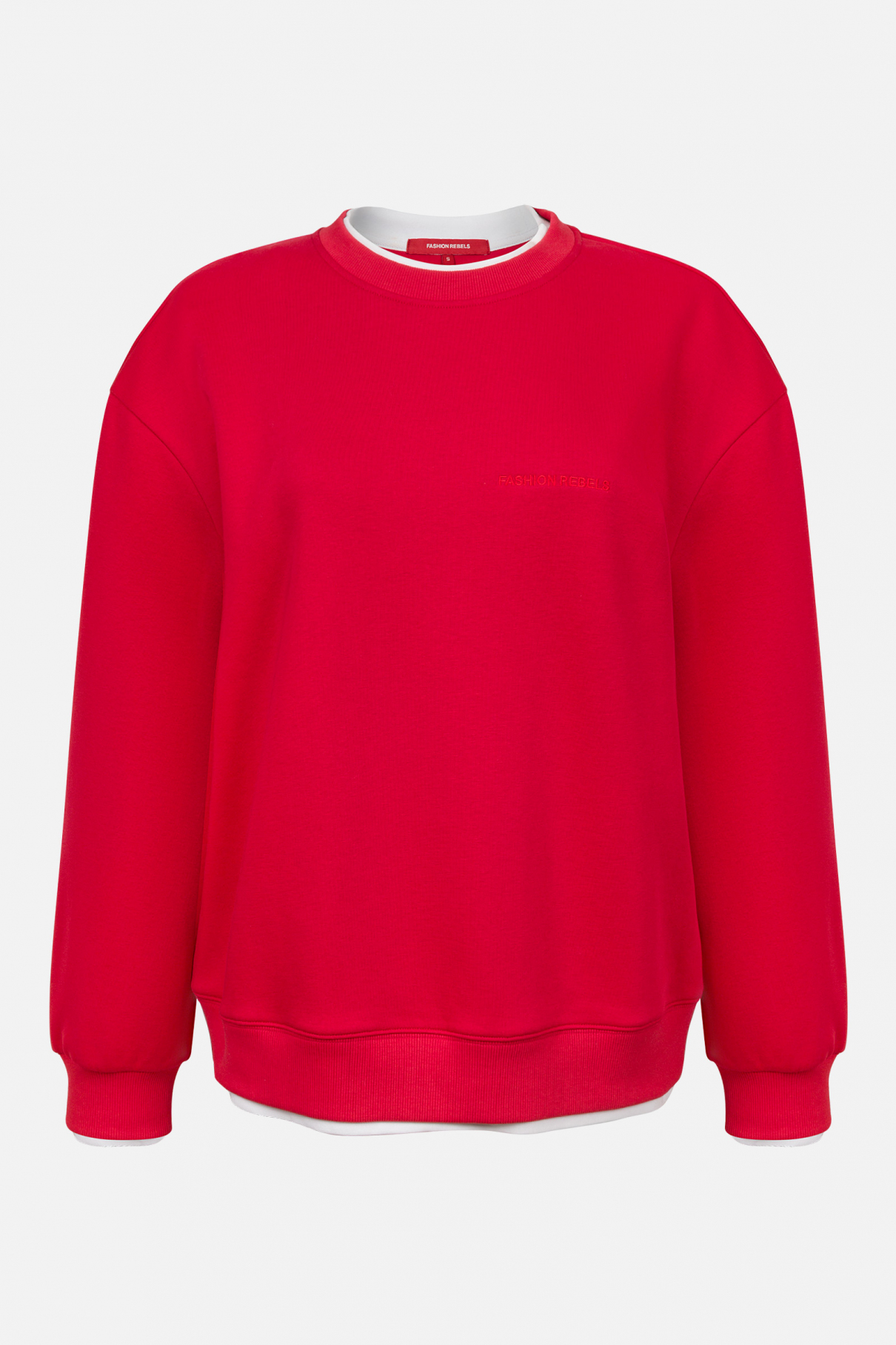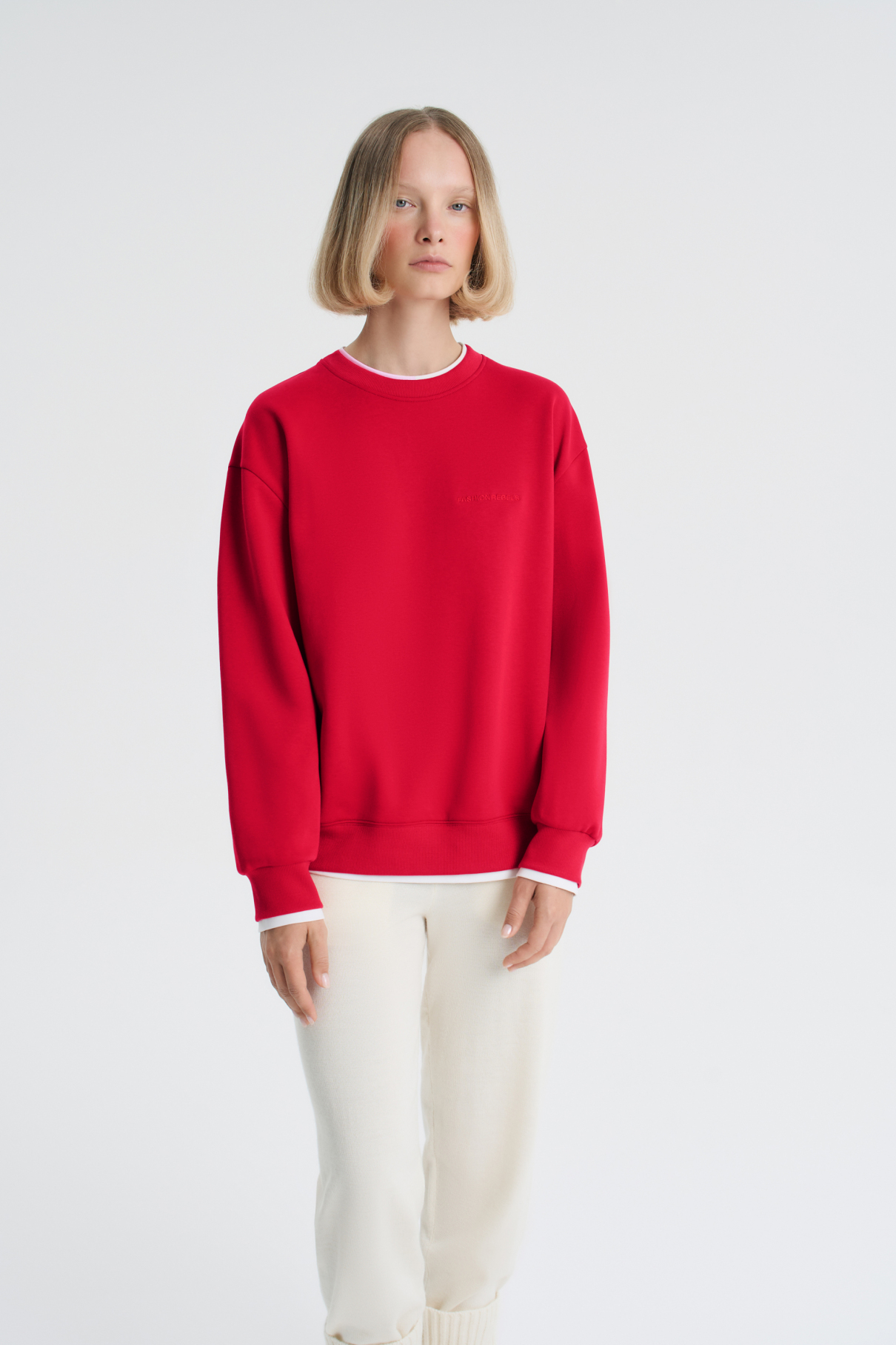Свитшот с эффектом двухслойности: дополнительный слой белого трикотажа имитирует выглядывающий из-под низа лонгслив. Такой эффект добавляет образу свежесть и объём. Модель прямого свободного кроя со спущенным плечом выполнена из мягкого и прочного поликотона. Свитшот украшен лаконичной вышивкой с названием бренда.