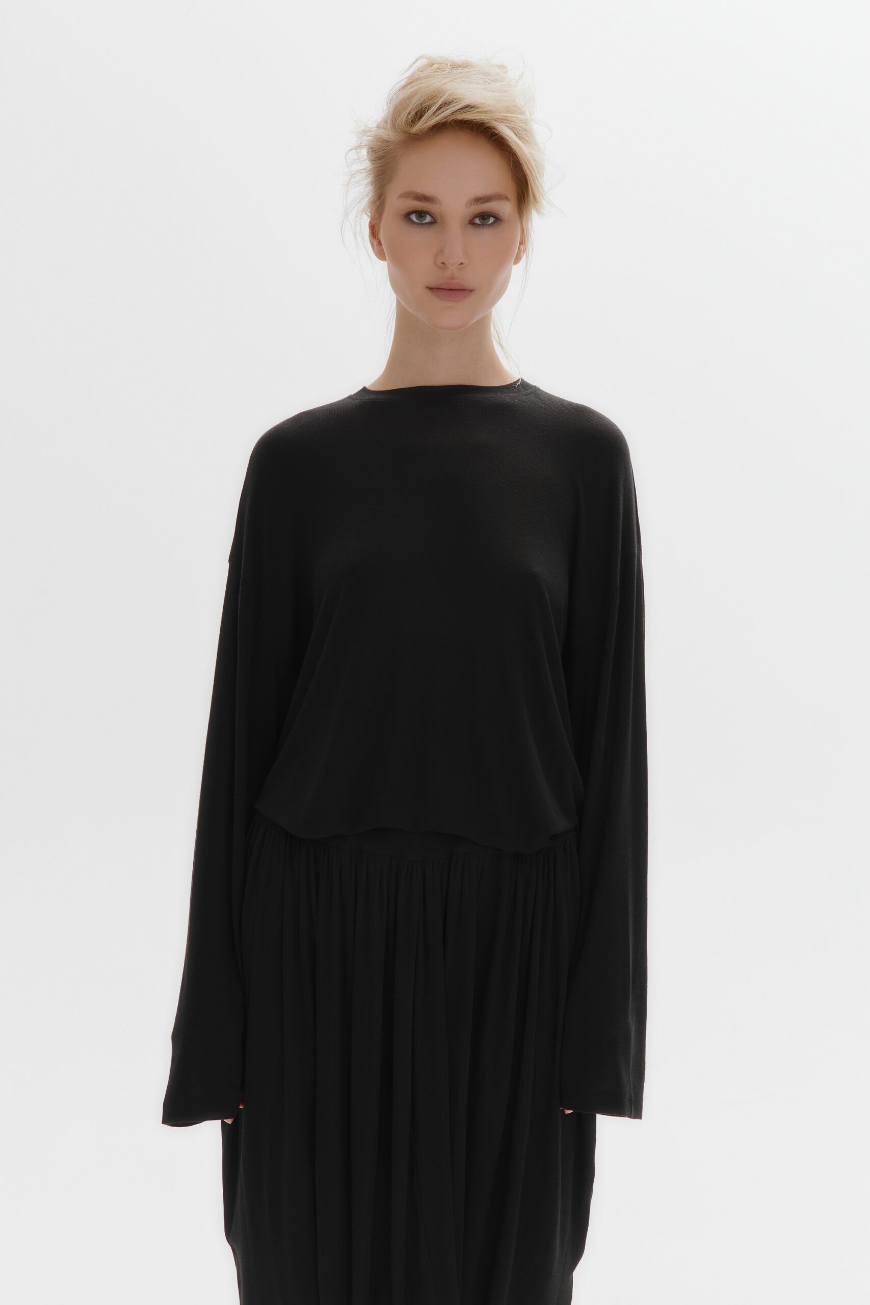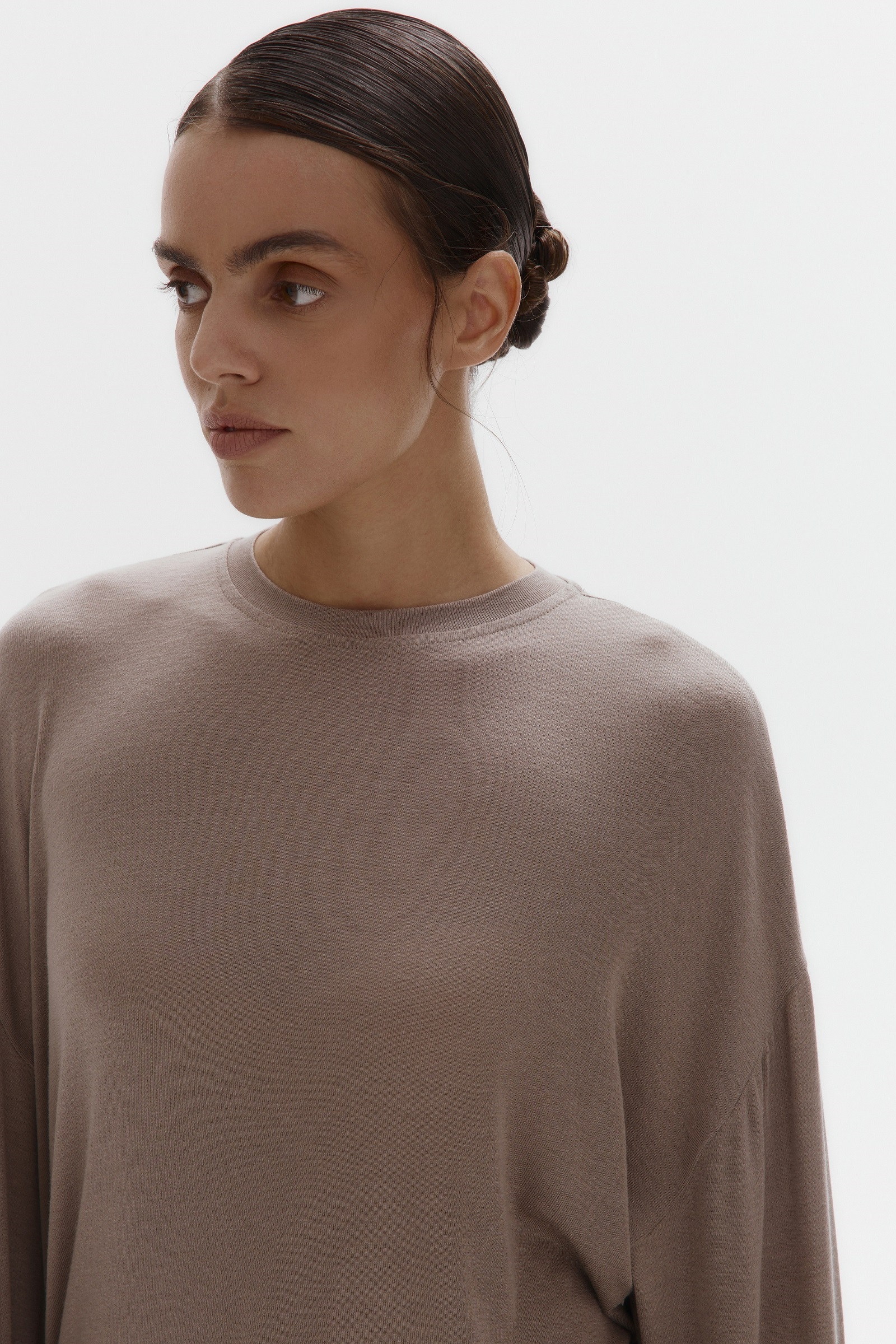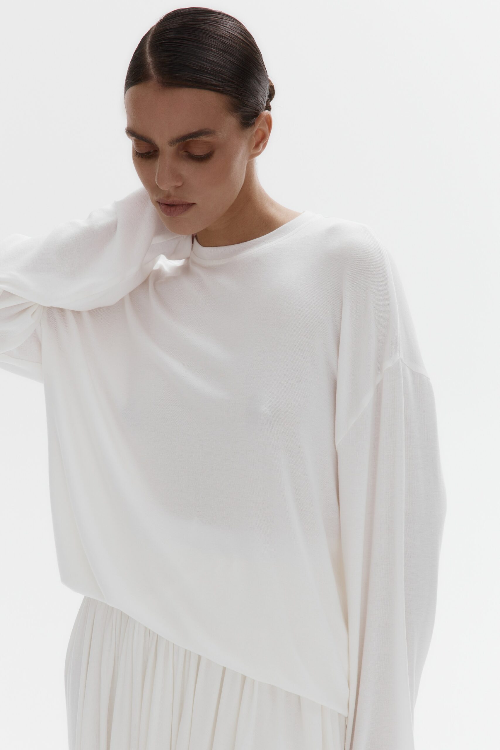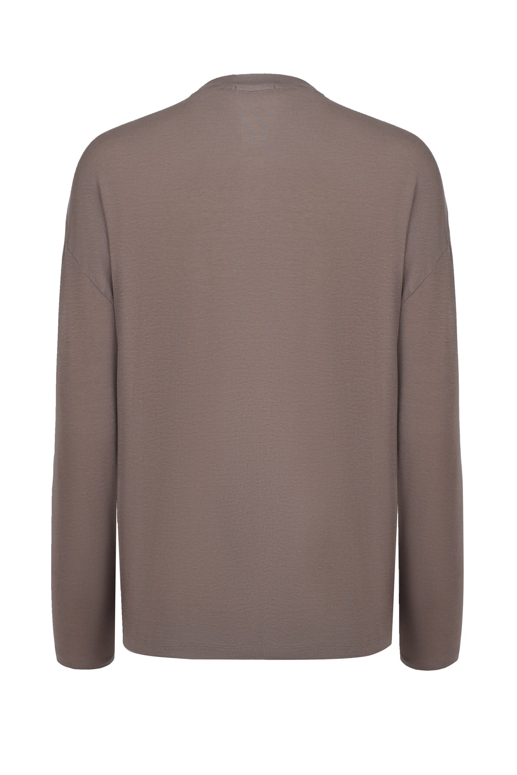 Удлиненный лонгслив свободного кроя из мягкого трикотажа с добавлением шерсти. Тонкая, слегка просвечивающая ткань обеспечивает комфорт и тепло, а универсальный дизайн делает его идеальной базой для повседневных образов.
