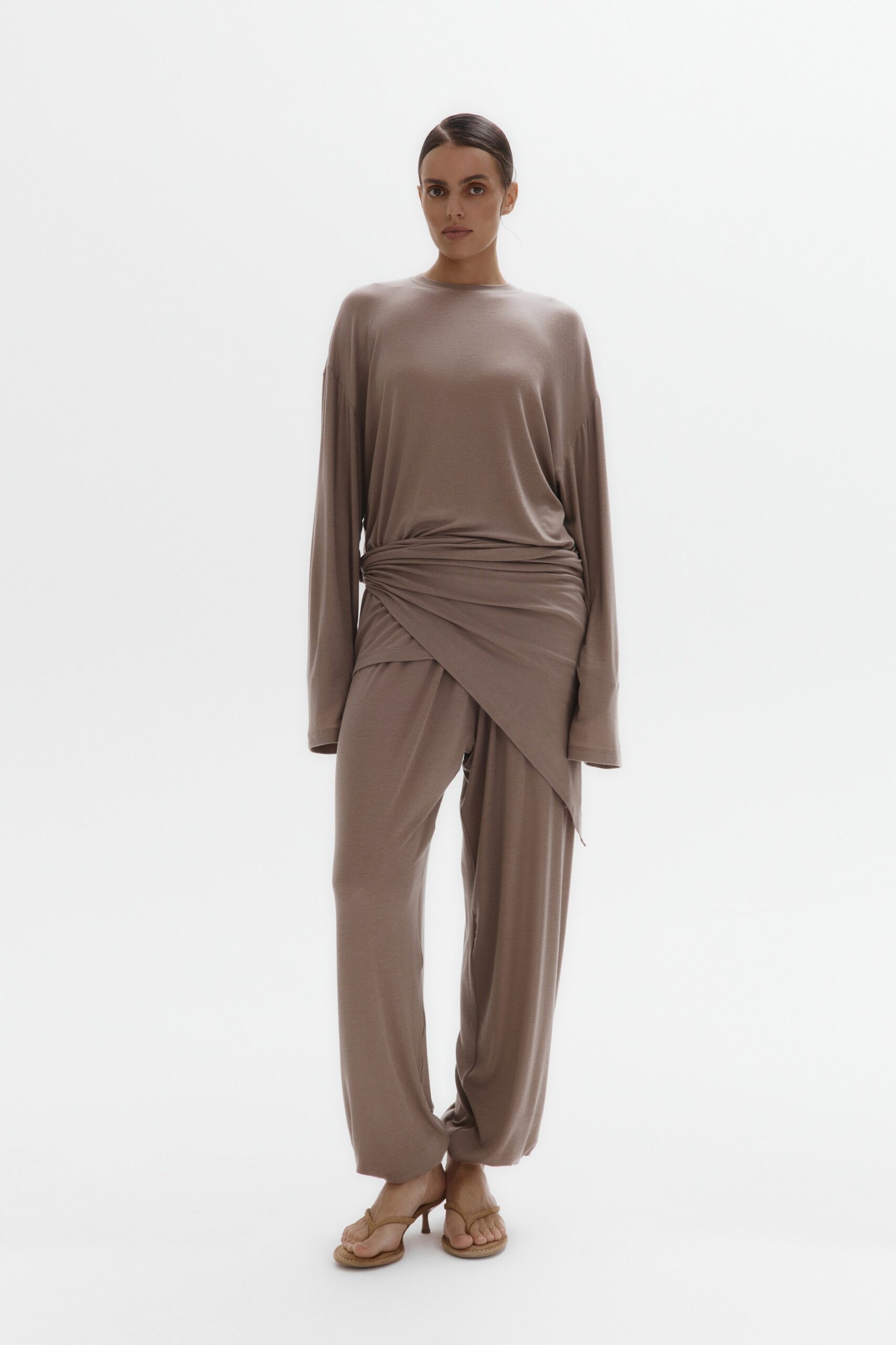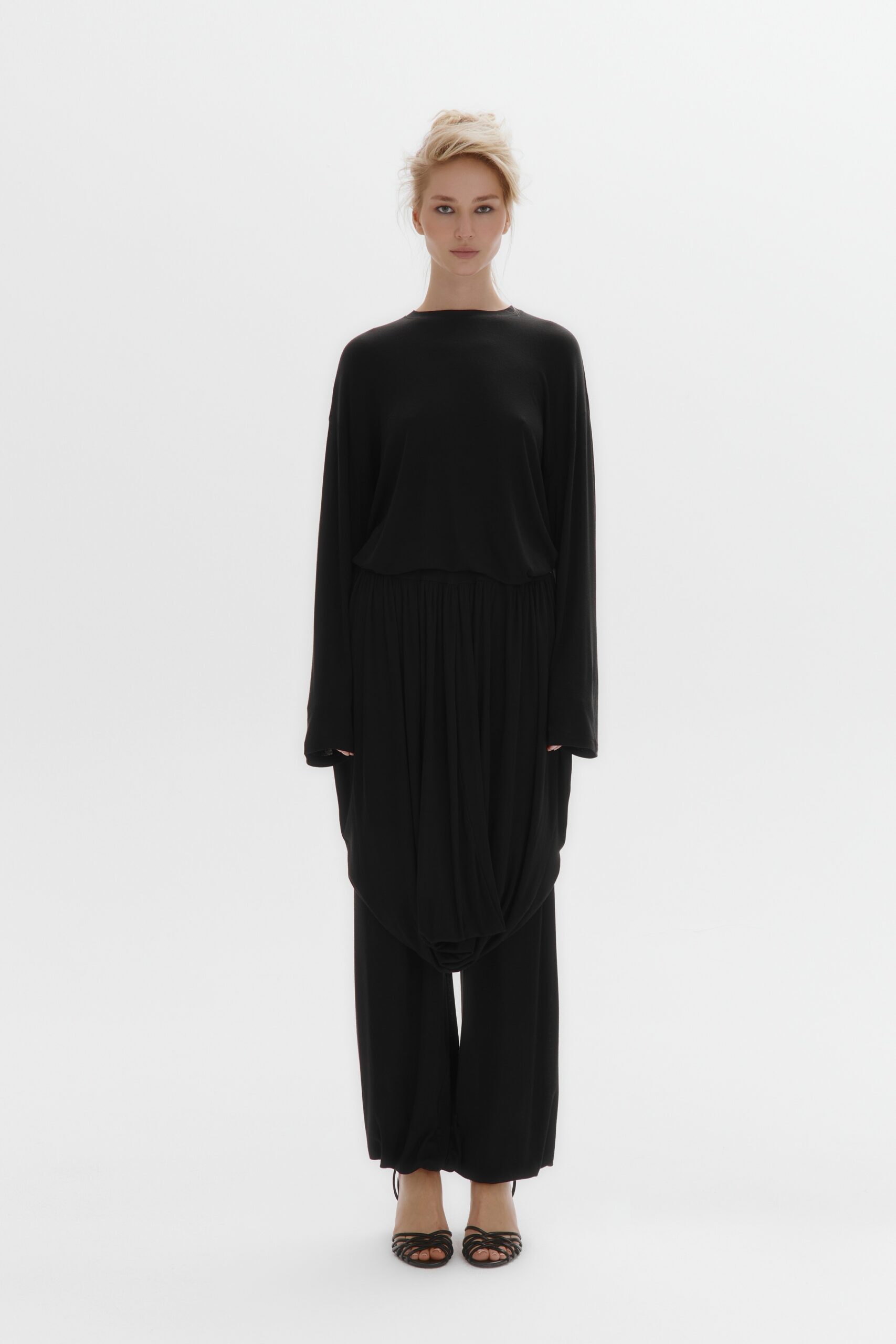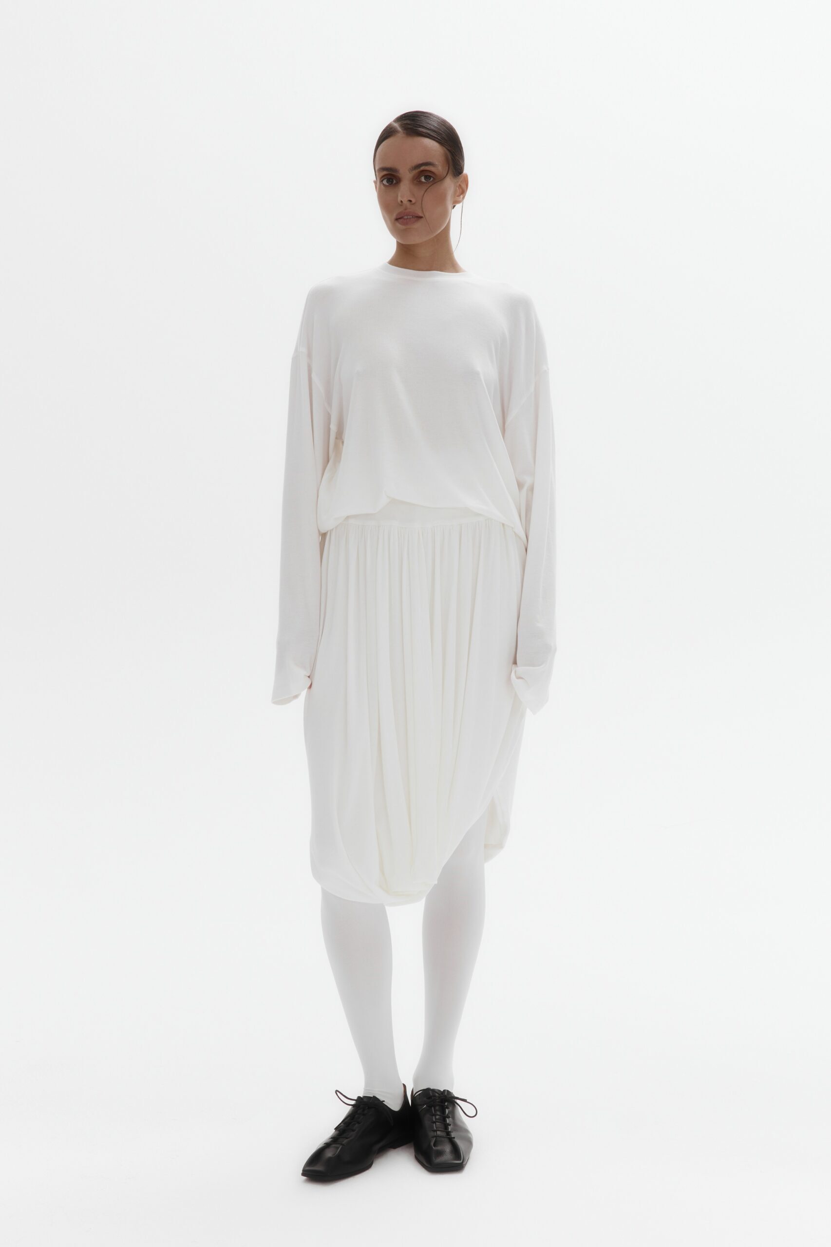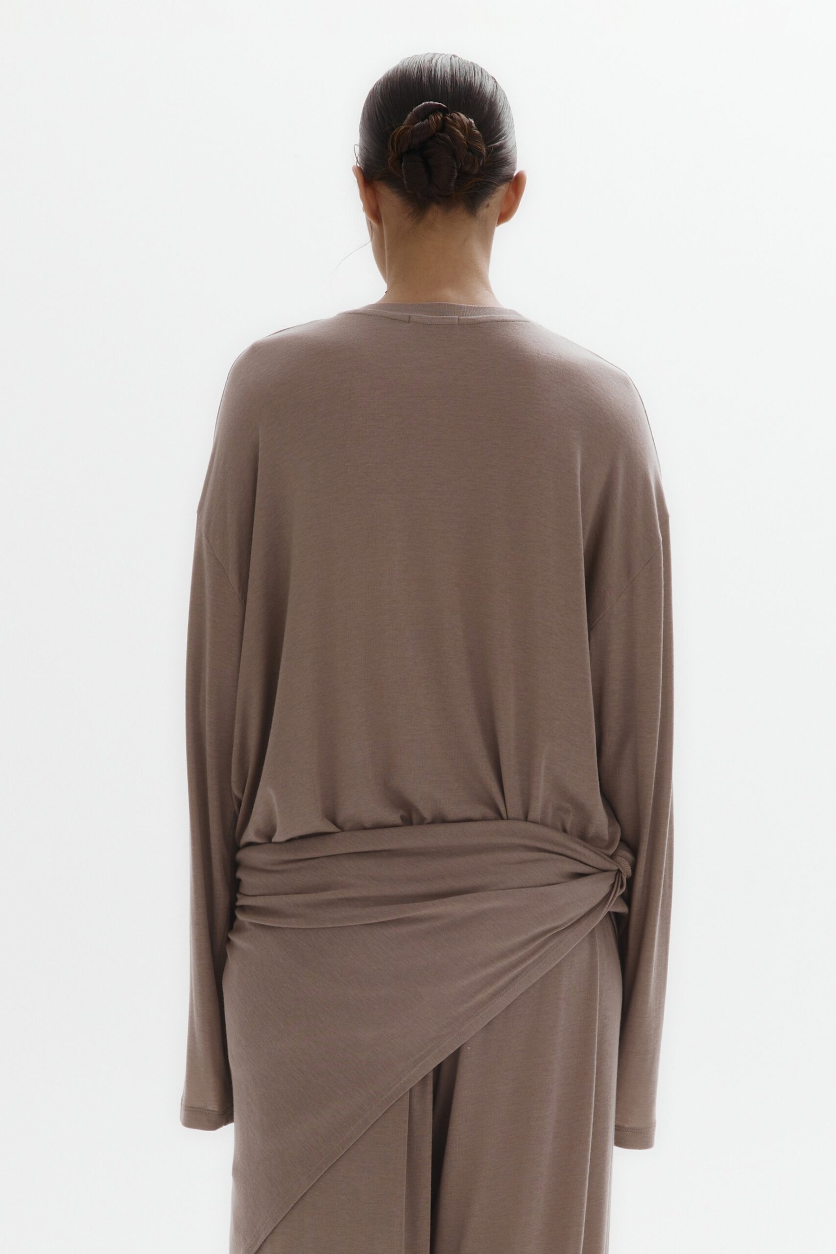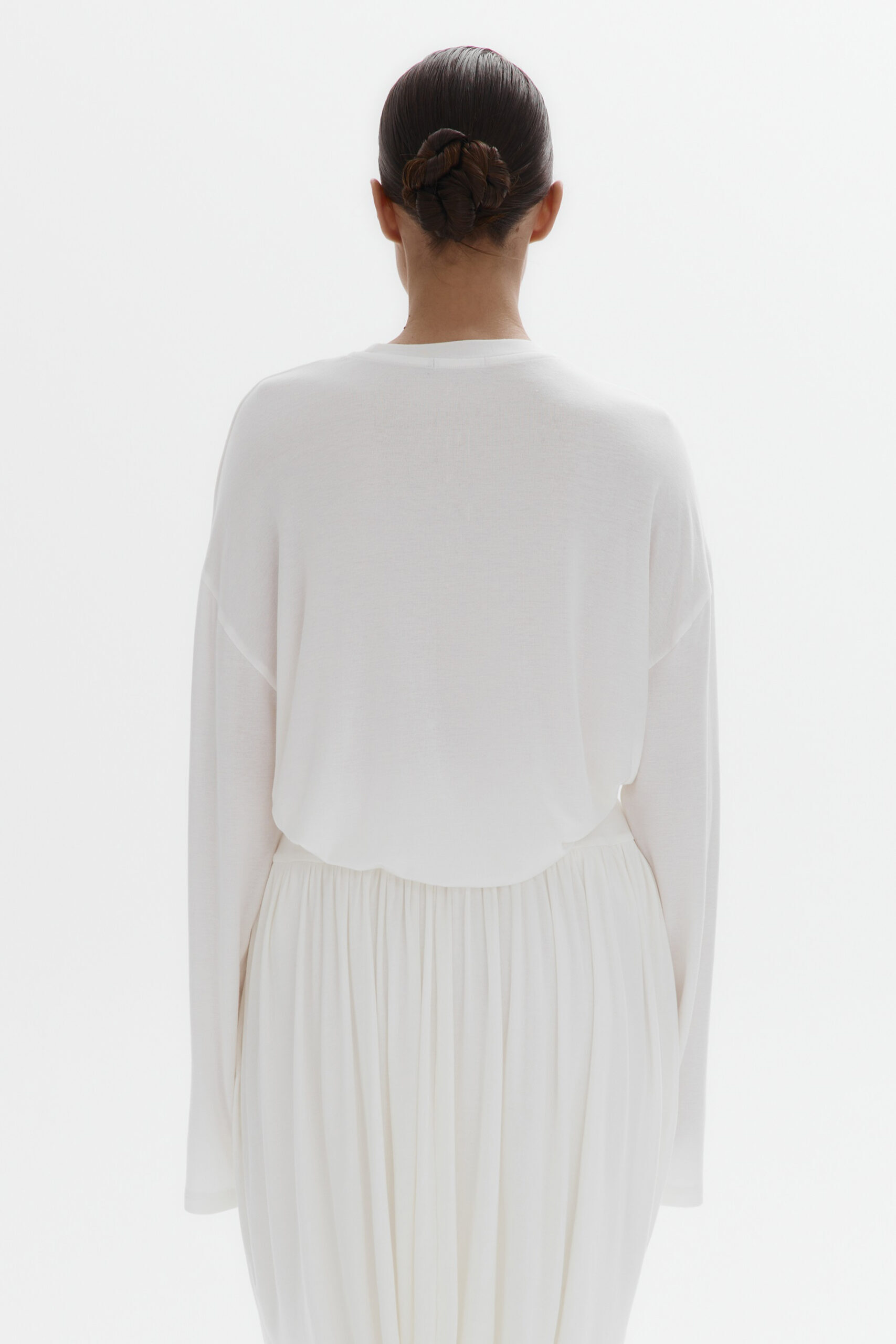 Удлиненный лонгслив свободного кроя из мягкого трикотажа с добавлением шерсти. Тонкая, слегка просвечивающая ткань обеспечивает комфорт и тепло, а универсальный дизайн делает его идеальной базой для повседневных образов.