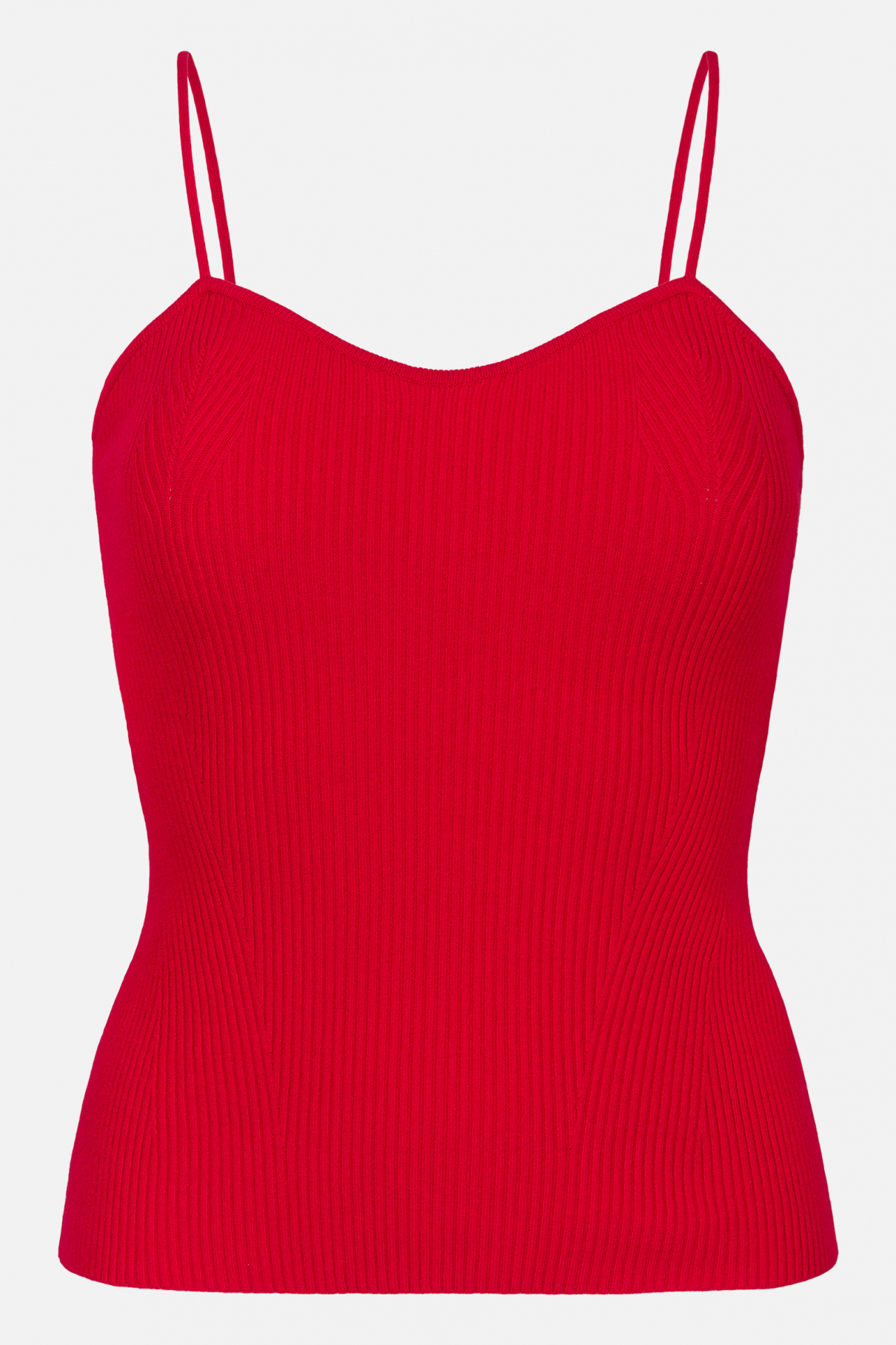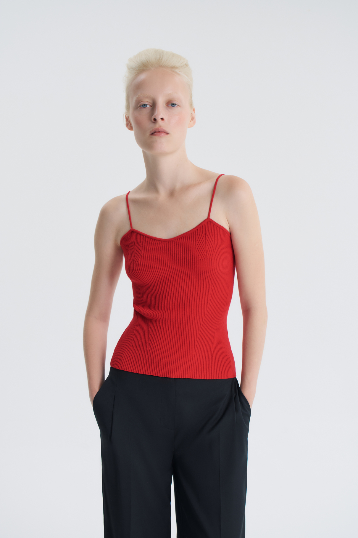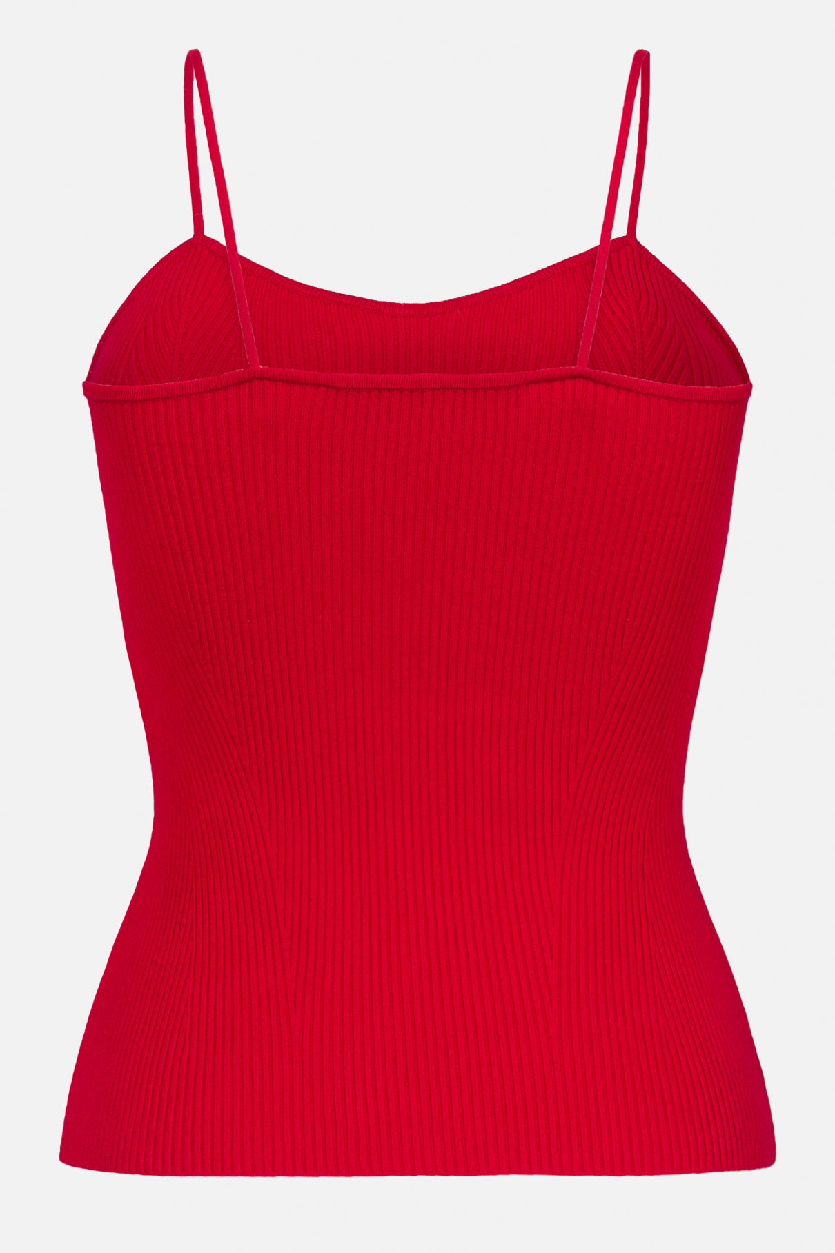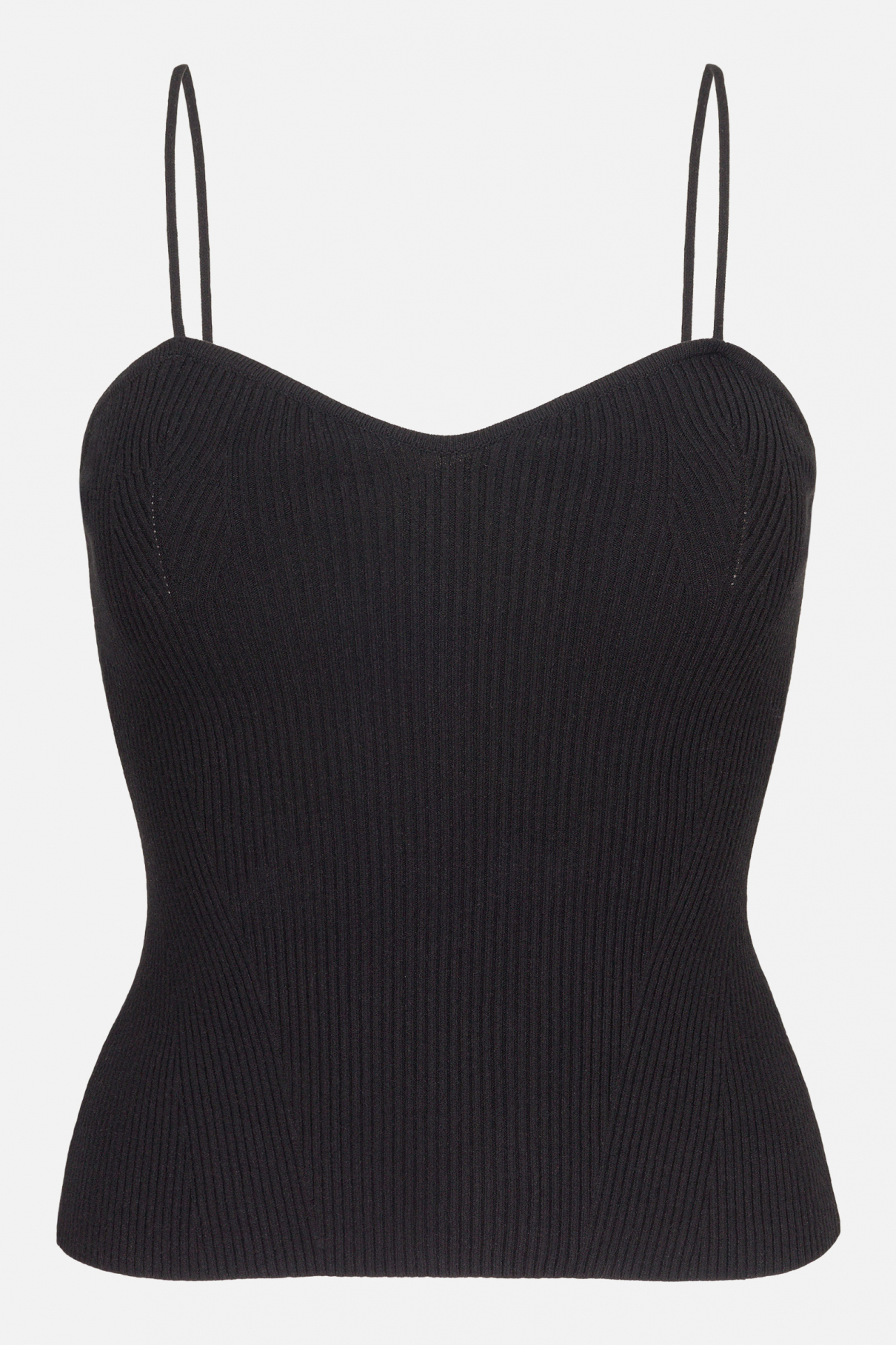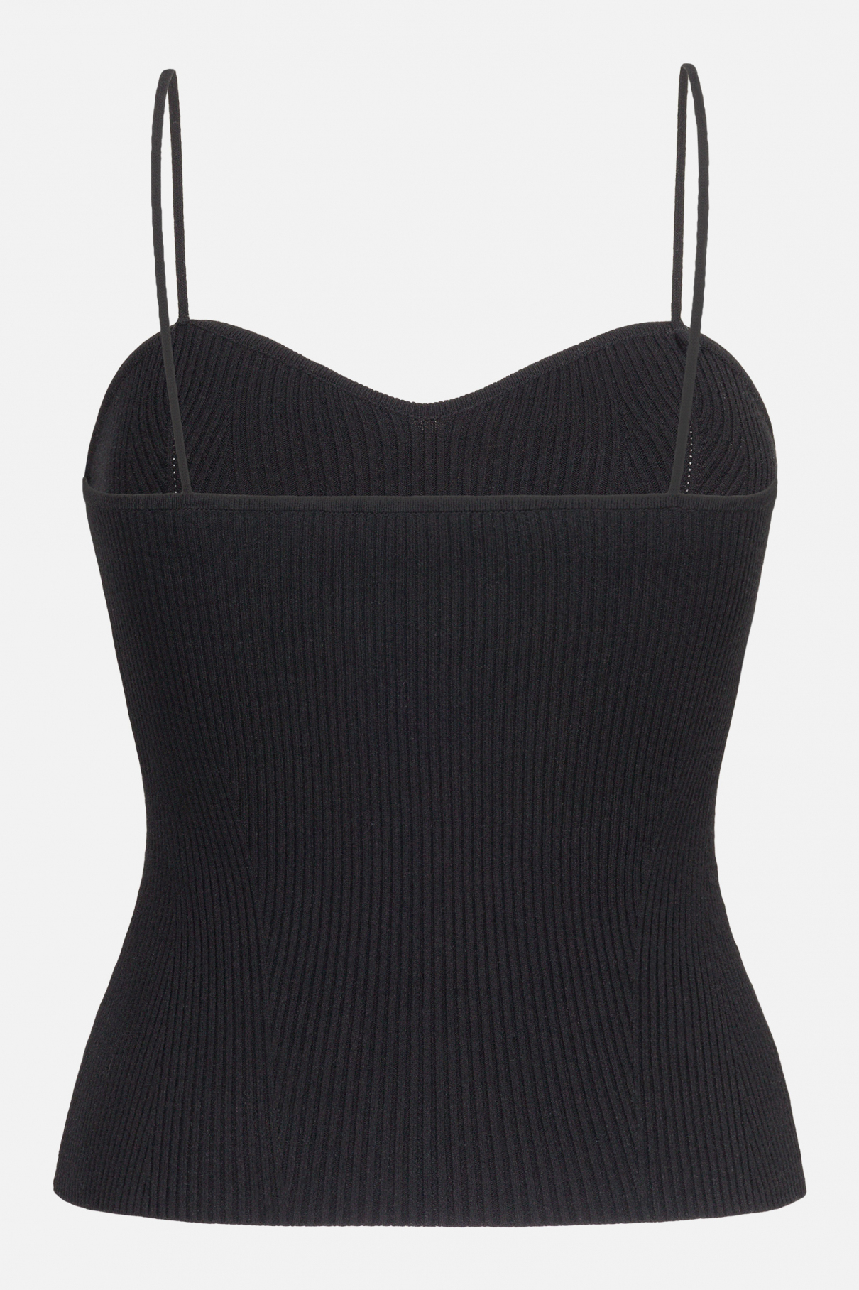 Трикотажный топ с фигурным вырезом можно носить без белья — плотная вязка со сложным геометрическим узором создает эффект корсетного облегания.