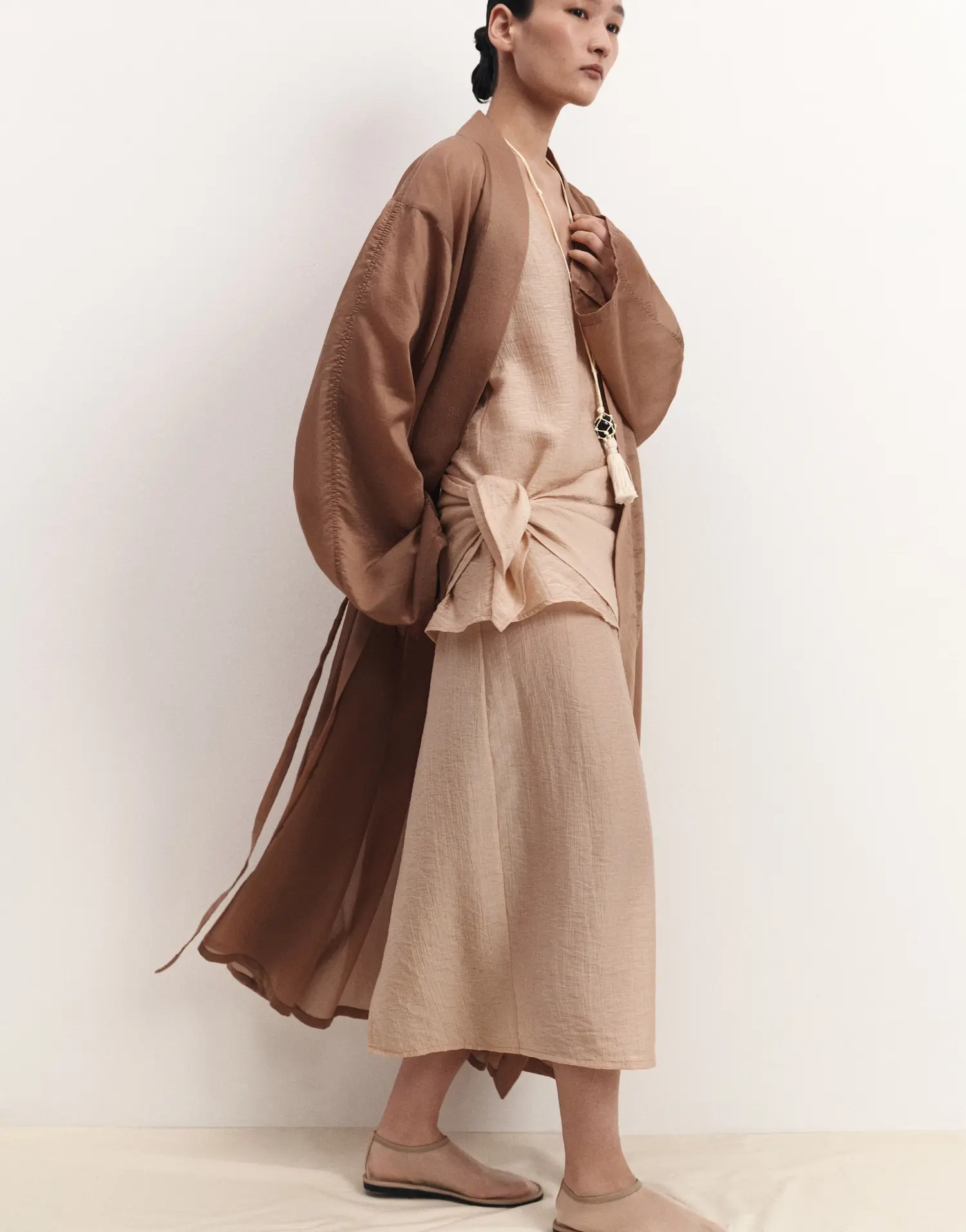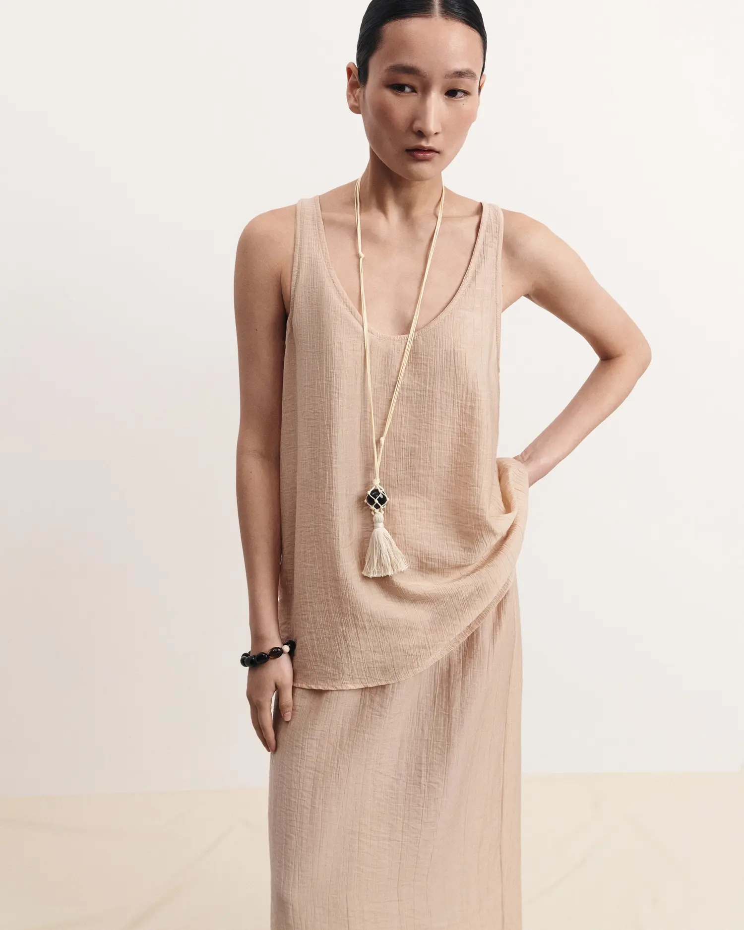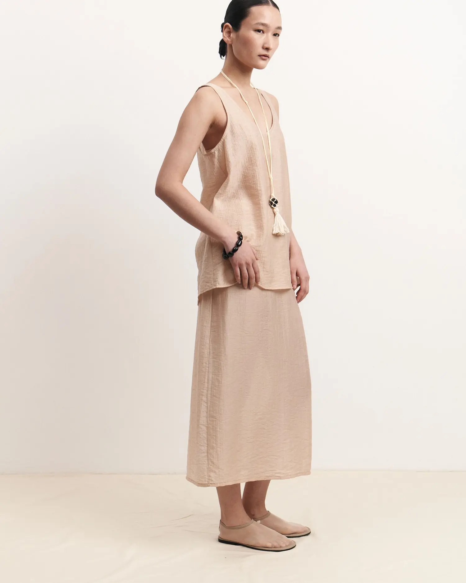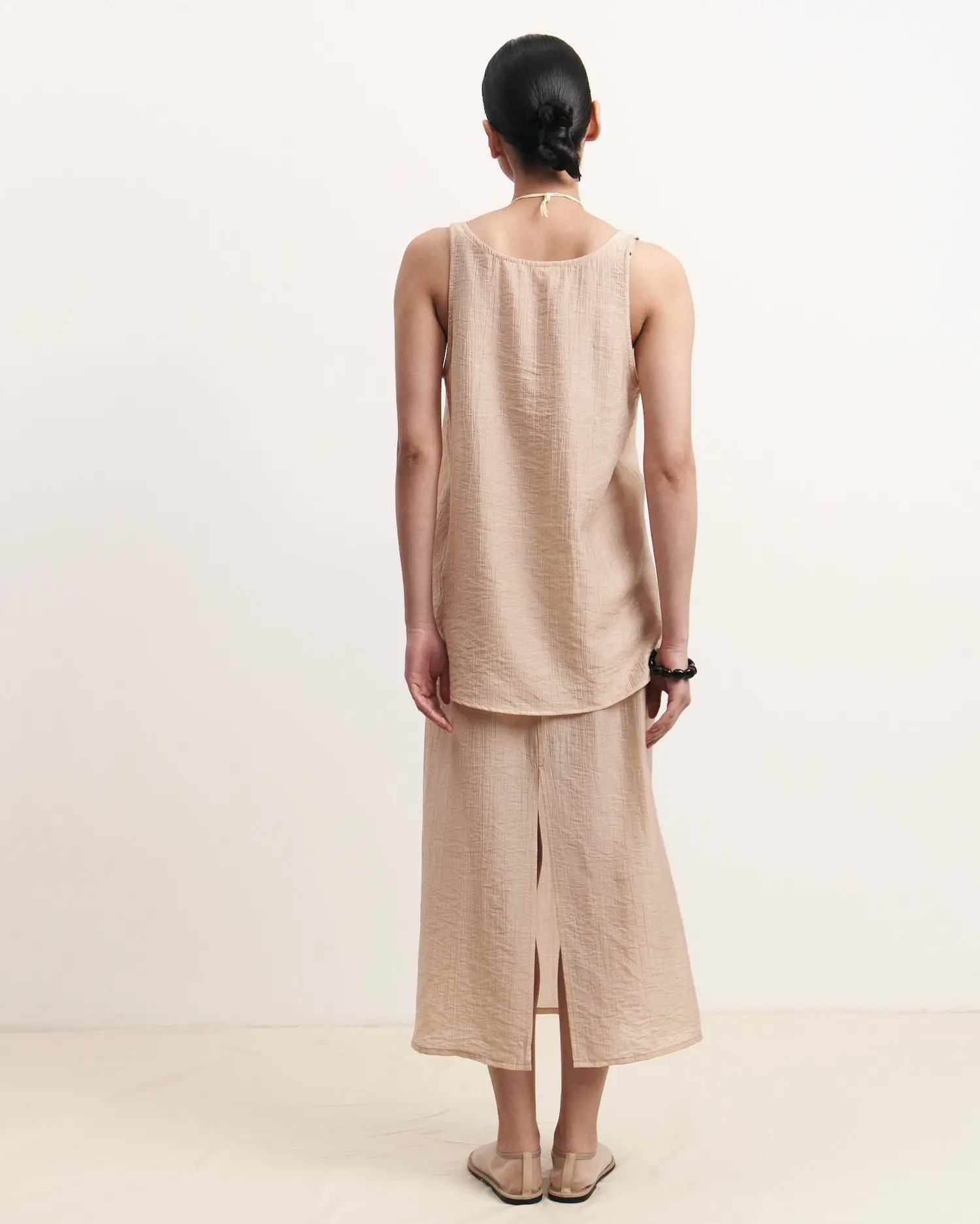 Топ из фактурного итальянского батиста — изысканный минимализм. Углубленный вырез мягко акцентирует линию ключиц, добавляя образу легкую чувственность без излишеств.