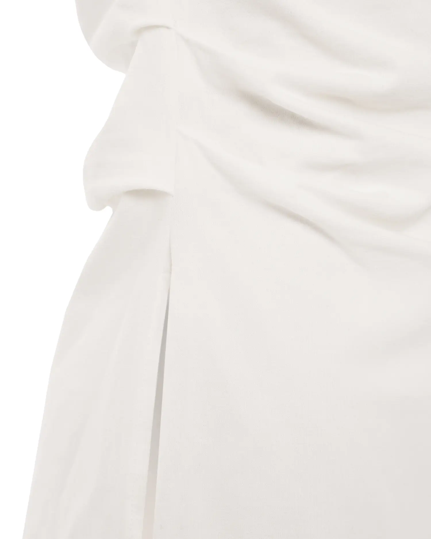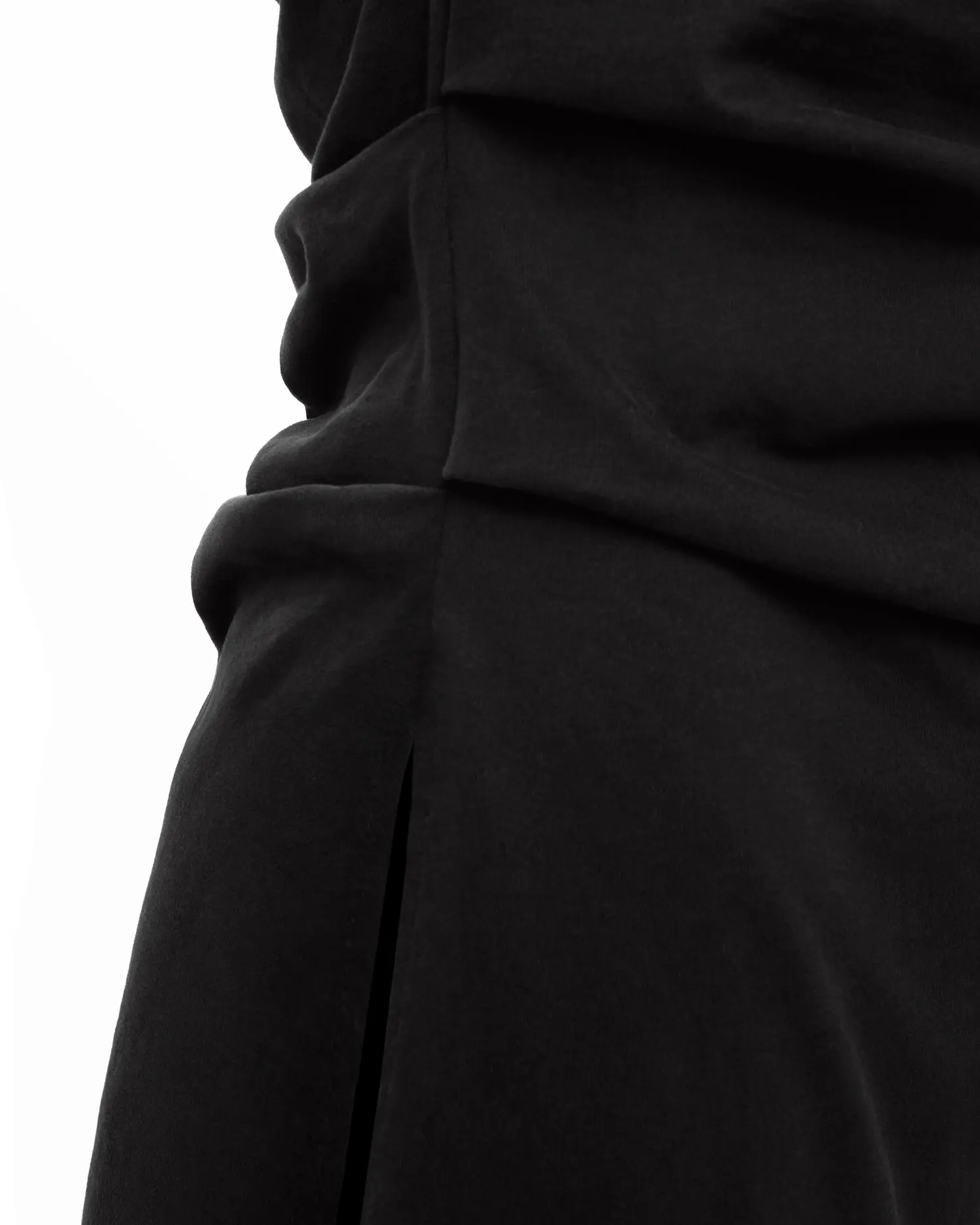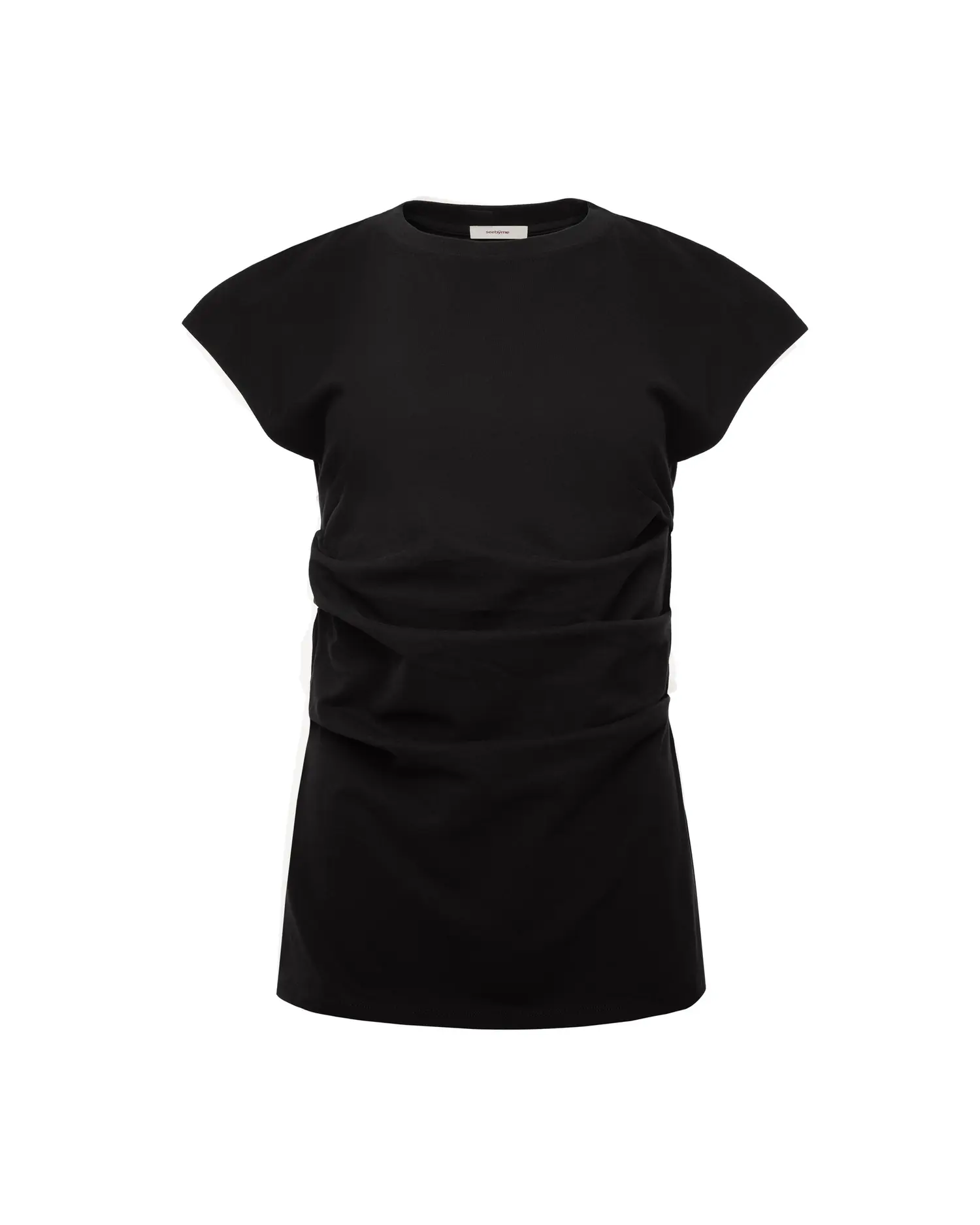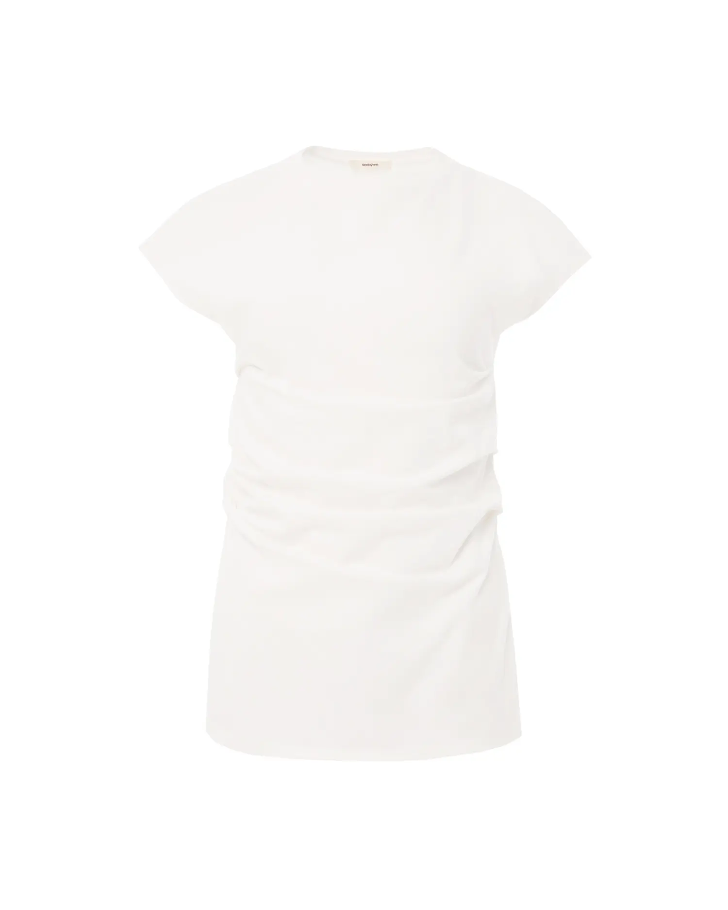 Топ из 100% хлопка с бархатным эффектом. Длина рукава позволяет комфортно чувствовать себя без дополнительного верхнего слоя, прикрывая плечи. Приталенный силуэт в тандеме с драпировками создают красивый силуэт, а разрезы в области бедер обеспечивают идеальную посадку