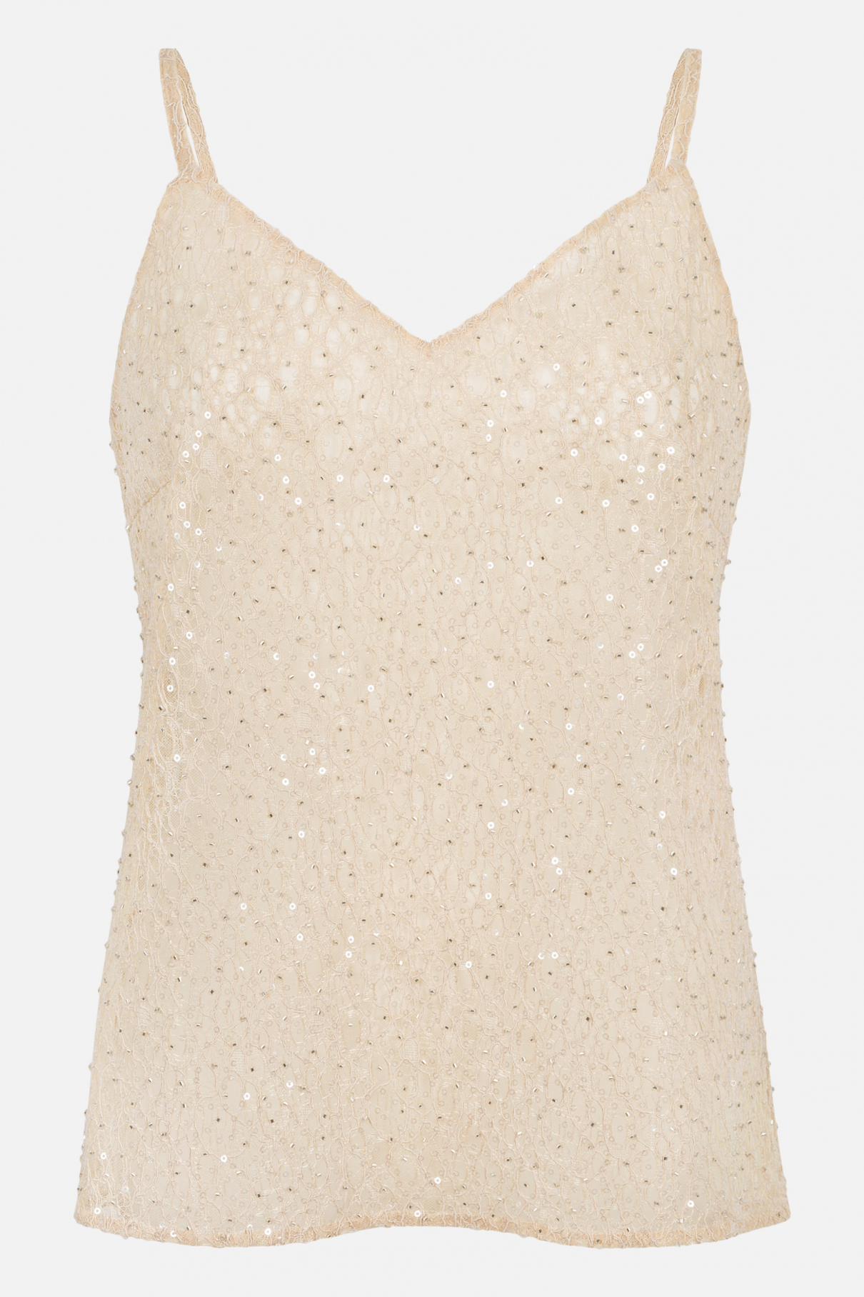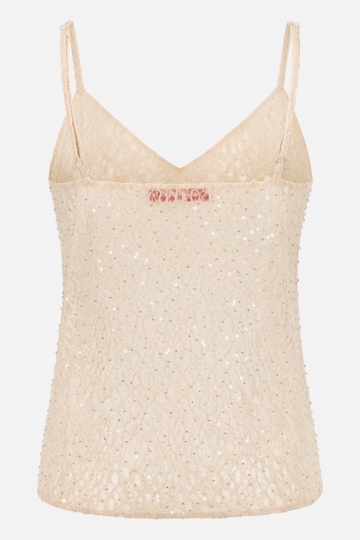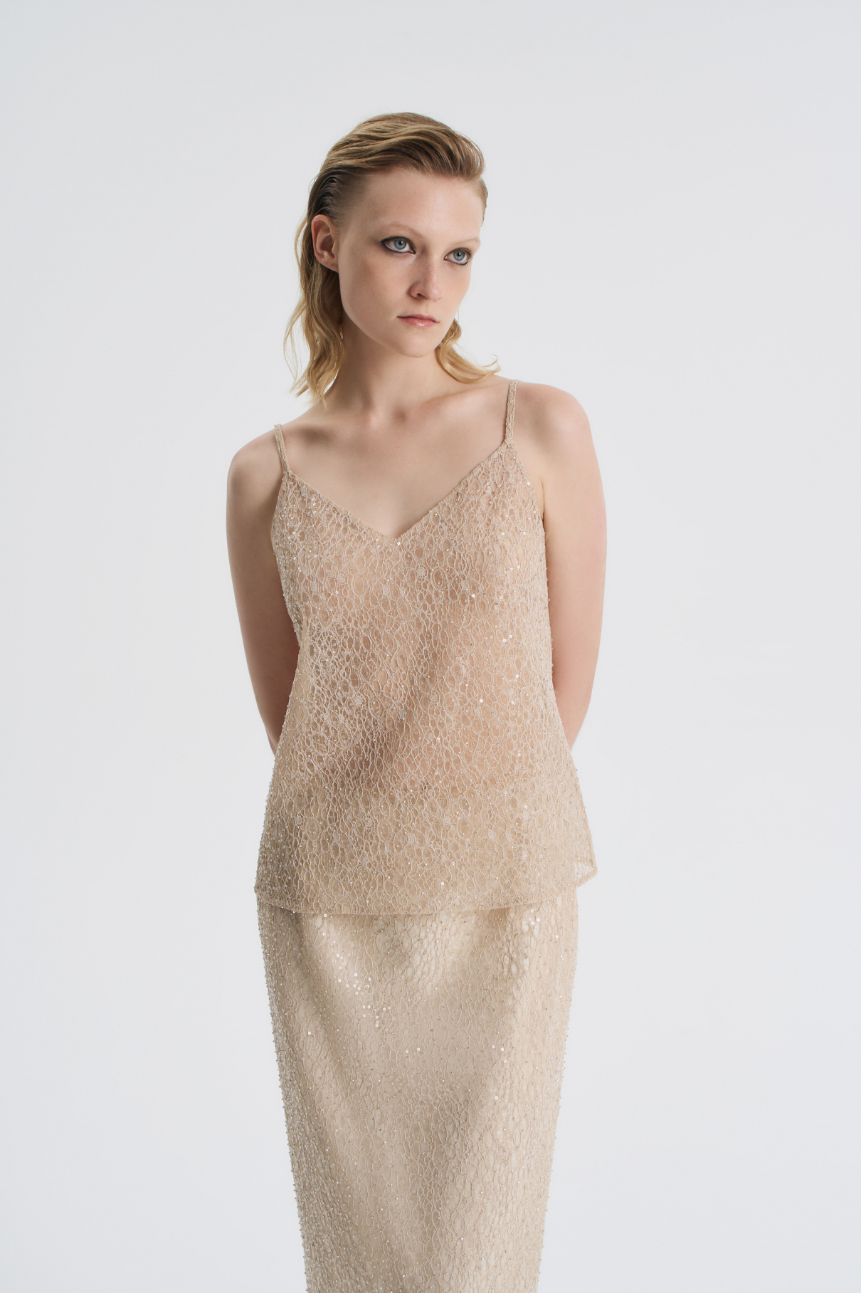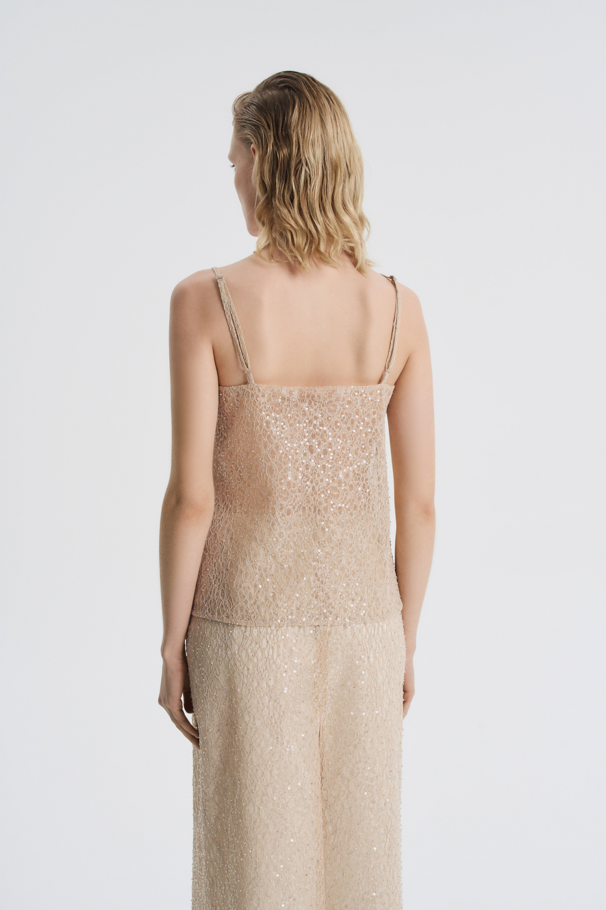 Сиять в свете софитов: топ из ткани, расшитой бисером и пайетками. Поверхность деликатно блестит и переливается, создавая эффект роскошного сияния. Регулируемые бретели обеспечивают комфортную посадку, а отсутствие подкладки добавляет изделию немного пикантности. Топ не просвечивает, но для большего комфорта носите его с накладками или бельем телесного цвета. Изделие ручной работы.