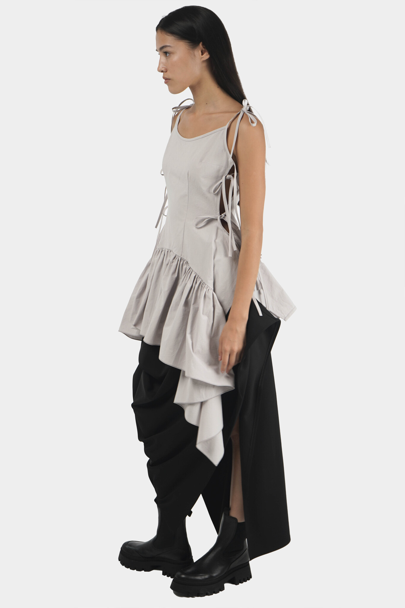 Топ на тонких лямках с завязками, декорирован большим воланом со складками по низу. Выполнен из вареного хлопка серо-бежевого оттенка.