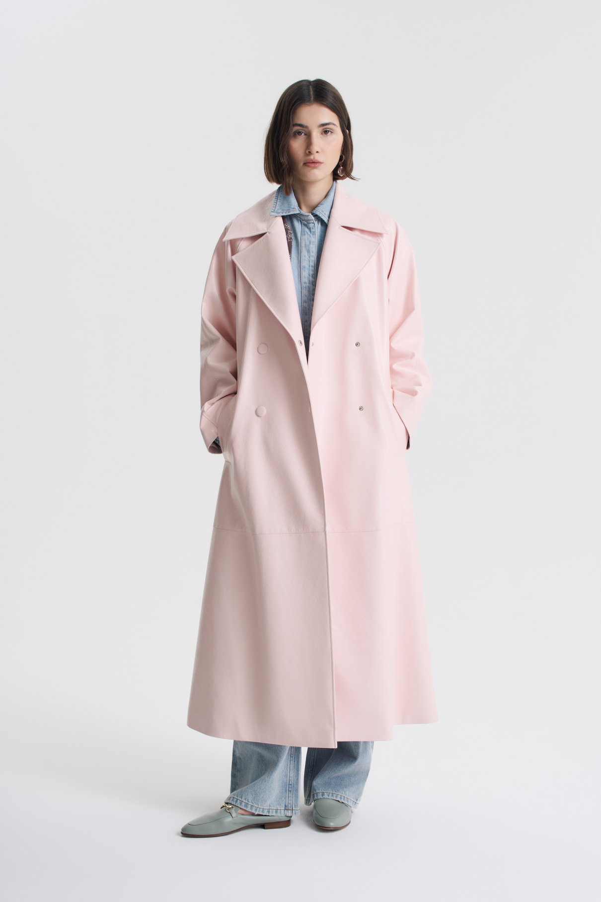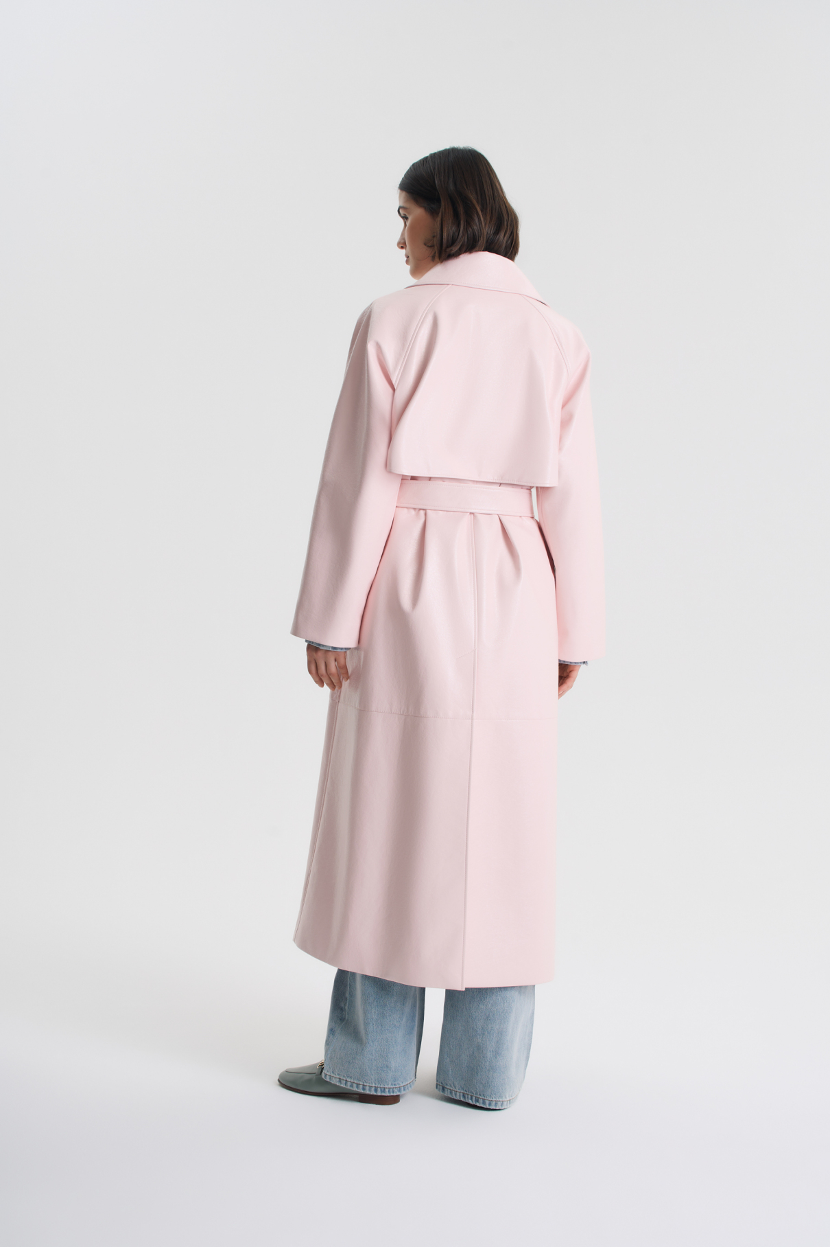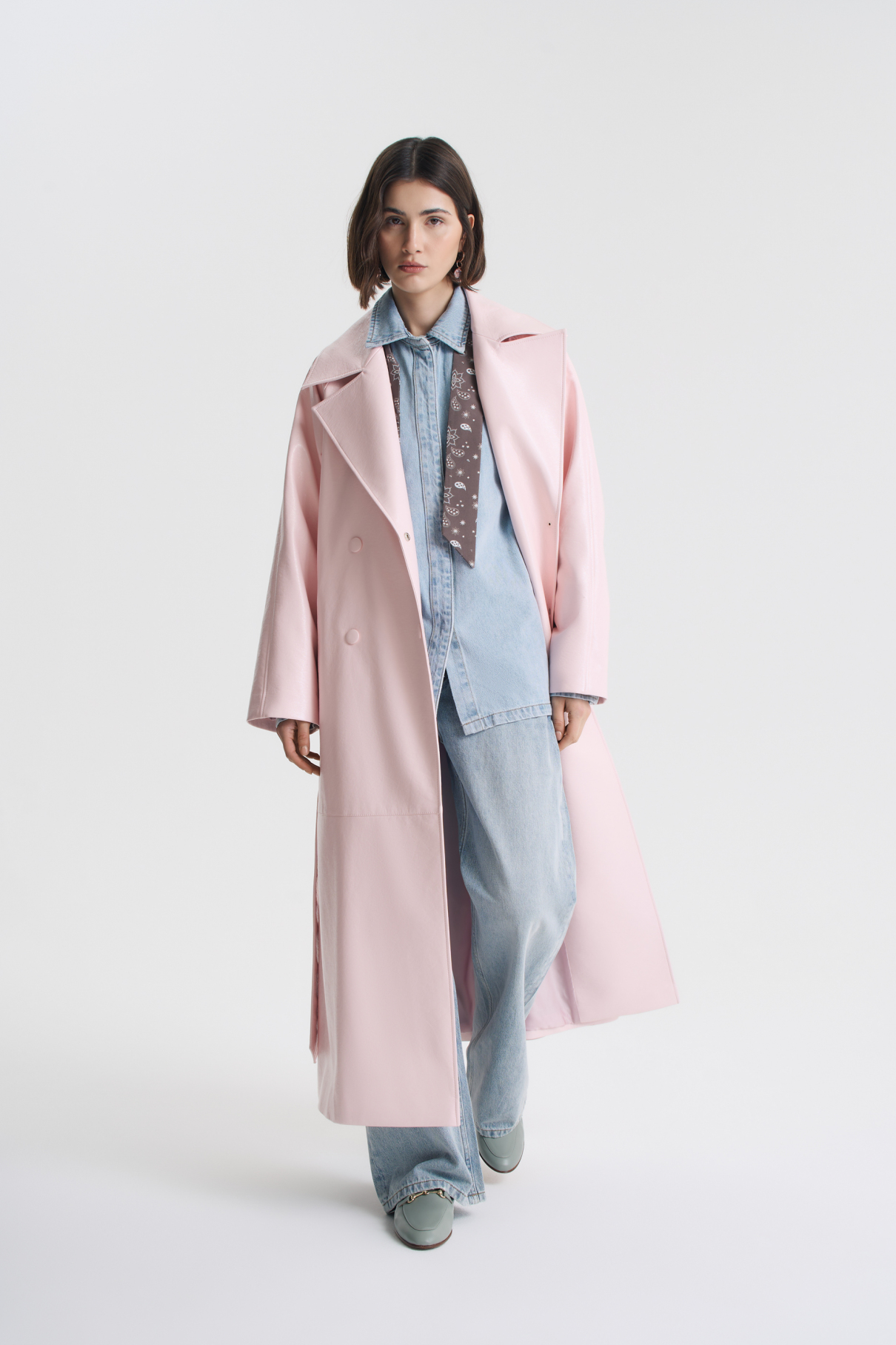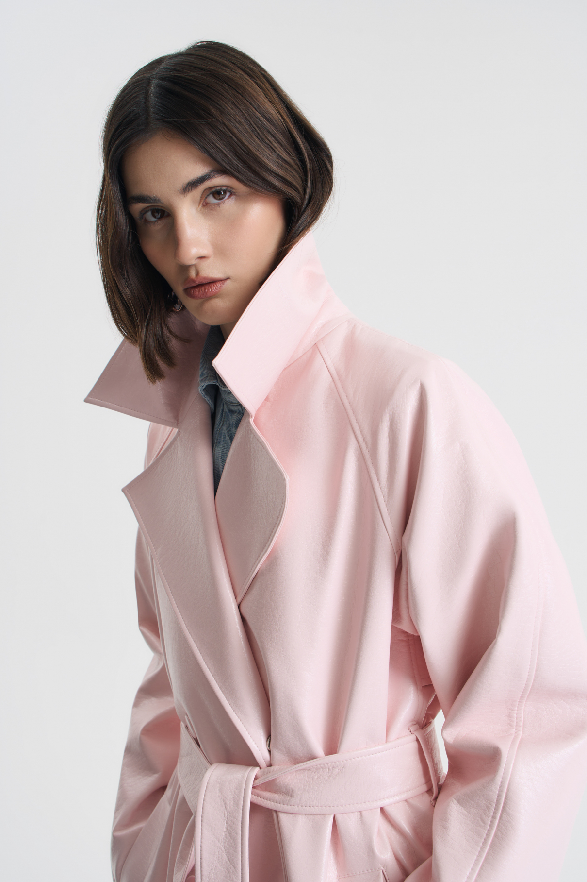 Нежность цветущей сакуры: наш тренч-бестселлер Hong Kong из экокожи с лаковым эффектом нового розового оттенка. Тренч можно носить как свободным, так и подчеркнуть талию съемным поясом. Широкий английский воротник, обтяжные пуговицы, карманы с клапаном и высокая шлица сзади — детали делают модель удобной и функциональной. Тренч на подкладке, внутренняя отделка дополнена контрастным кантом в диагональную полоску. Для создания нежных, но очень выразительных образов.
