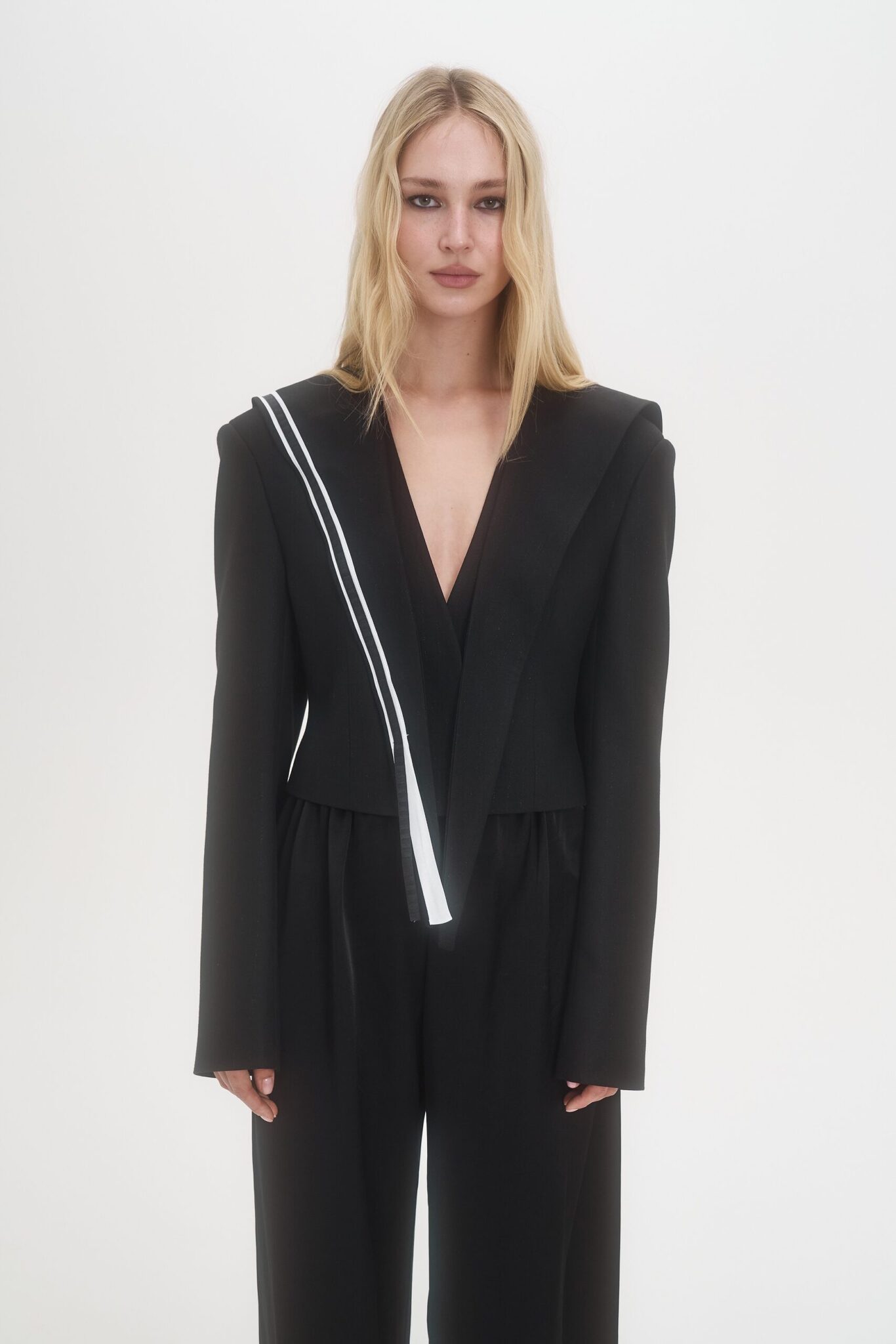 Укороченный приталенный жакет - это идеальное сочетание элегантности и современного стиля. V вырез, отсутствие лацканов и акцент на плечевой пояс - подчеркивают женственный силуэт, а укороченная длина добавляет образу легкости и динамичности. Жакет выполнен из высококачественной костюмной ткани, которая держит форму и придает изделию благородный блеск.
