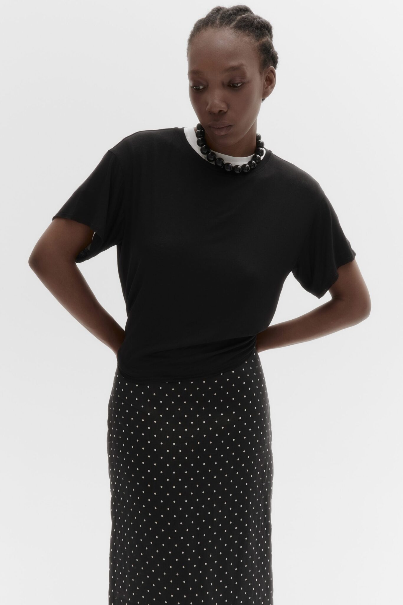 Полупрозрачная укороченная футболка из тонкого струящегося трикотажа - легкий и женственный вариант с мягким драпирующим эффектом.