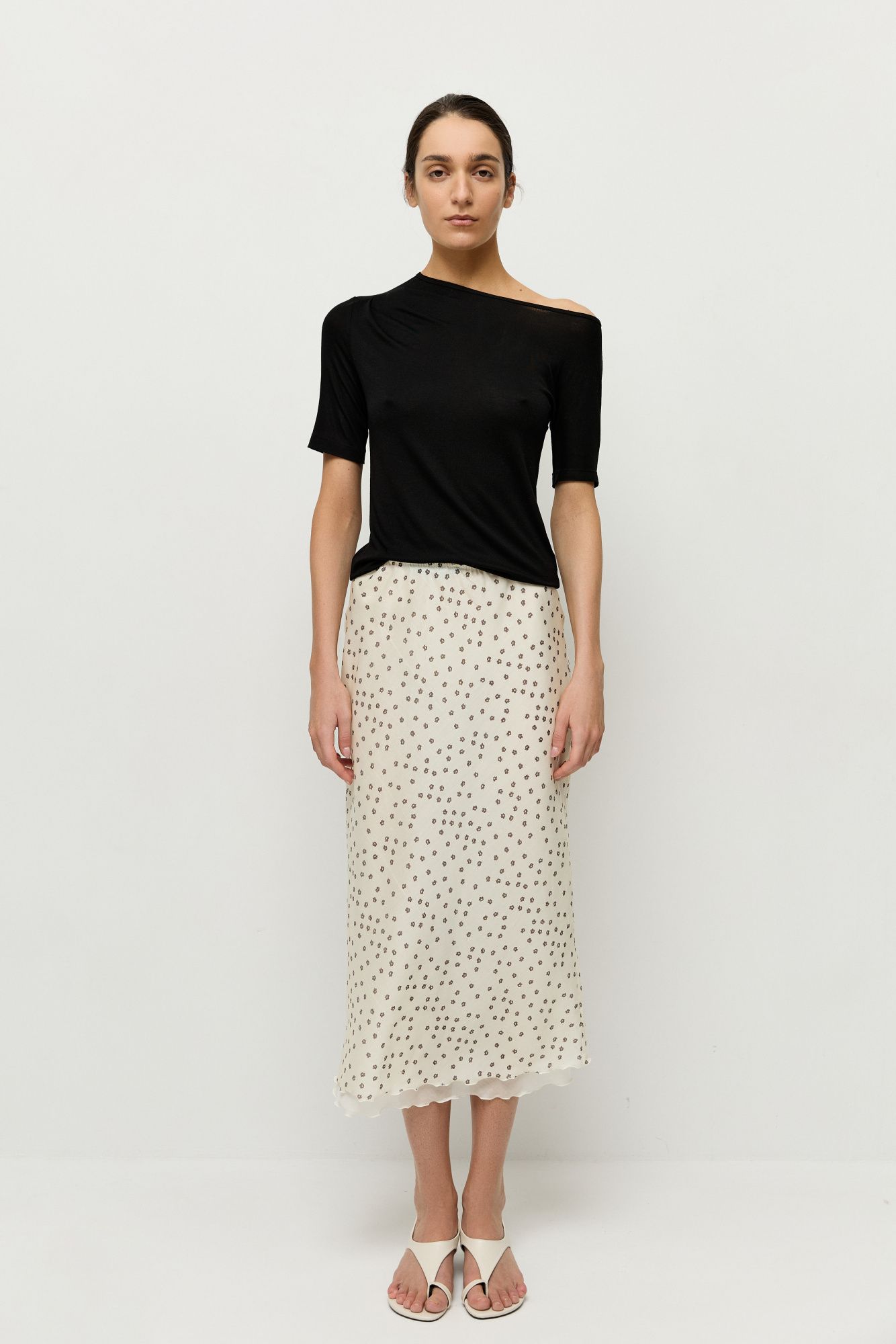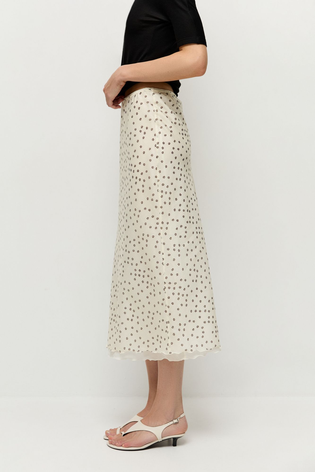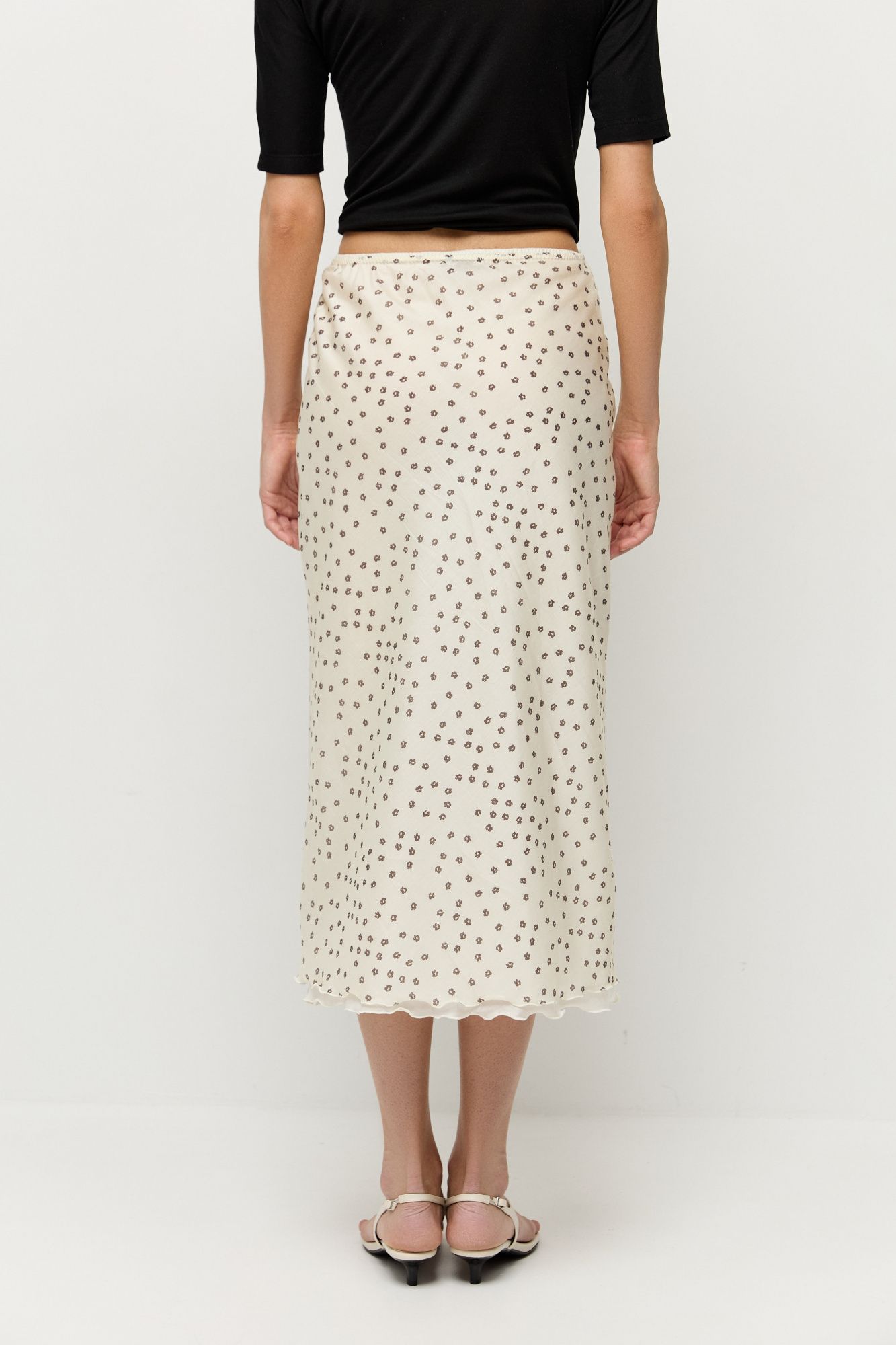 Юбка 2 в 1 — комплект из двух: нижняя однотонная, верхняя — с авторским принтом в виде цветов. Оба слоя юбки сшиты из полупрозрачного тенсела.