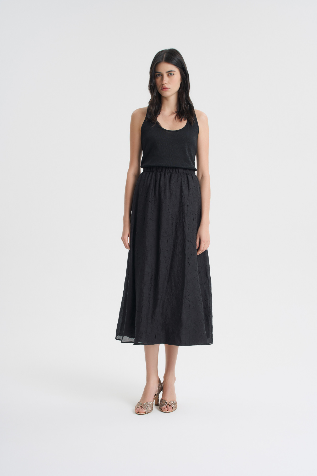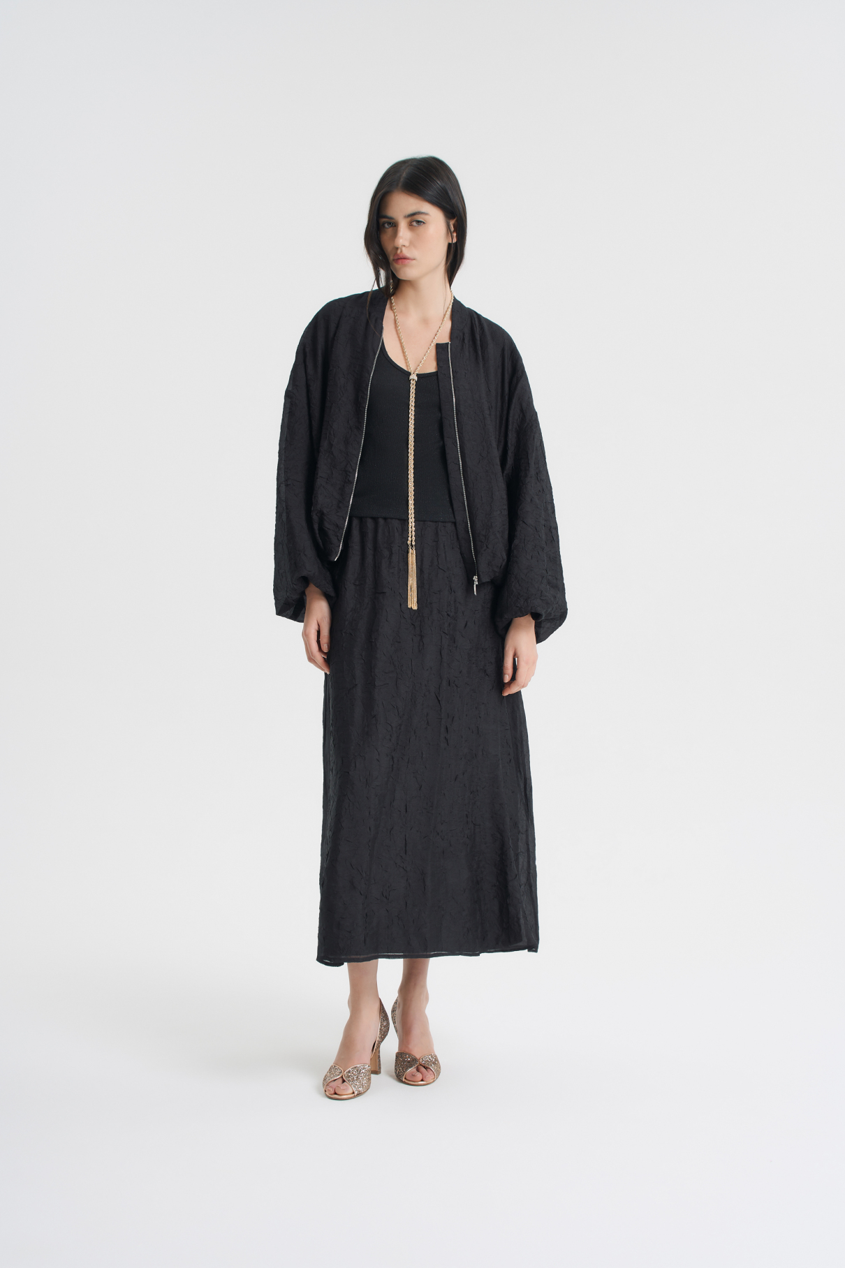 Легкая и воздушная юбка из жатой вискозы добавит романтичности и богемного шика любому образу. Благодаря поясу на мягкой резинке юбка очень комфортно ощущается на талии. Лаконичный А-силуэт и длина макси позволяют легко сочетать ее с изделиями в разных стилях. В комбинации с бомбером из жатой вискозы юбка образует красивый комплект. Изделие представлено в нежном-голубом и черном цветах.