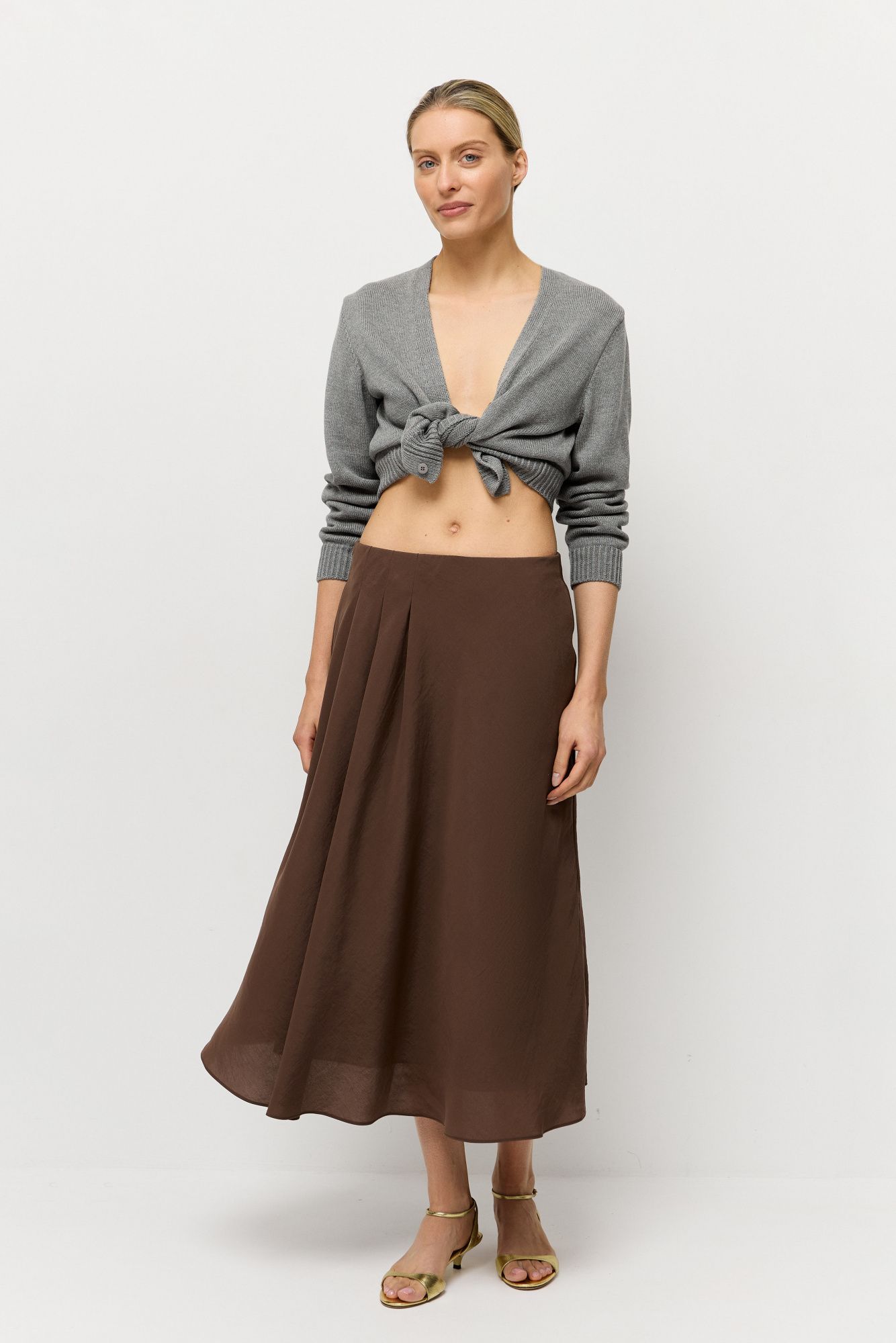 Юбка-миди сшита из купры с жатым эффектом. Это редкий вид натуральной вискозы высокого качества, легкой и нежной на ощупь ткани.
