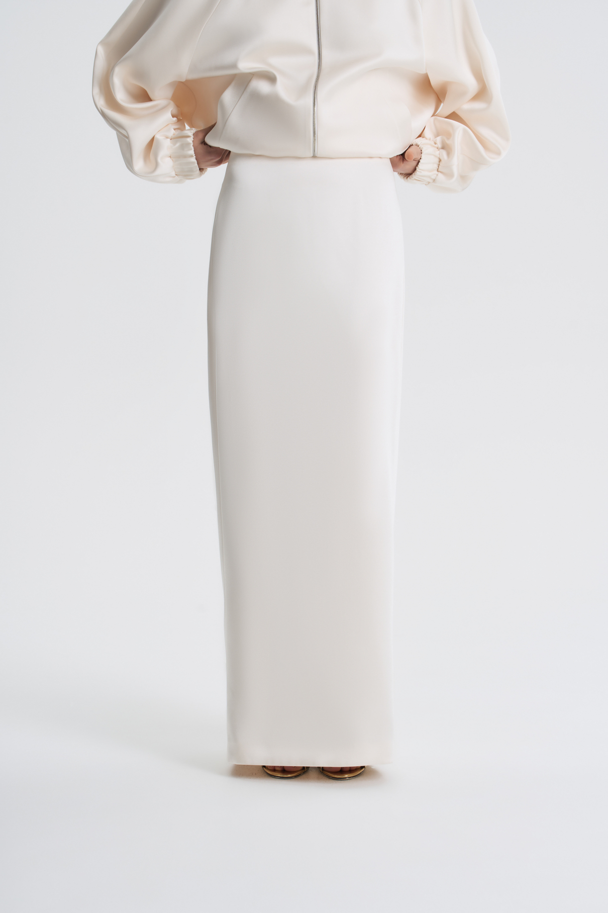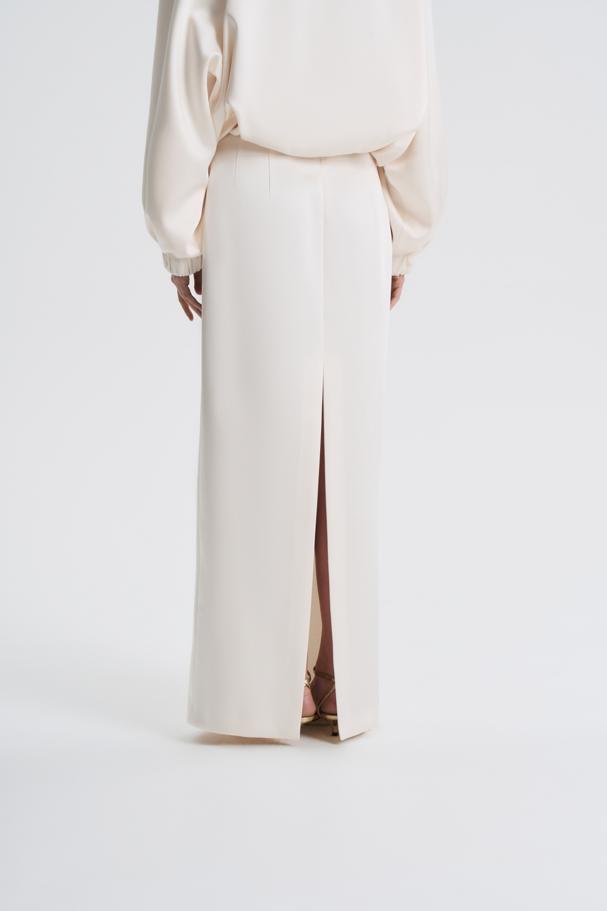 Юбка макси из плотного итальянского атласа завораживает чистотой линий. Благодаря идеально гладкому переднему полотнищу без швов и рельефов создается изысканный вытянутый силуэт. Все конструктивные элементы скрыты на спинке: 4 вытачки и потайная молния в среднем шве с разрезом. Юбка рассчитана на стилизацию с каблуком (доступна в двух ростовках — 164 см и 170 см). Если вы хотите сочетать юбку с обувью на плоском ходу, рекомендуем примерить юбку на меньший рост. Изделие мягко облегает фигуру и стройнит, а пластичная, но при этом плотная ткань выглядит идеально гладкой даже в светлом молочном оттенке. Универсальная модель для особых случаев.