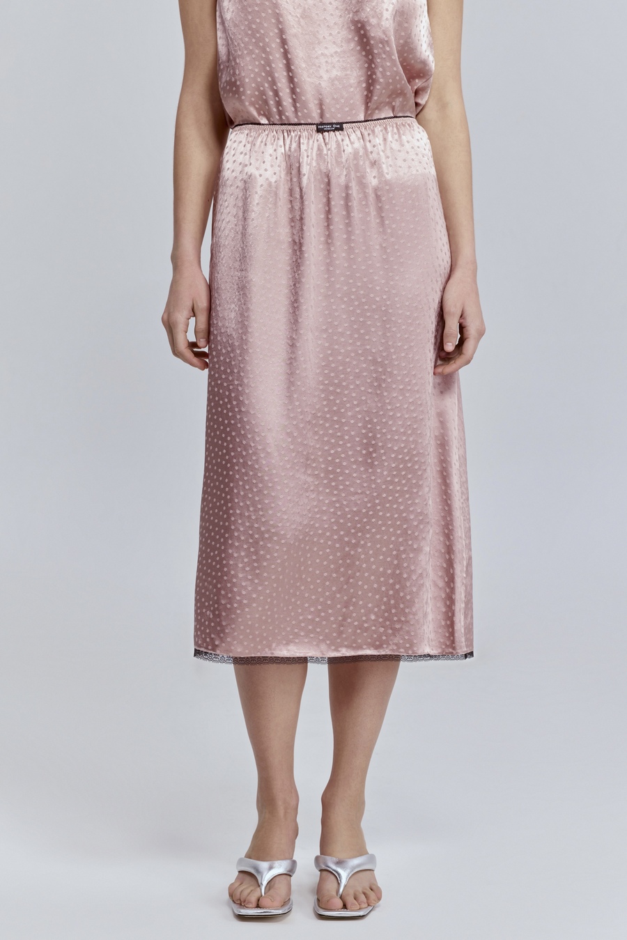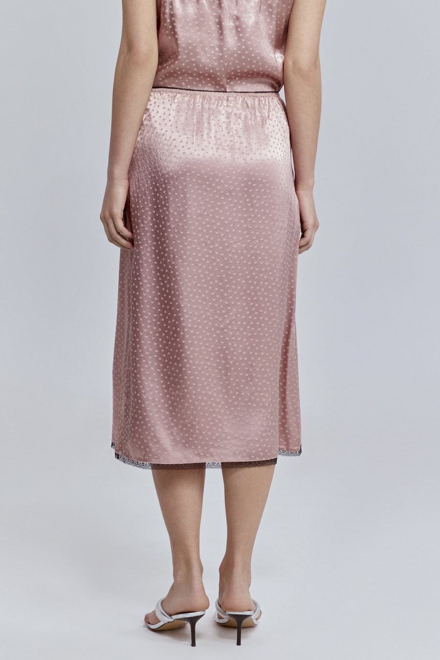 Атласная юбка с кружевом — тот самый акцент, который делает образ запоминающимся. Гладкая, текучая фактура мягко отражает свет и красиво движется при каждом шаге, а изящное кружево по низу добавляет образу нотку чувственности и утончённой дерзости.