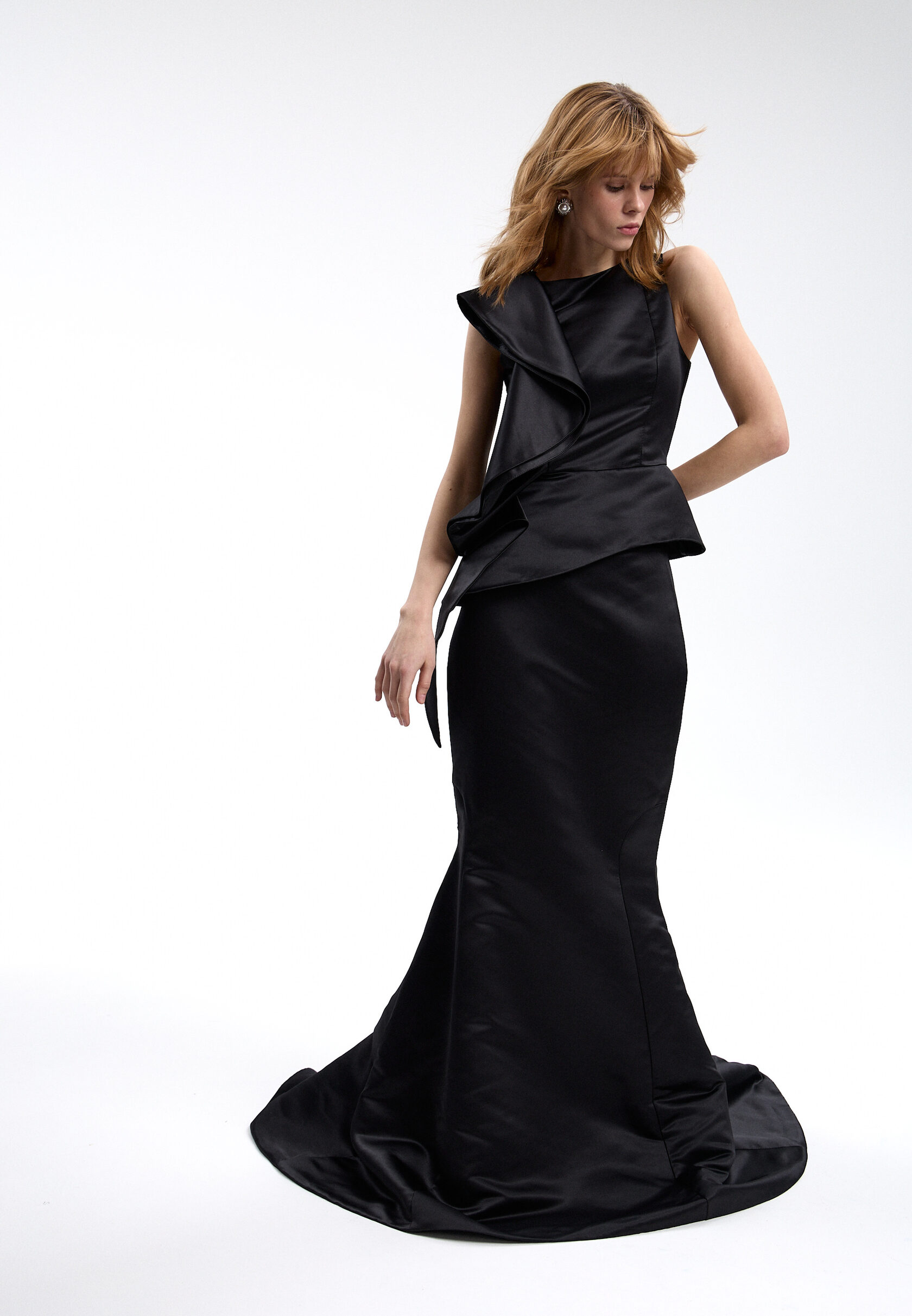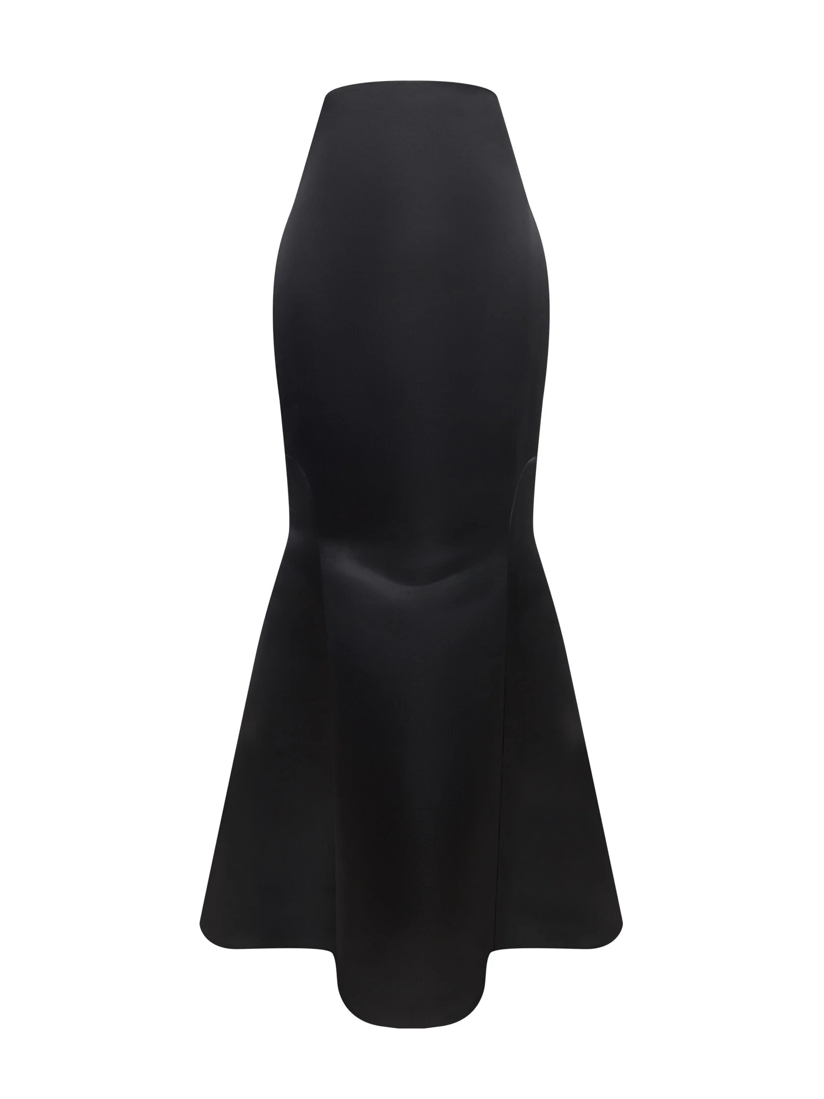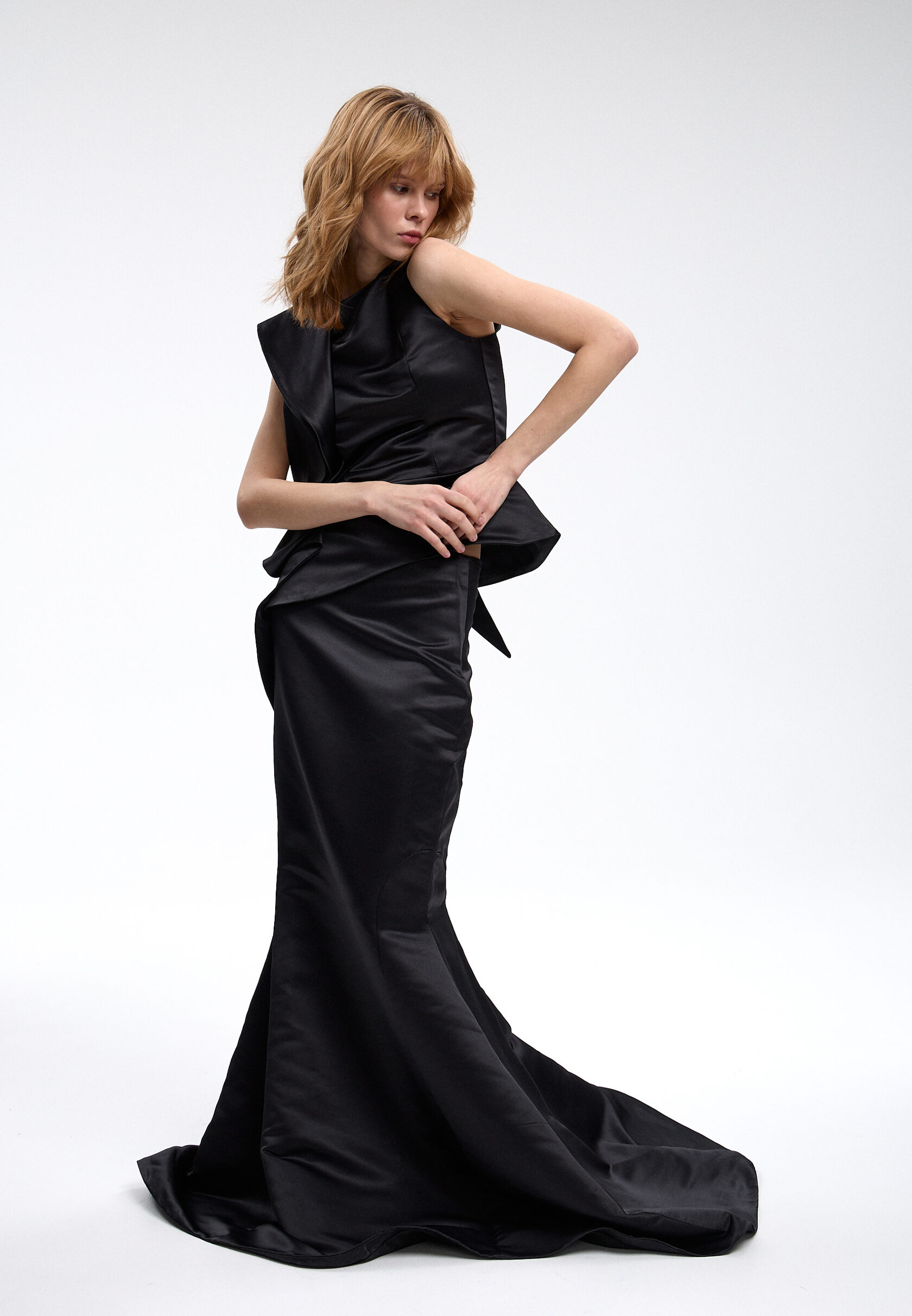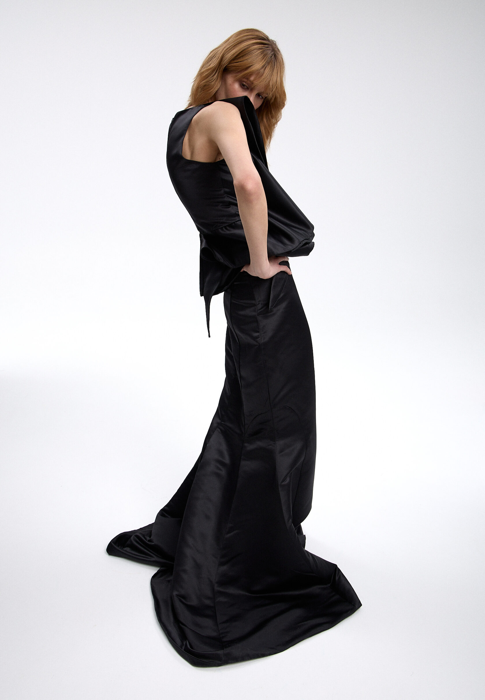 Юбка длинная расклешенная годэ средней посадки из итальянского плотного атласа с шифоновым подкладом.