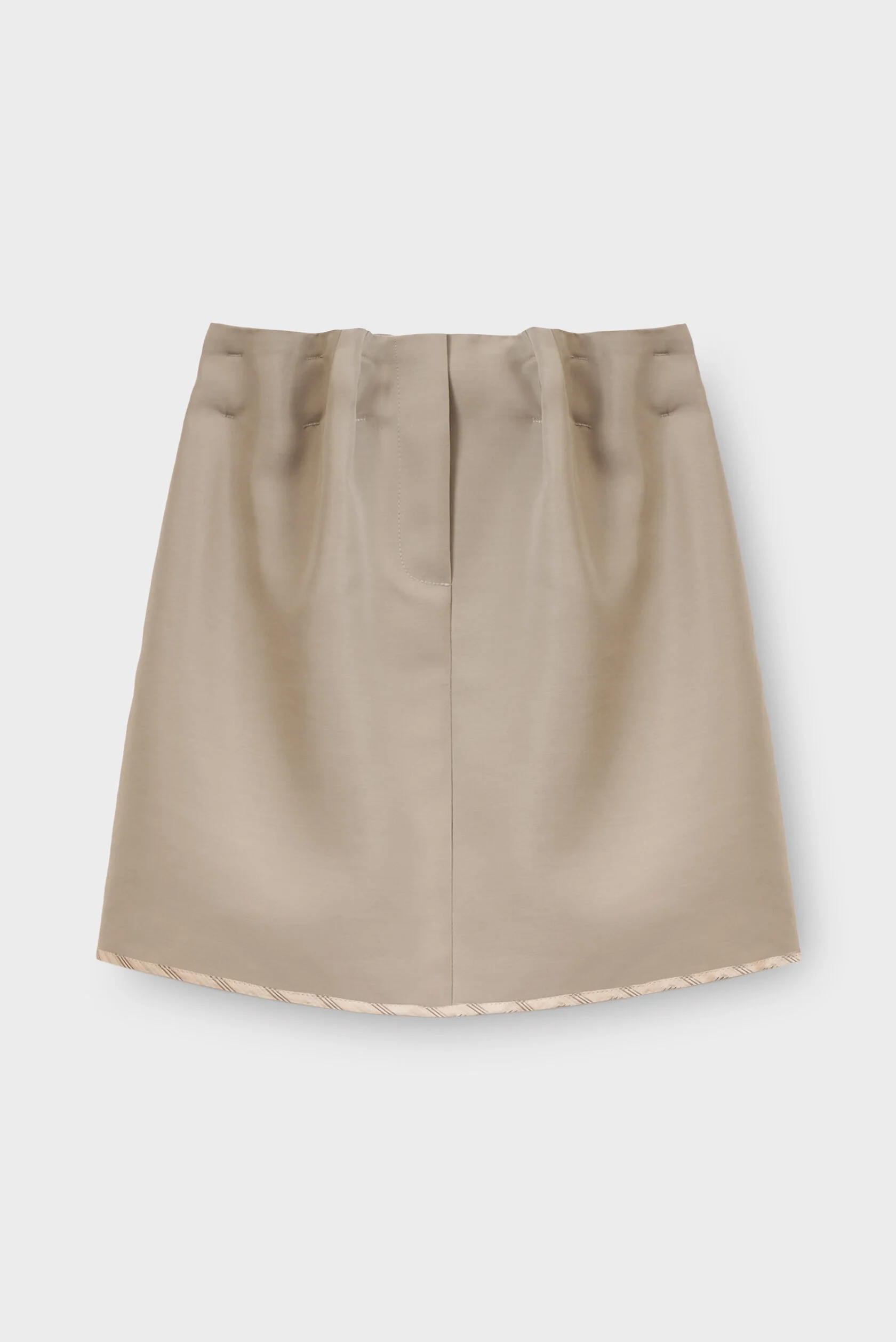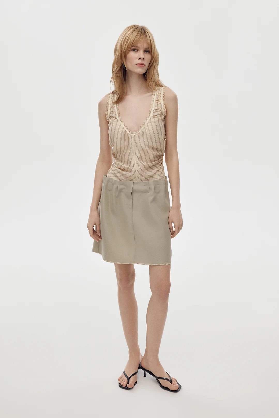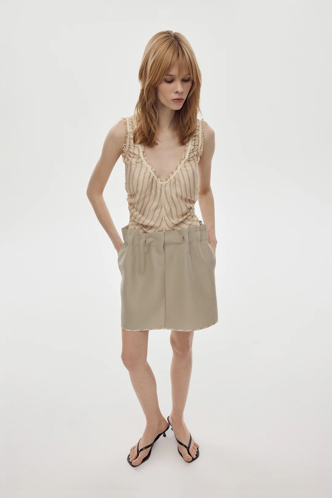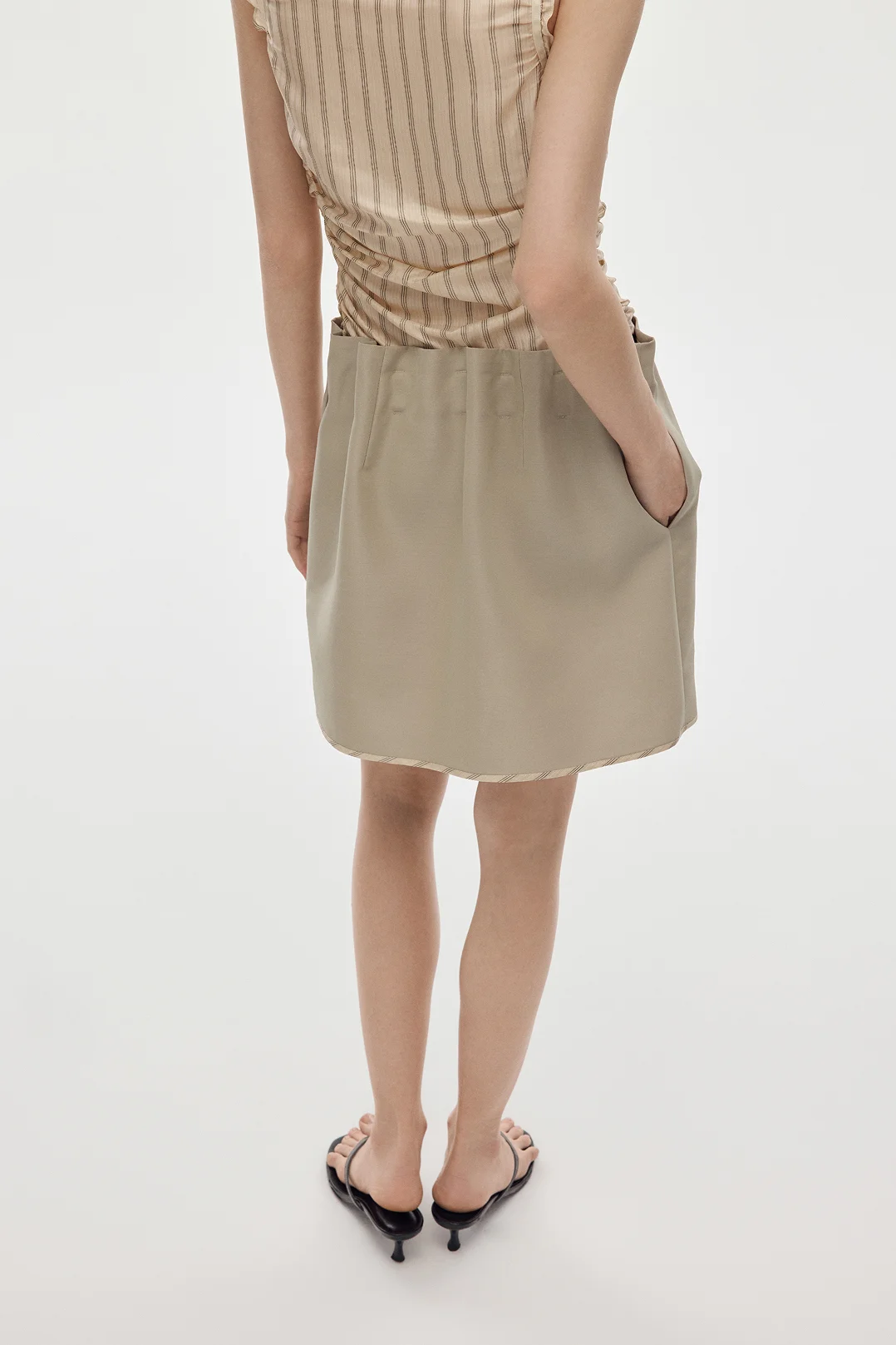 Силуэт намеренно отдалён от тела — он не повторяет фигуру, а выстраивает собственную геометрию. За счёт этого юбка выглядит скульптурно и одновременно легко.