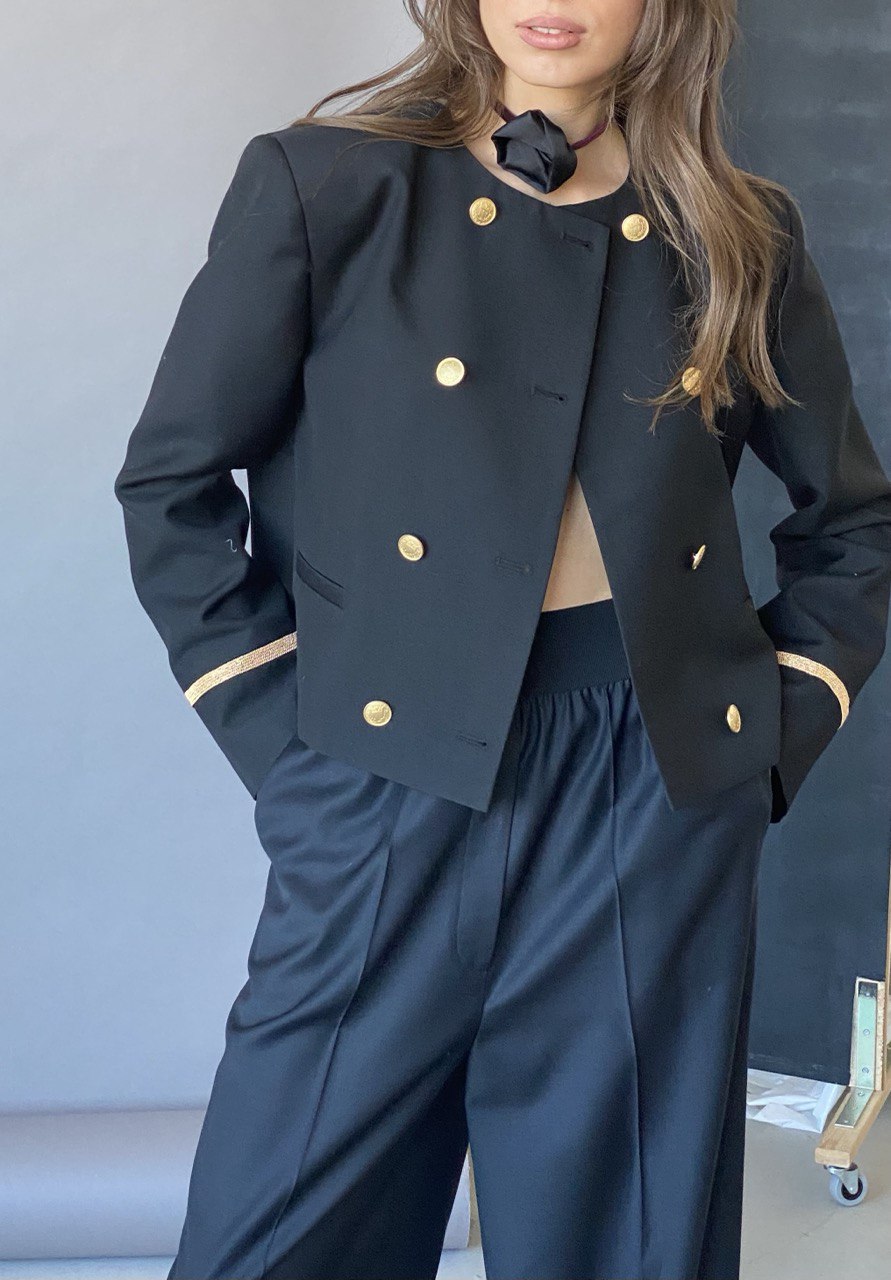 Кроп-жакет без воротника с круглым вырезом. Два ряда пуговиц и металлические детали на рукавах. Полностью на подкладе
