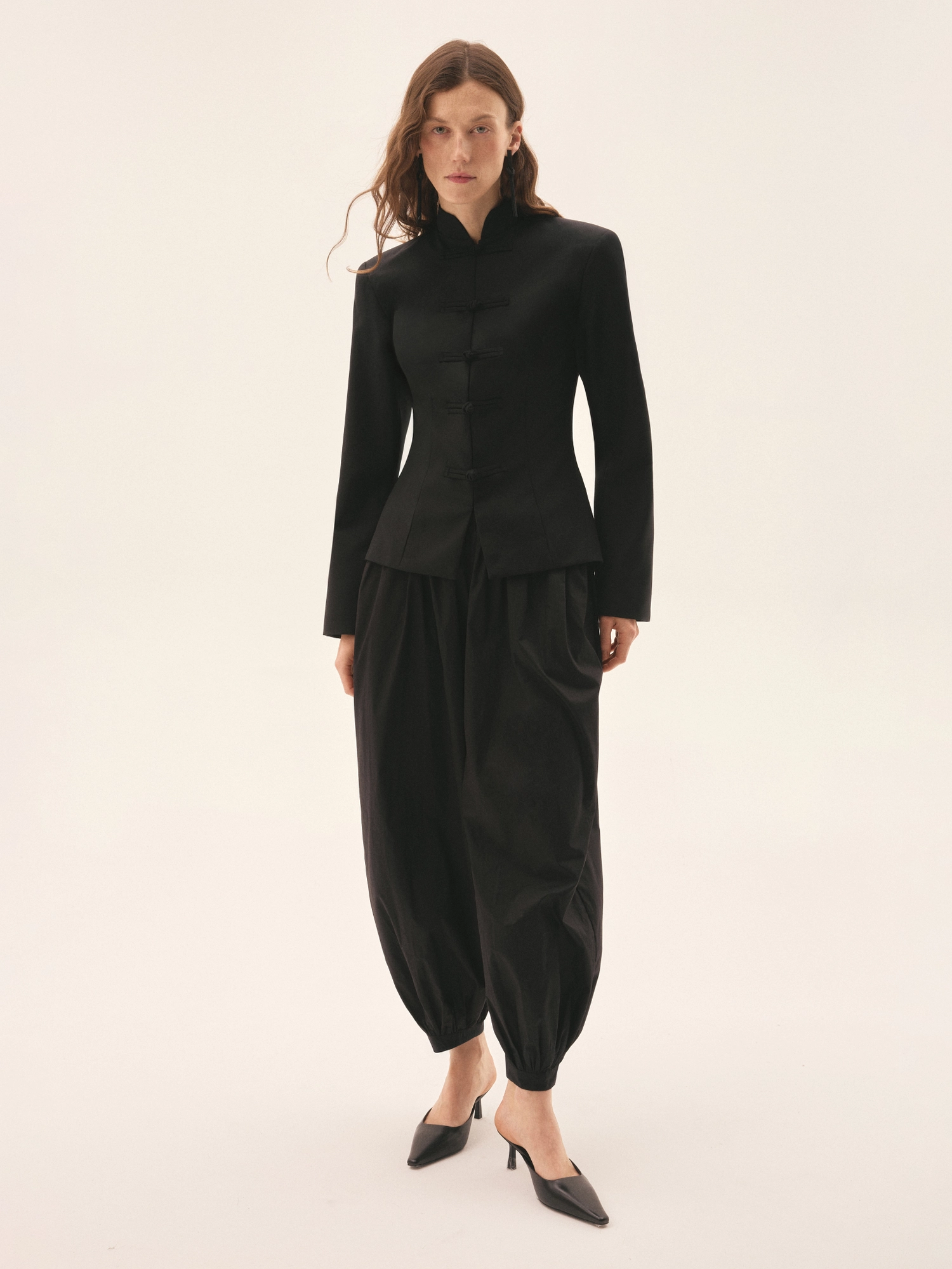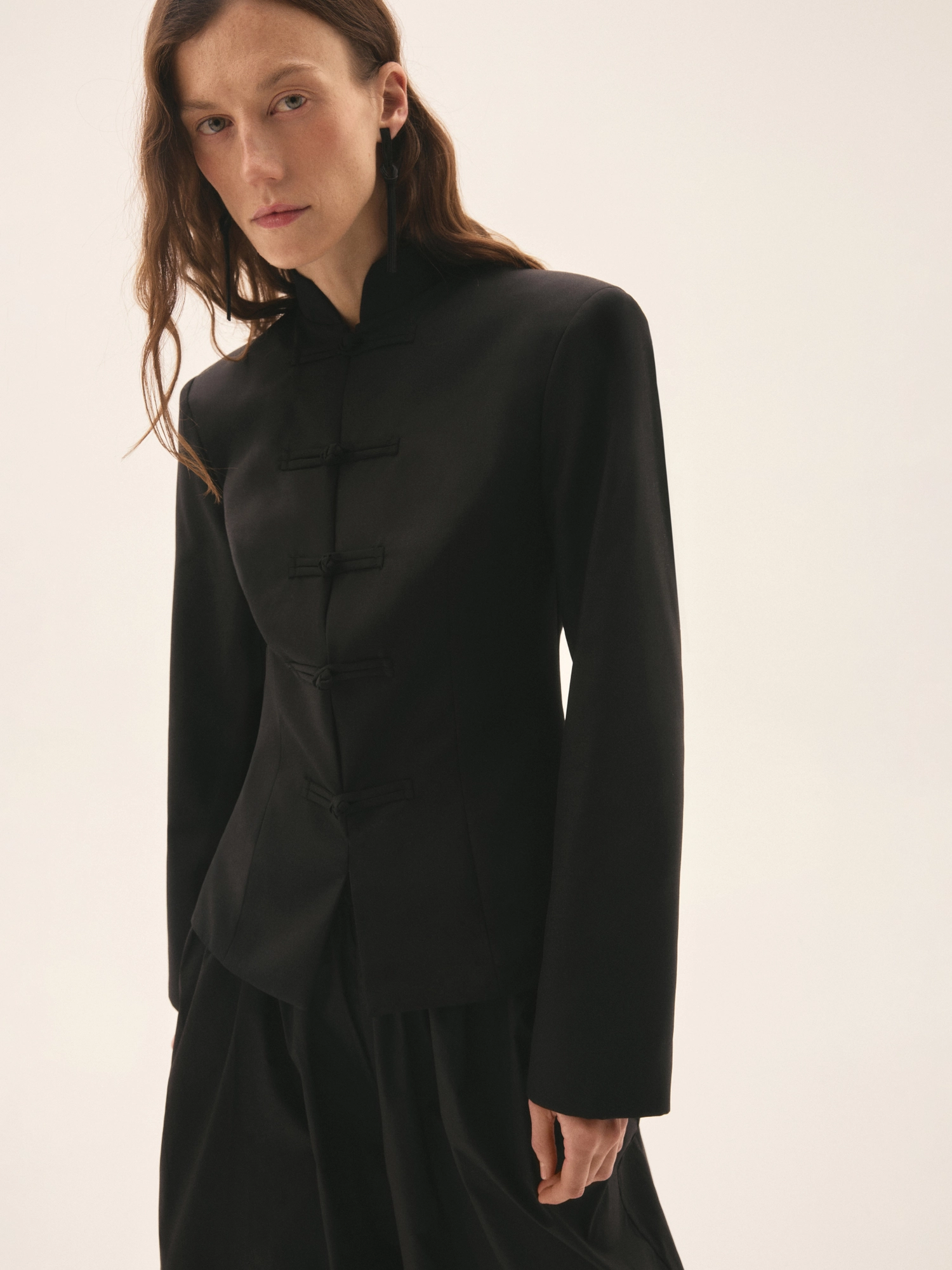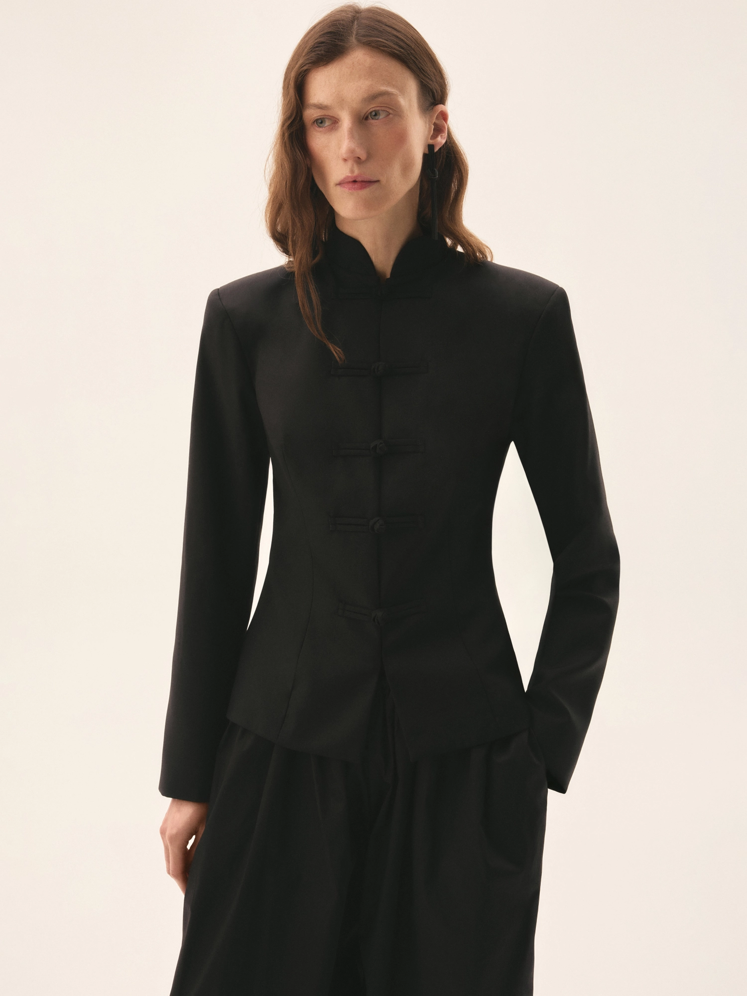 Жакет с акцентной линией плеч и приталенным кроем, создающий скульптурный силуэт. Четкая конструкция подчеркивает талию, а укороченная длина визуально вытягивает пропорции. Дополнен воротником-стойкой и традиционными японскими застежками из ткани, где каждая собрана вручную.