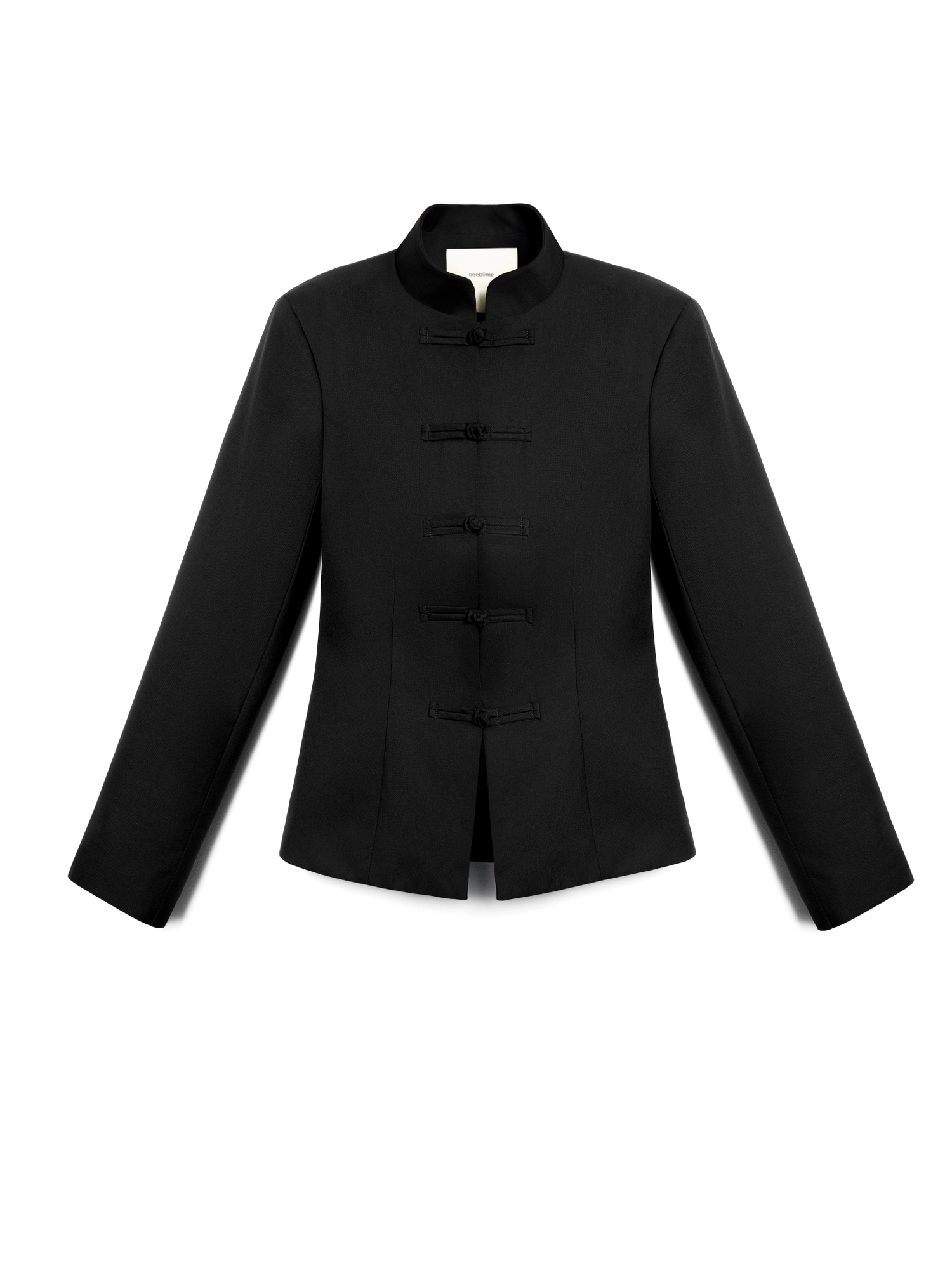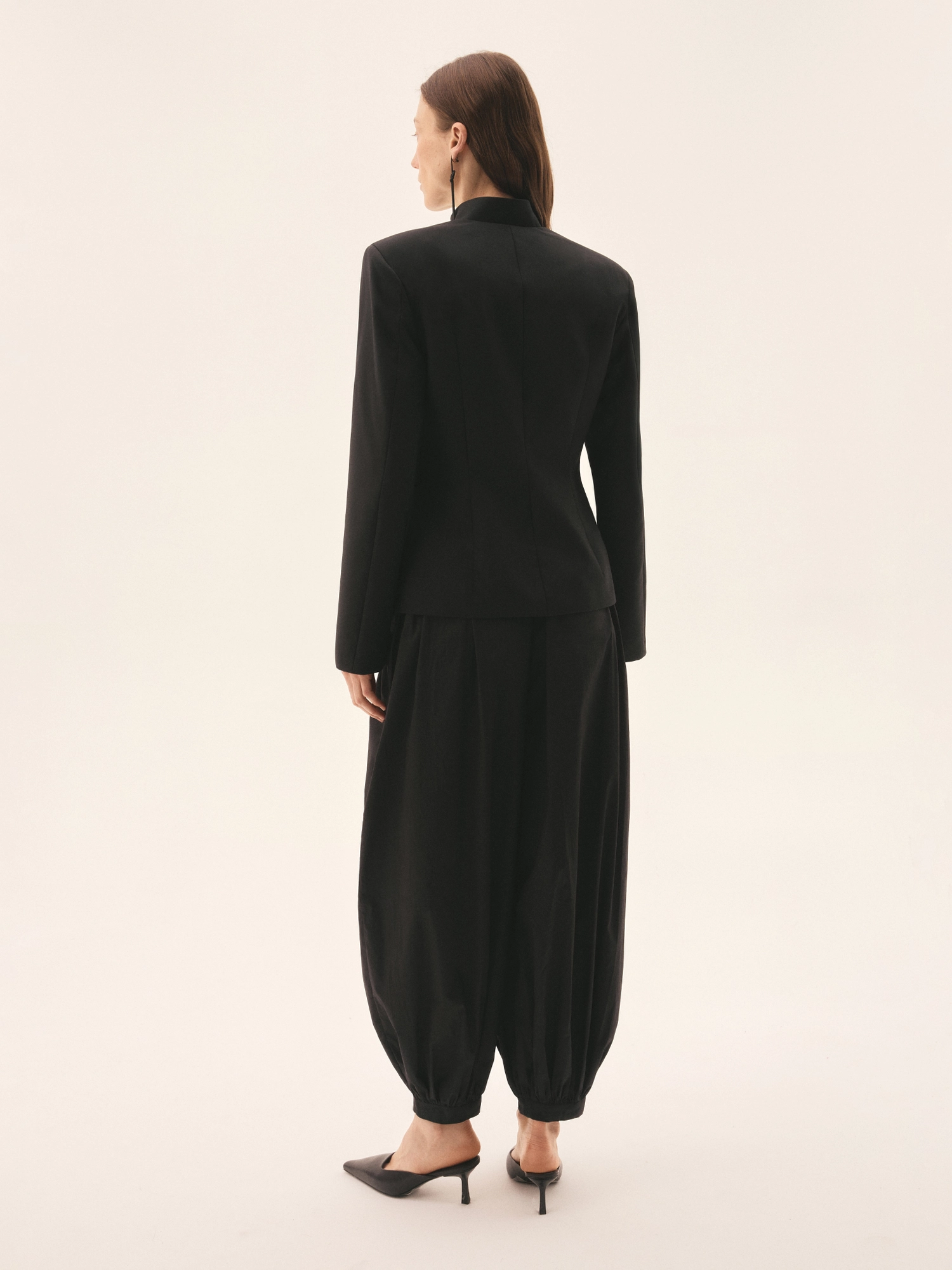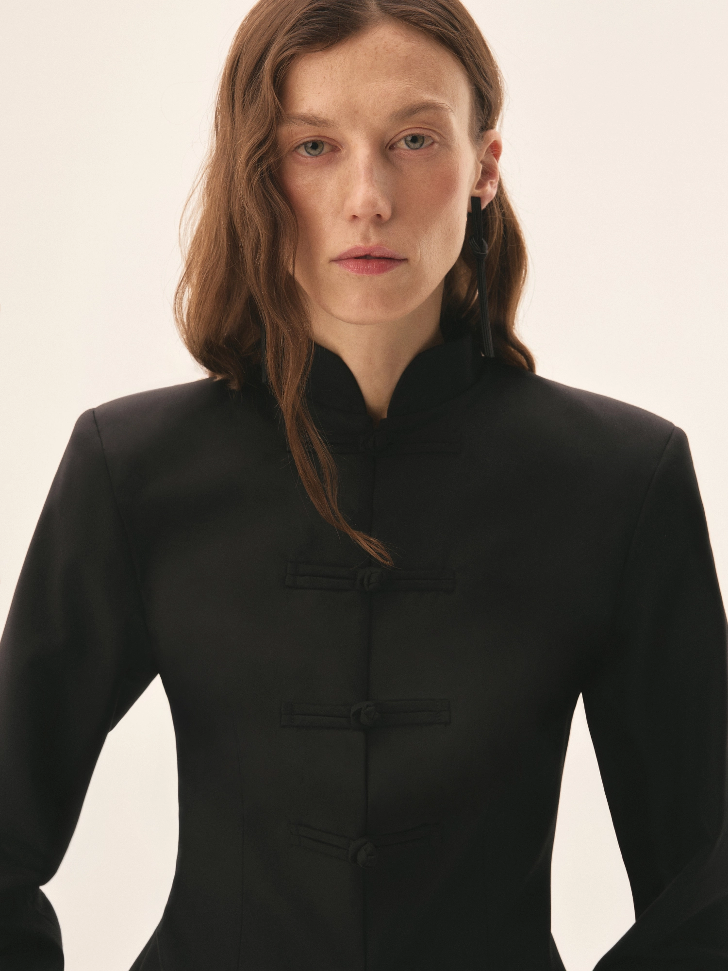 Жакет с акцентной линией плеч и приталенным кроем, создающий скульптурный силуэт. Четкая конструкция подчеркивает талию, а укороченная длина визуально вытягивает пропорции. Дополнен воротником-стойкой и традиционными японскими застежками из ткани, где каждая собрана вручную.