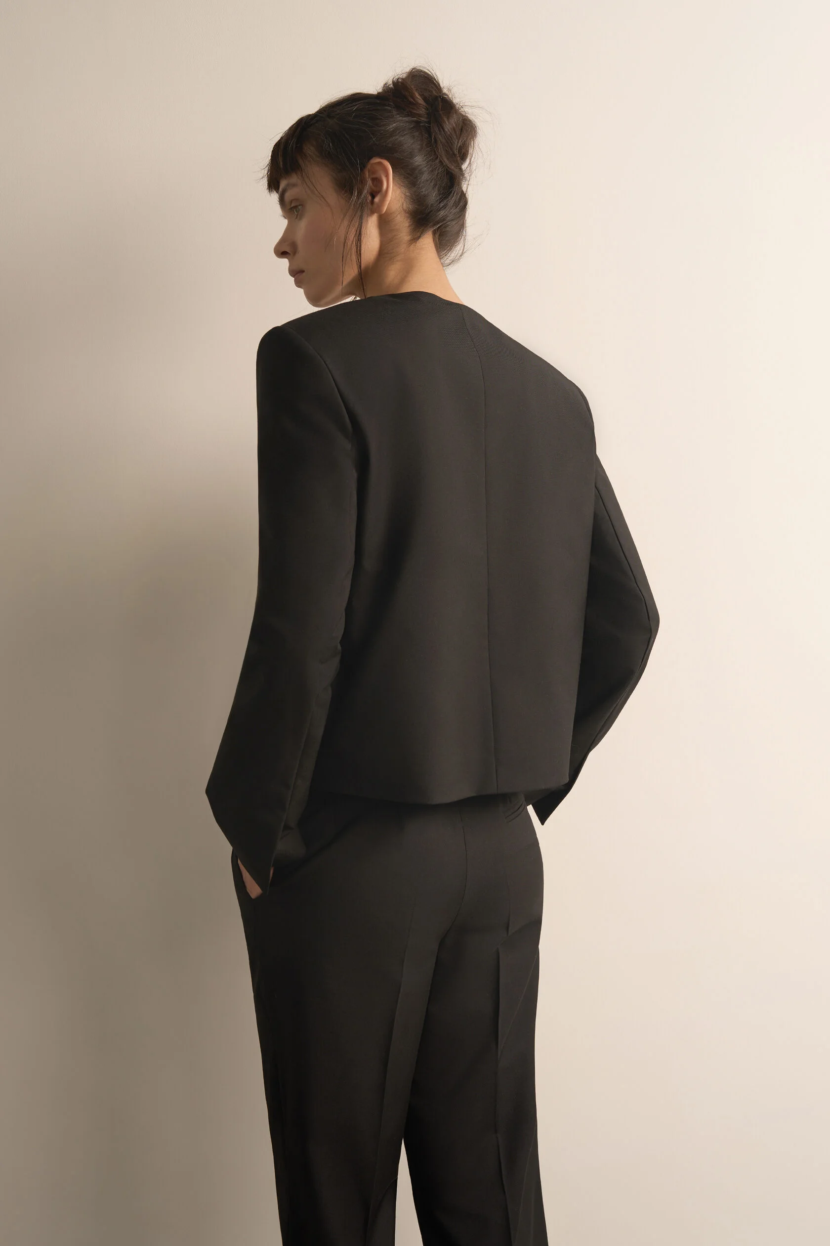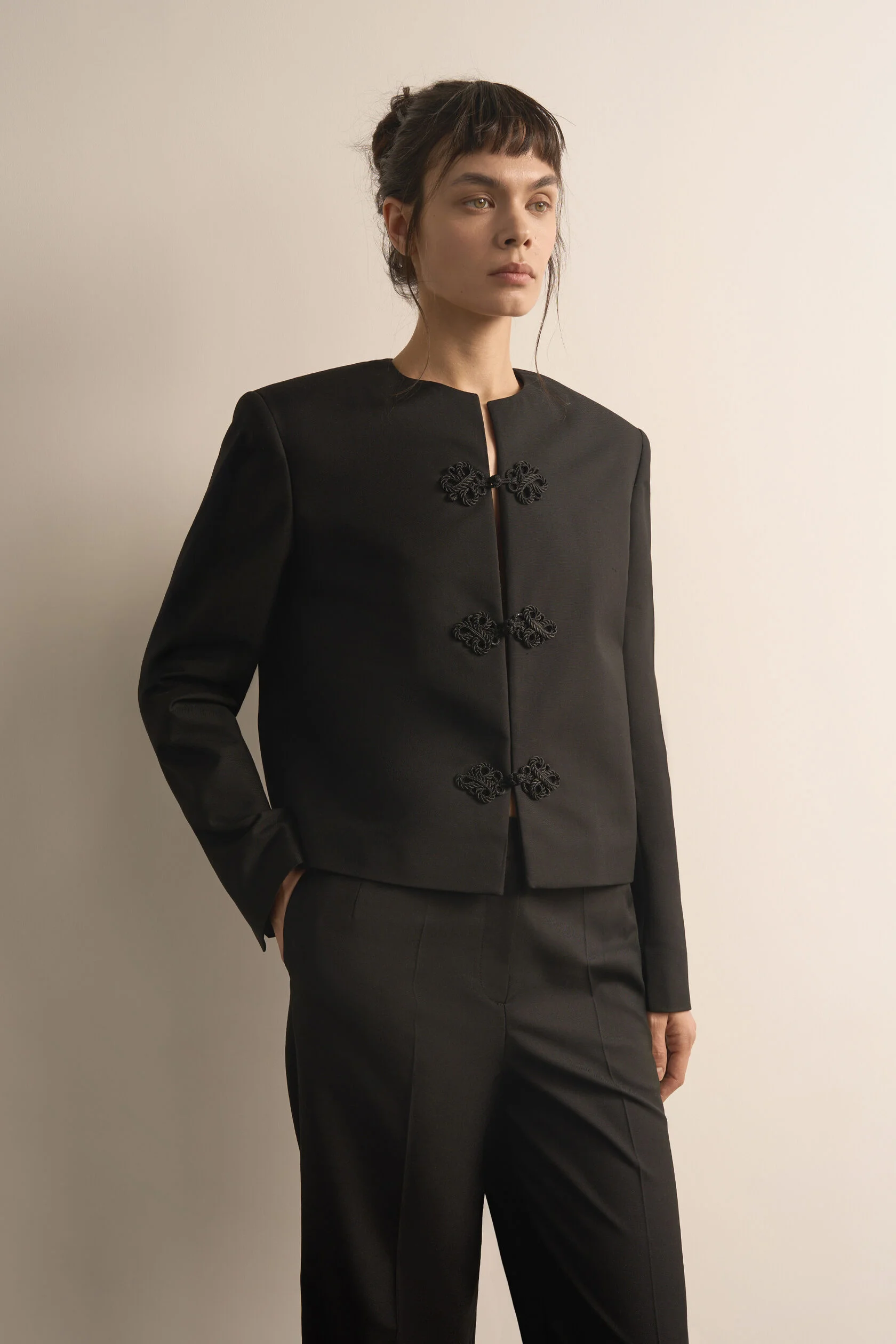 История этого изделия началась с фурнитуры. Мы влюбились в ажурную застежку-клевант с первого взгляда, но продолжить ориентальный мотив было бы слишком просто. Поэтому мы решили сыграть на контрасте — и поместить клеванты на минималистичный жакет прямого кроя. В его дизайне ничего не отвлекает внимания от заглавных деталей: у модели отсутствует воротник, а рукава — с декоративной шлицей без пуговиц.