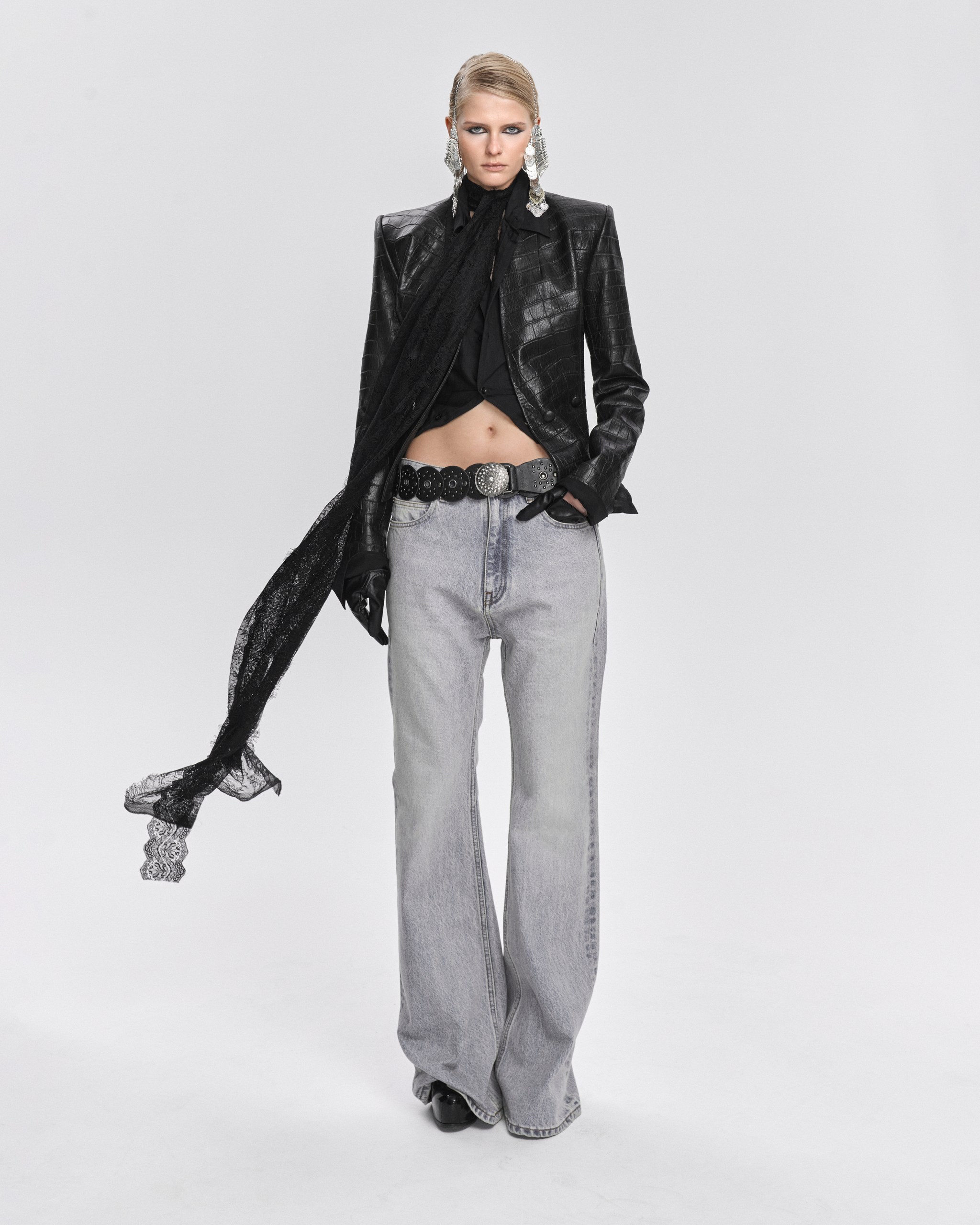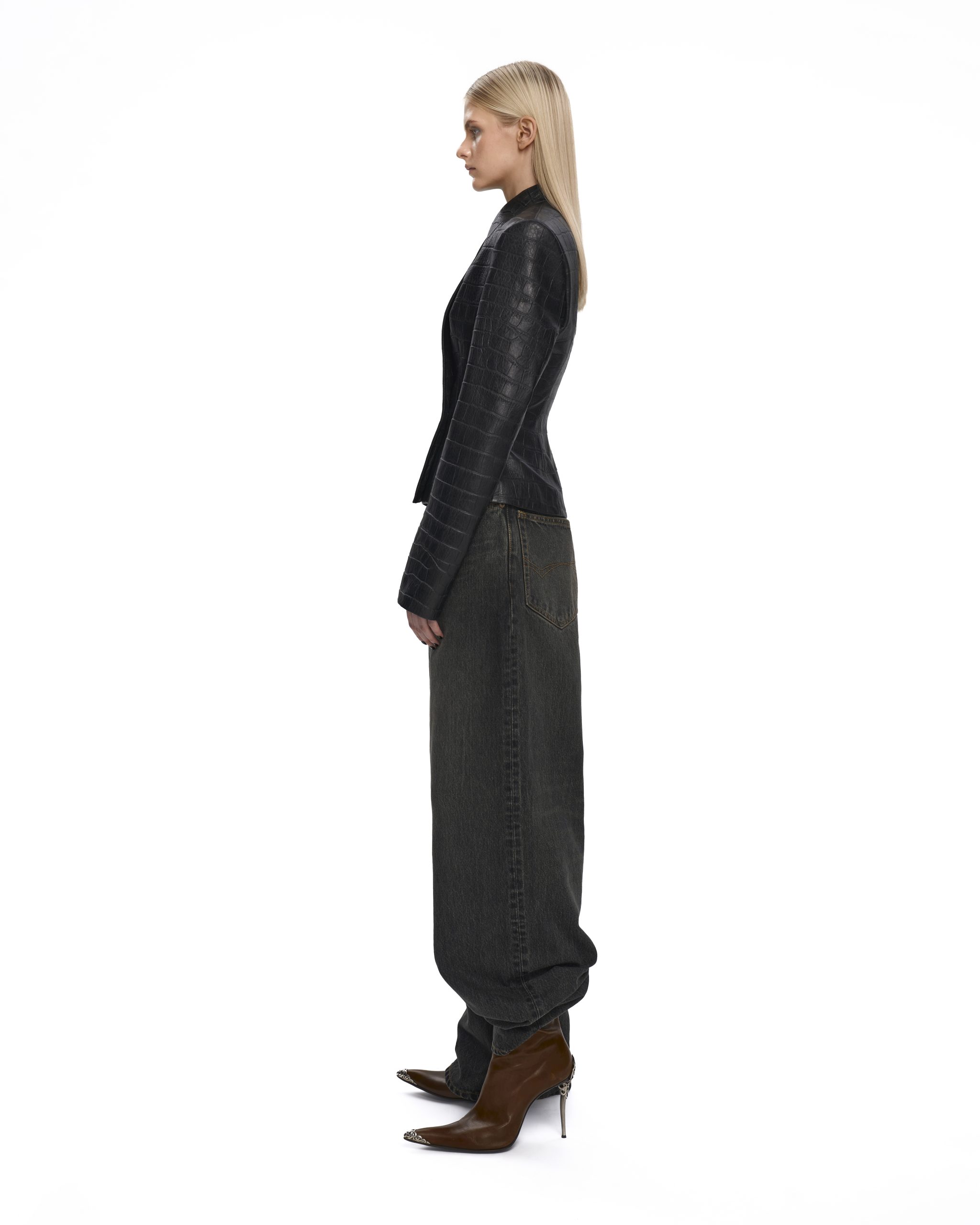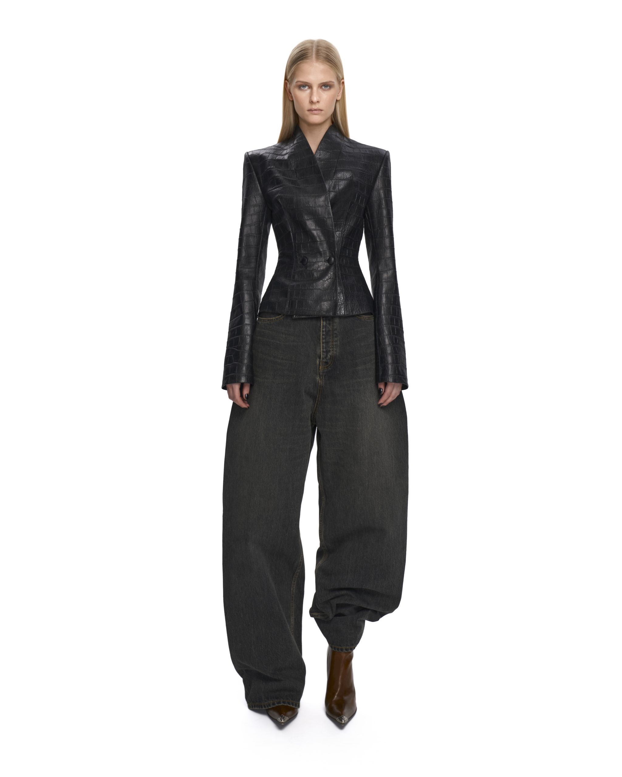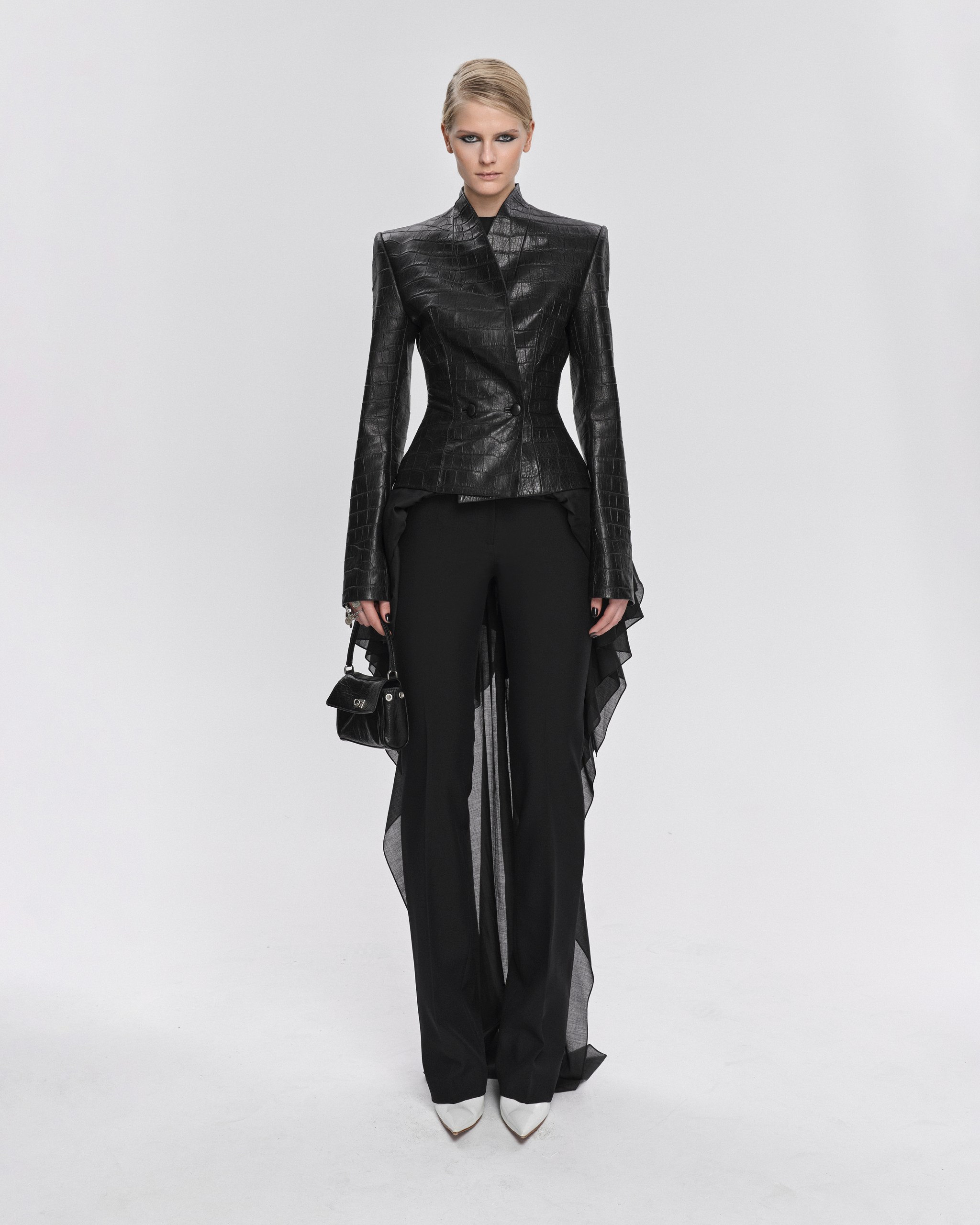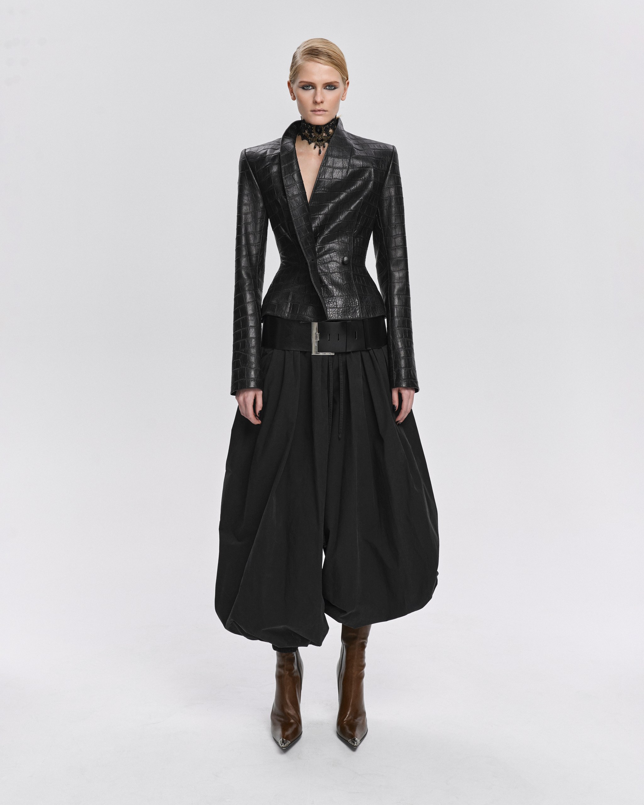 Культовым изделием новогодней капсулы является приталенный жакет, выполненный из высококачественной овечьей кожи, с изысканной имитацией тиснения кроко. Скульптурная линия плеч и точная посадка создают эффект архитектурного кроя, подчеркивая талию и демонстрируют изящный силуэт. Двубортная застежка и аккуратный воротник придают модели лаконичность и премиальный характер. Жакет становится ключевым элементом гардероба, который легко трансформируется под разные стилистические сценарии, — от современной элегантности, до выразительного драматичного стиля.