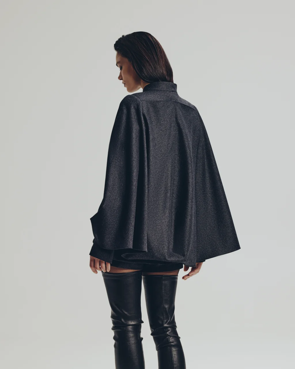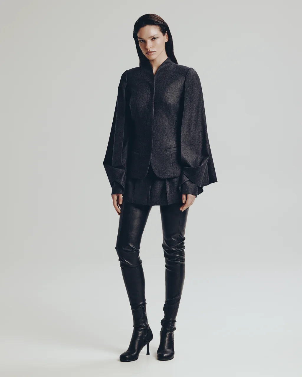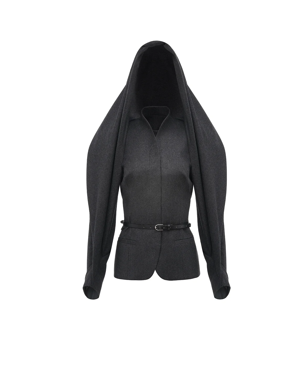 Жакет выполнен из премиальной итальянской шерсти и кашемира, который изготавливается из тонкого волокна особых пород коз. Тонкое волокно позволяет ткани лежать мягкими фалдами, при этом не терять фактуру и в то же время держать форму