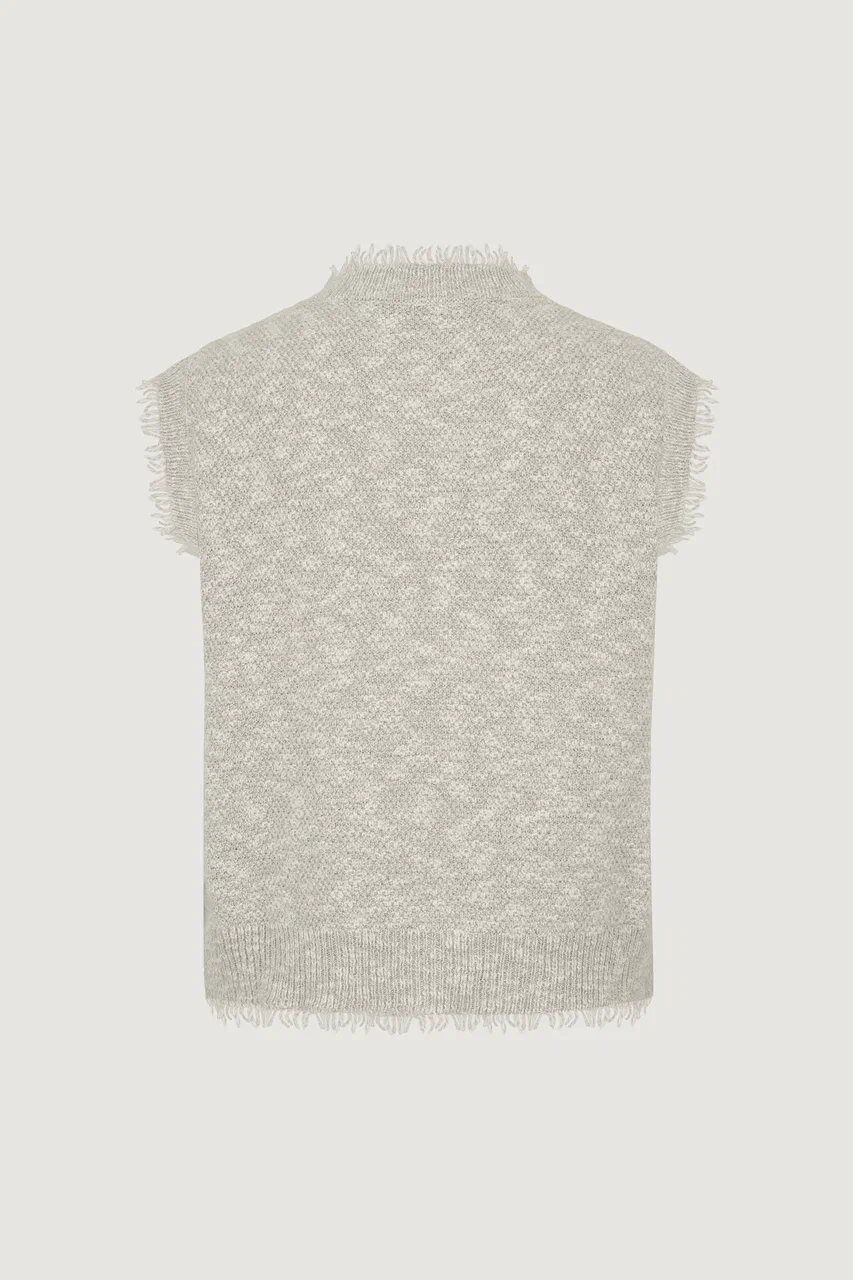 Минималистичный жилет из хлопковой меланжевой пряжи. Необработанные края добавляют изделию лёгкую расслабленность, сохраняя аккуратный и собранный вид. Мягкая текстура и нейтральный оттенок делают модель универсальной для повседневного гардероба.