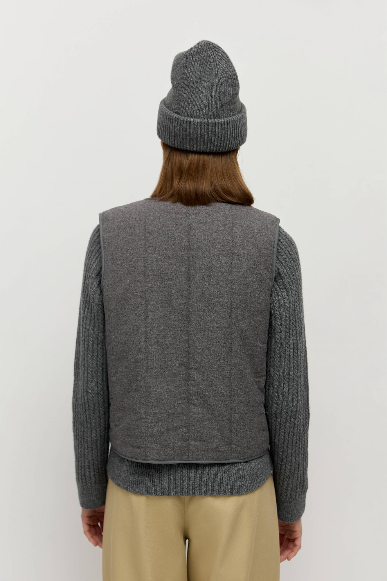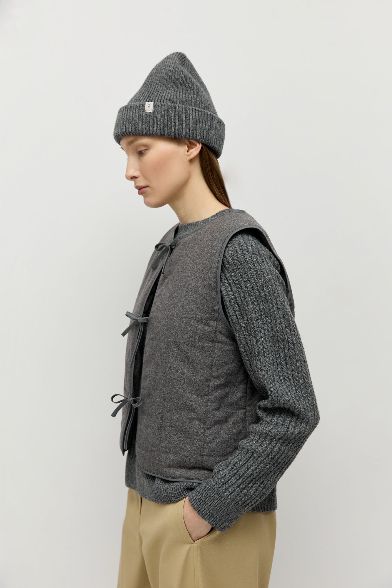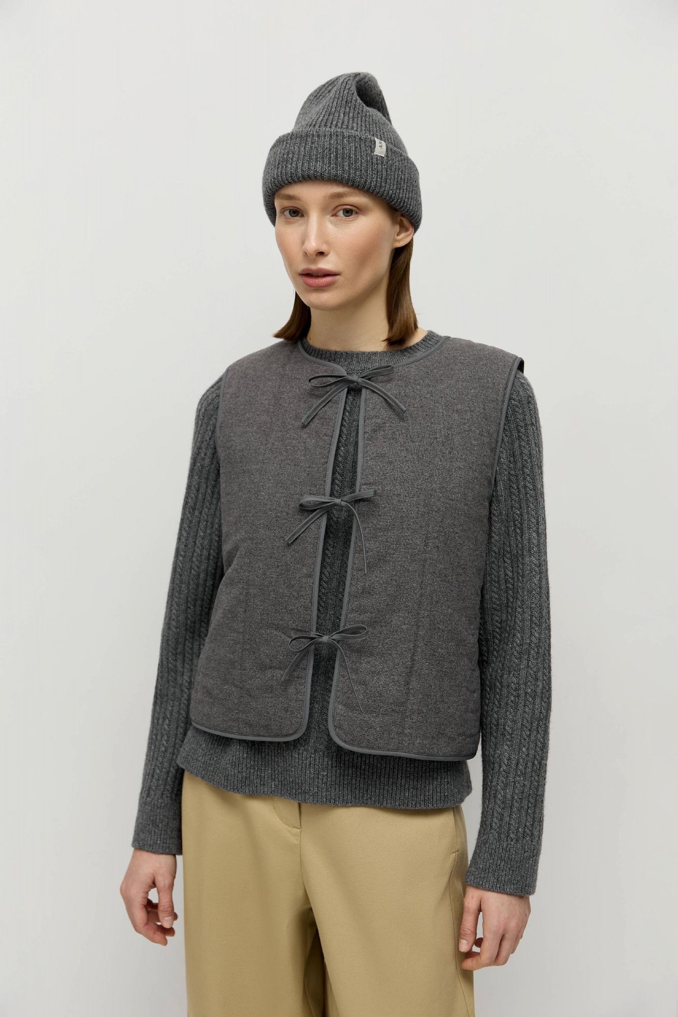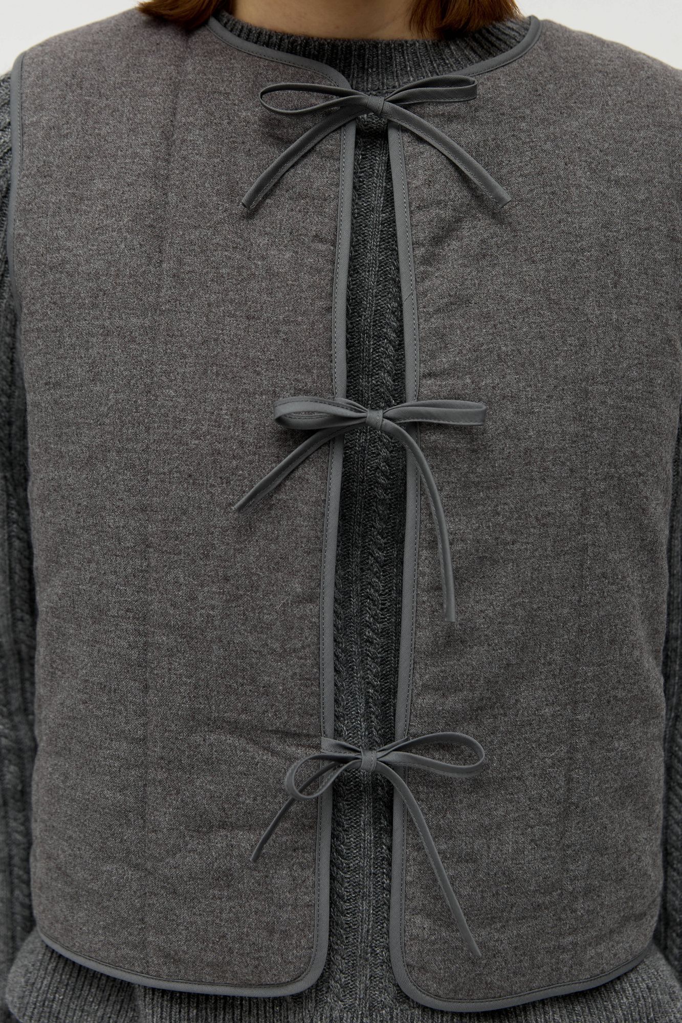 Жилет сшит из фланели, внутри — высокотехнологичный утеплитель, обладающий свойствами эко-пуха. Застежка на завязки в несколько рядов, минималистичная вертикальная стежка.